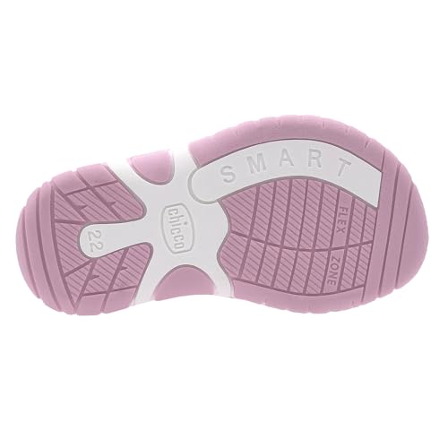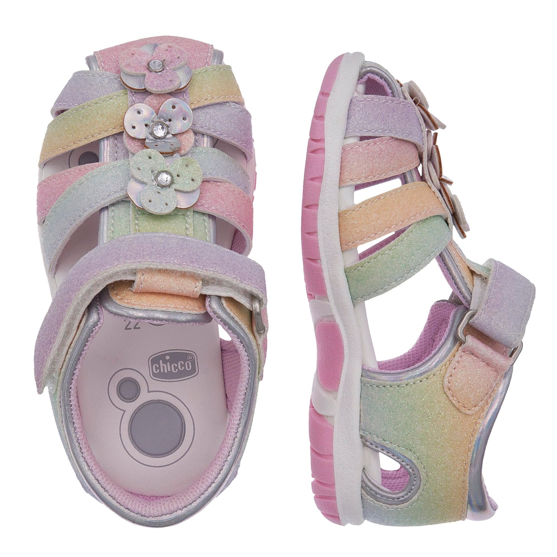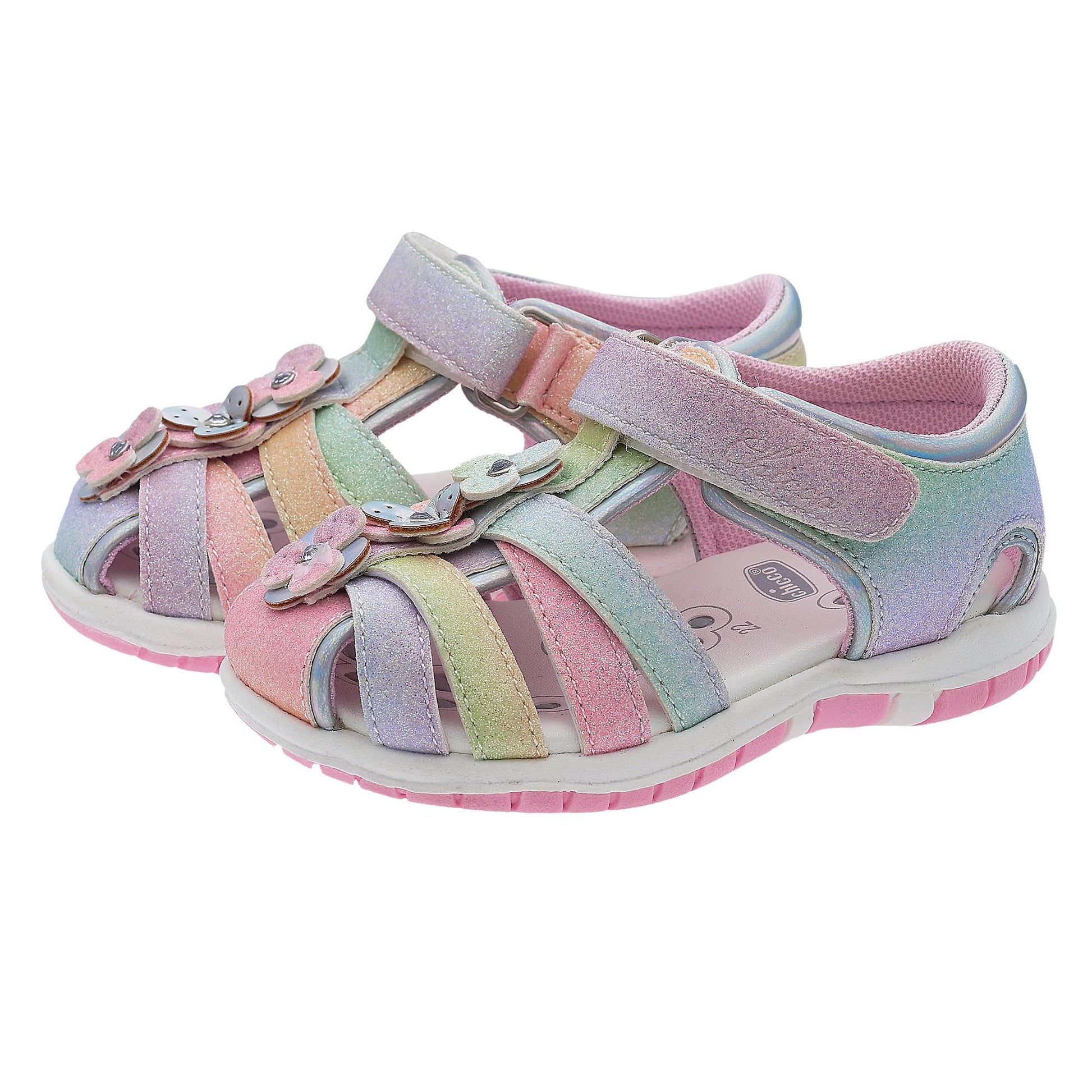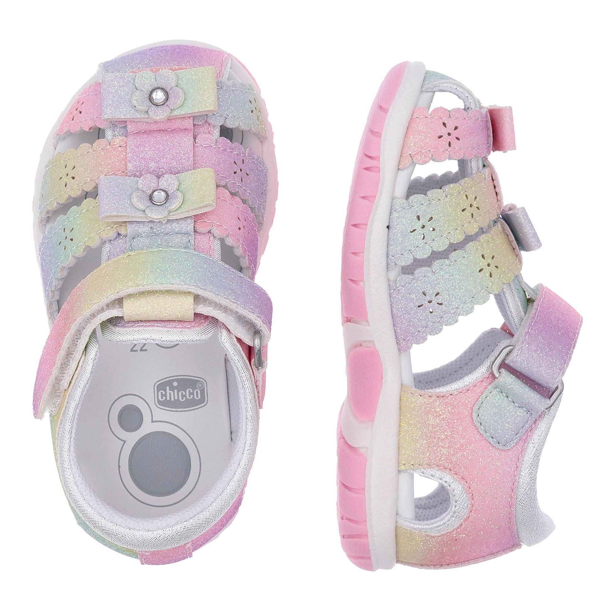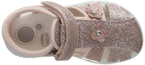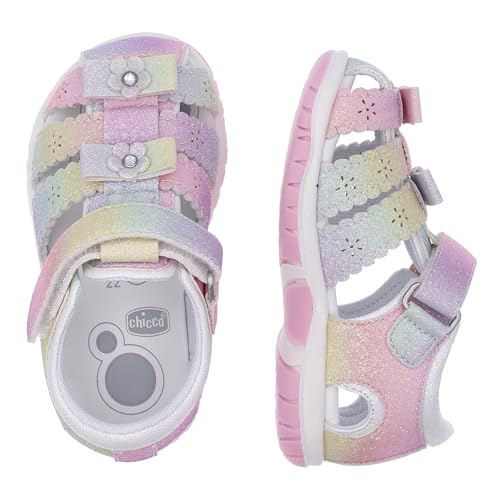 Chicco semi-open glitter sandal with velcro closure. Pink glitter sandal from Chicco with floral appliqués, closed toe and heel. Suitable for everyday wear. Chicco shoes are comfortable, flexible, lightweight, breathable, and practical. The shoes feature a "Chicco Natural Footprint" insole: an insole with varying thicknesses that stimulates the natural formation of the foot arch. Size 20 corresponds to a foot length of 123 mm.