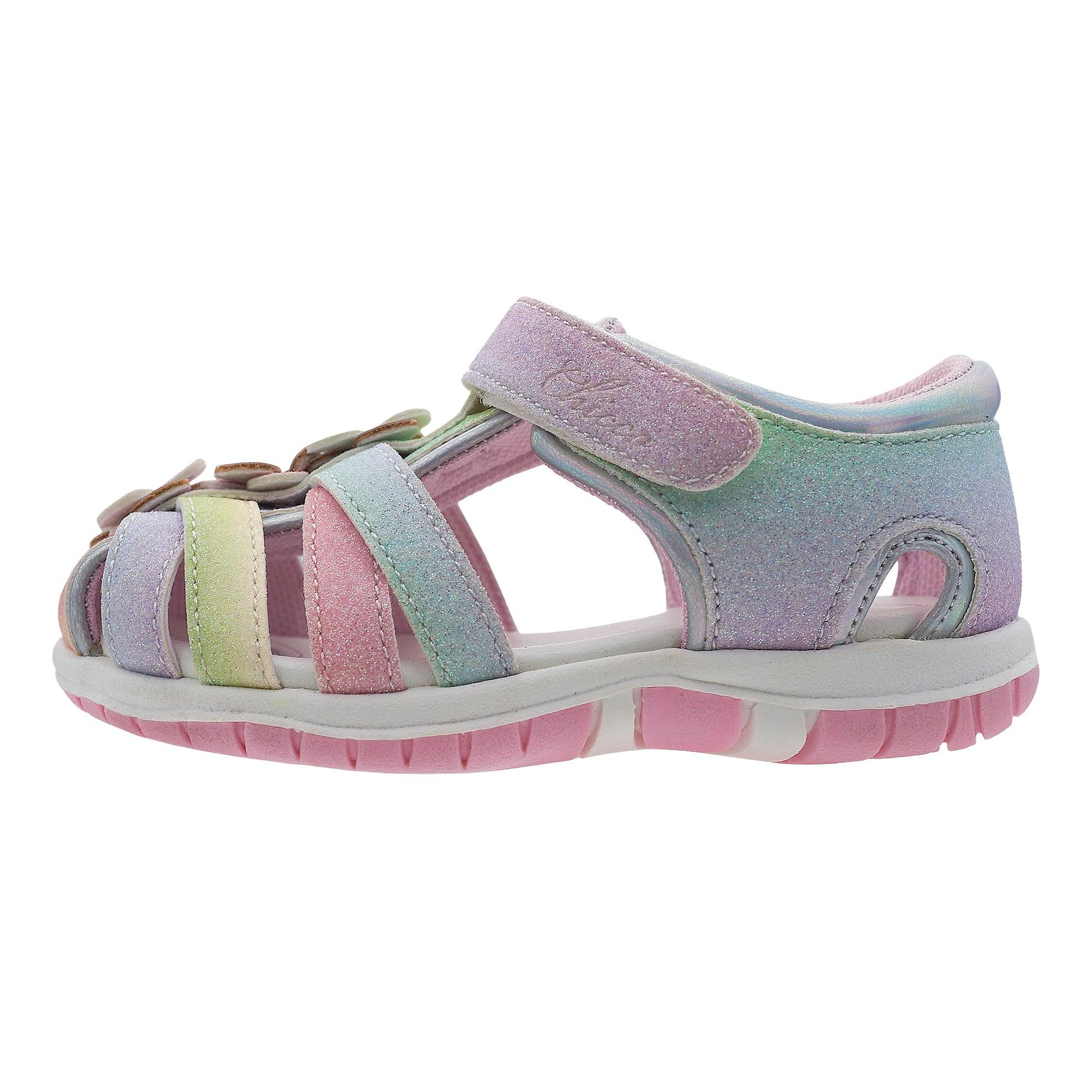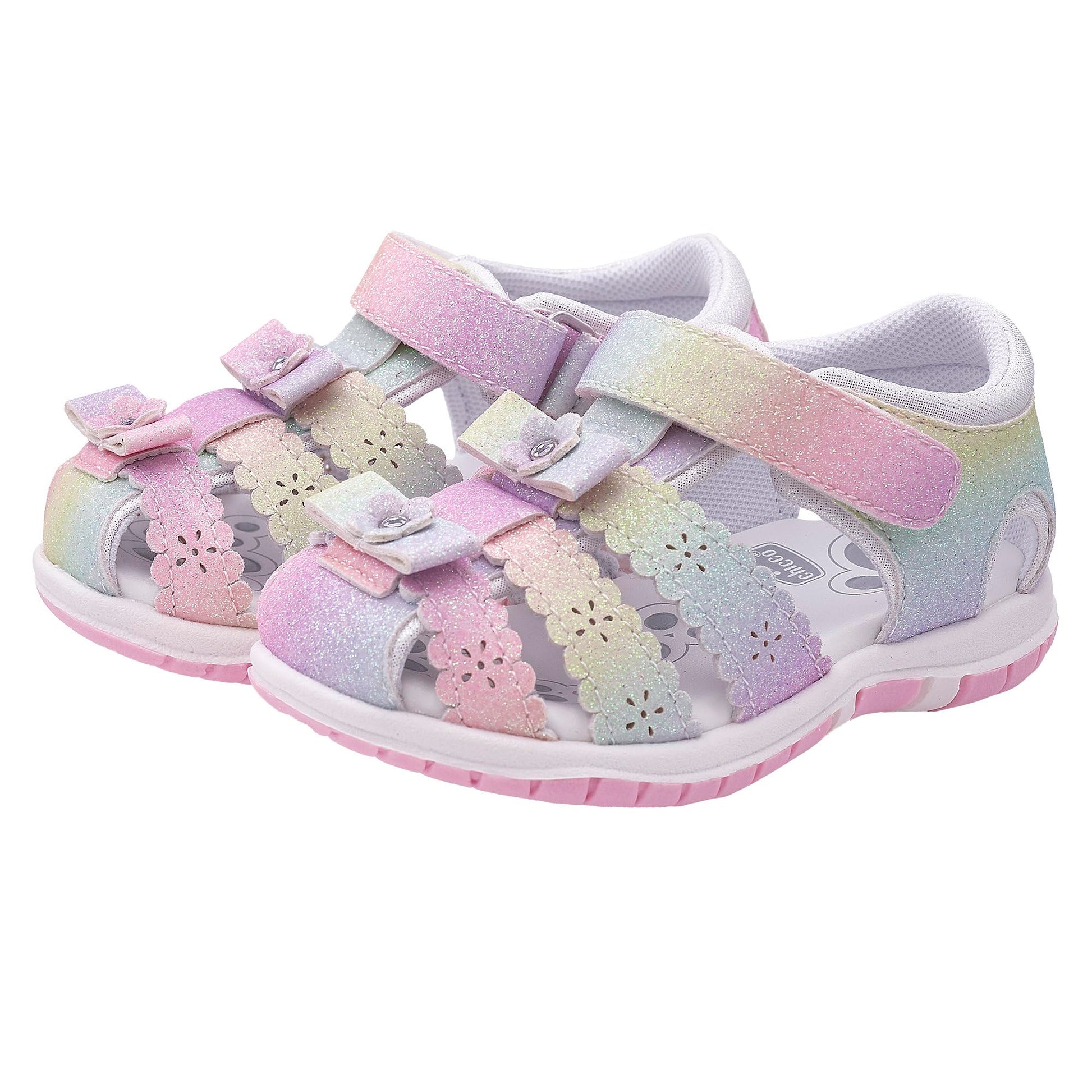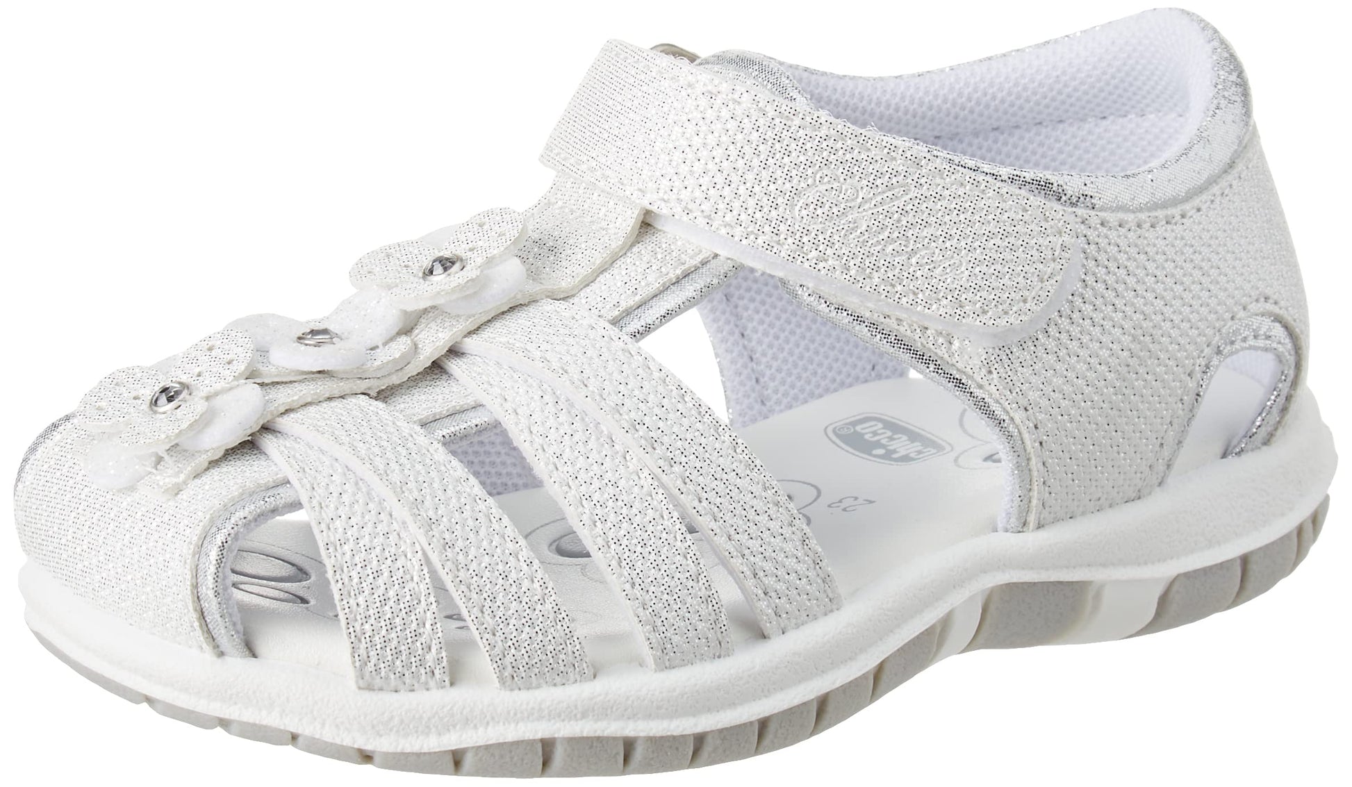 Chicco semi-open glitter sandal with velcro closure. Pink glitter sandal from Chicco with floral appliqués, closed toe and heel. Suitable for everyday wear. Chicco shoes are comfortable, flexible, lightweight, breathable, and practical. The shoes feature a "Chicco Natural Footprint" insole: an insole with varying thicknesses that stimulates the natural formation of the foot arch. Size 20 corresponds to a foot length of 123 mm.