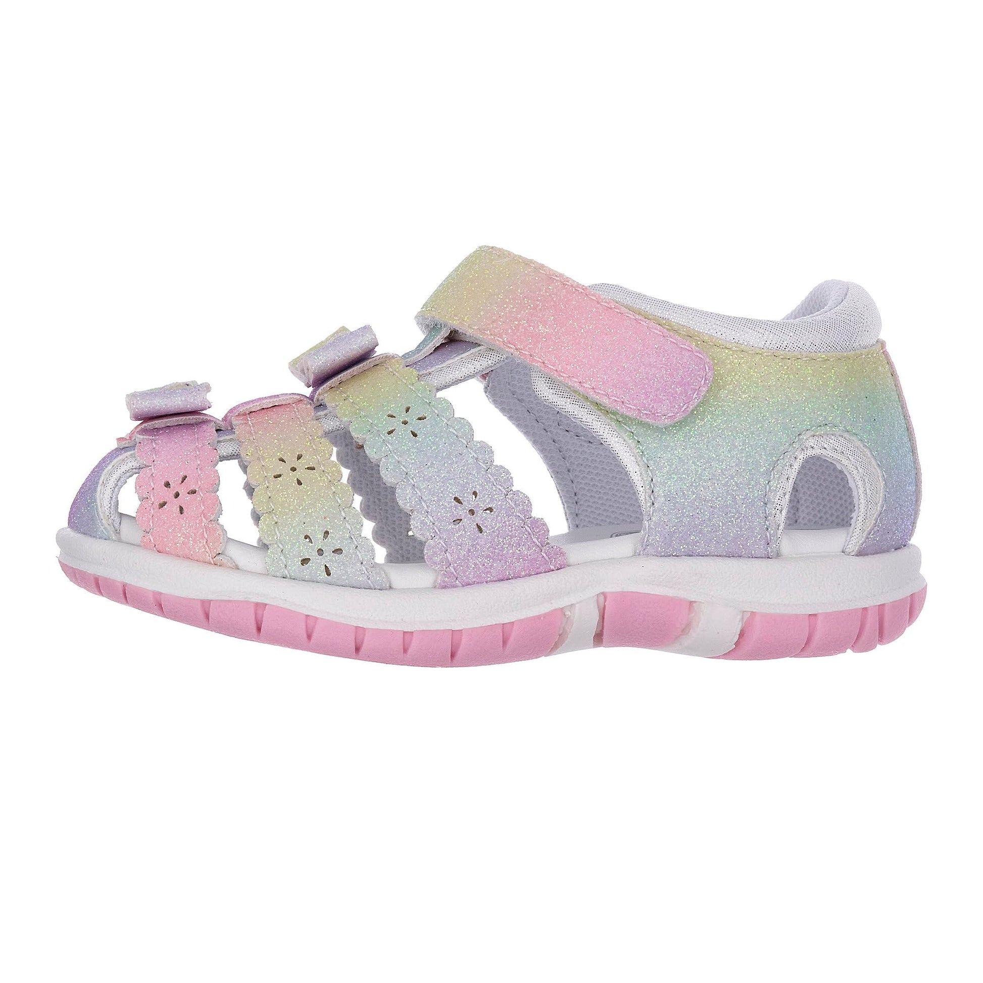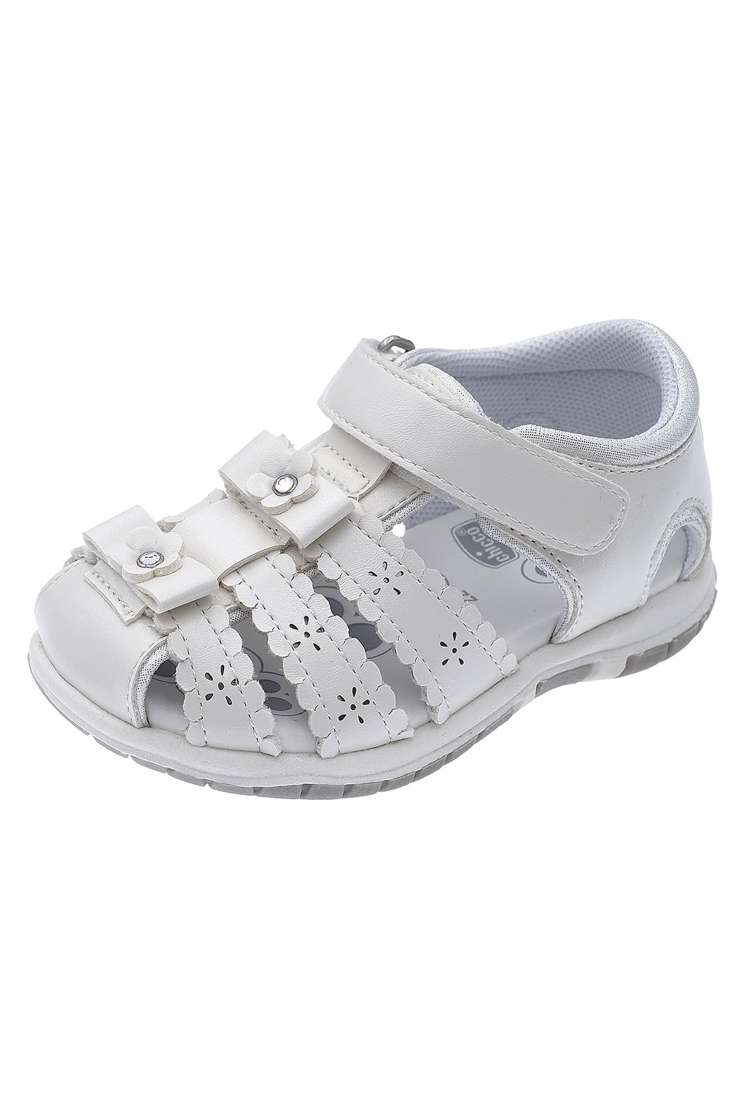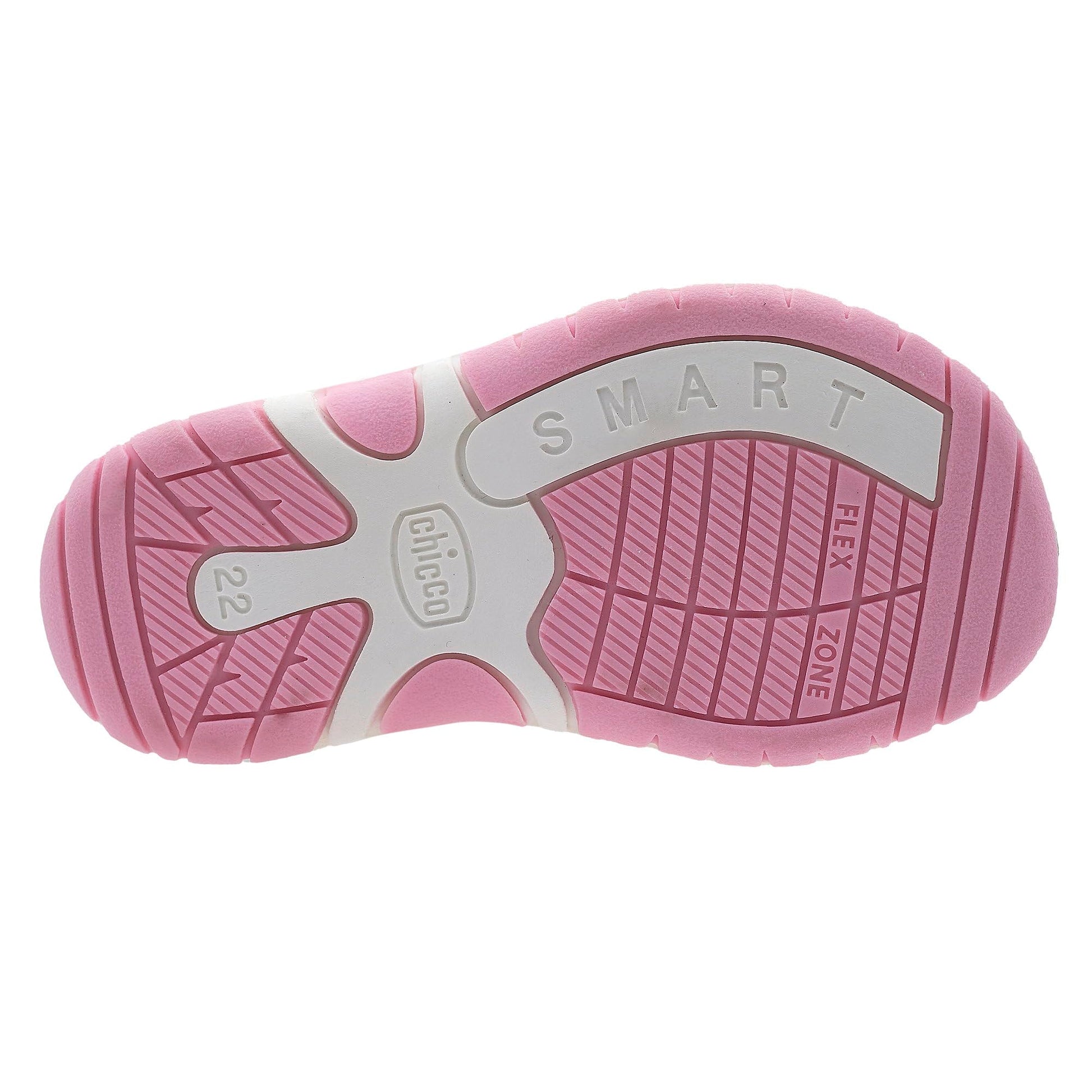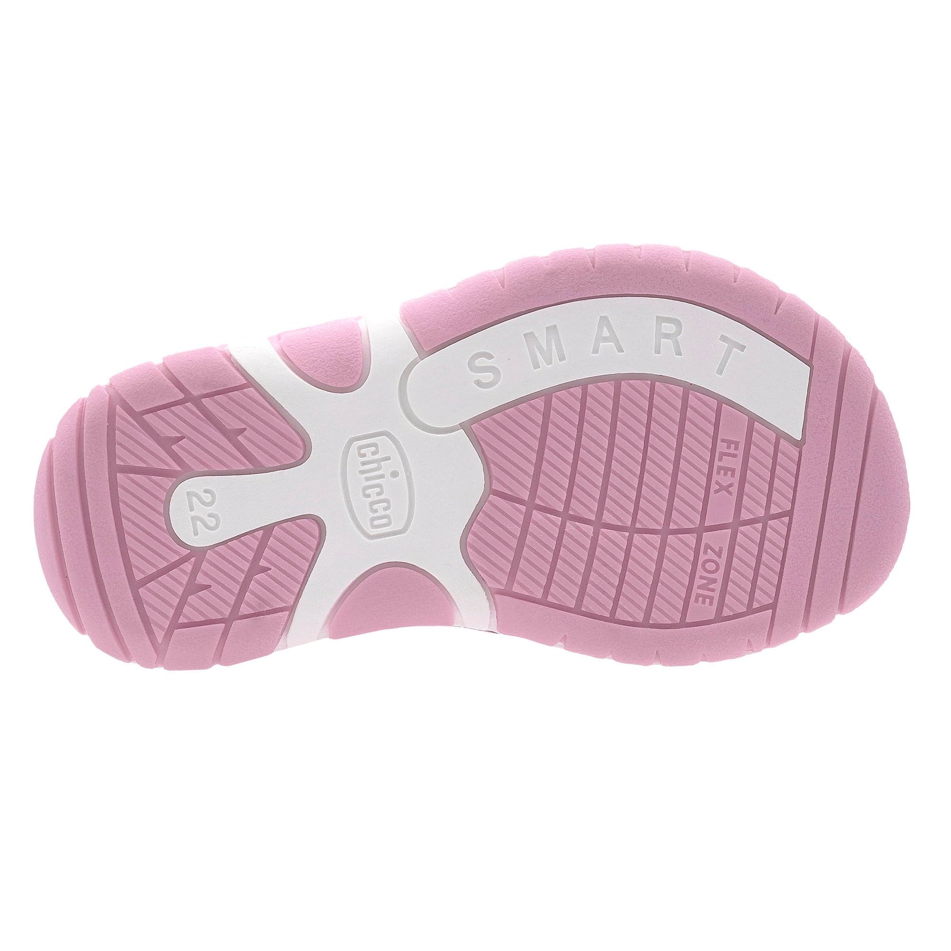 Chicco semi-open glitter sandal with velcro closure. Pink glitter sandal from Chicco with floral appliqués, closed toe and heel. Suitable for everyday wear. Chicco shoes are comfortable, flexible, lightweight, breathable, and practical. The shoes feature a "Chicco Natural Footprint" insole: an insole with varying thicknesses that stimulates the natural formation of the foot arch. Size 20 corresponds to a foot length of 123 mm.