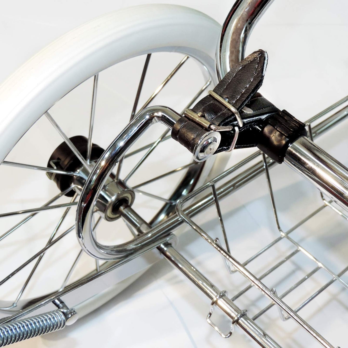 • Sturdy chrome-plated metal frame with height-adjustable handle and rocking-soft leather strap suspension