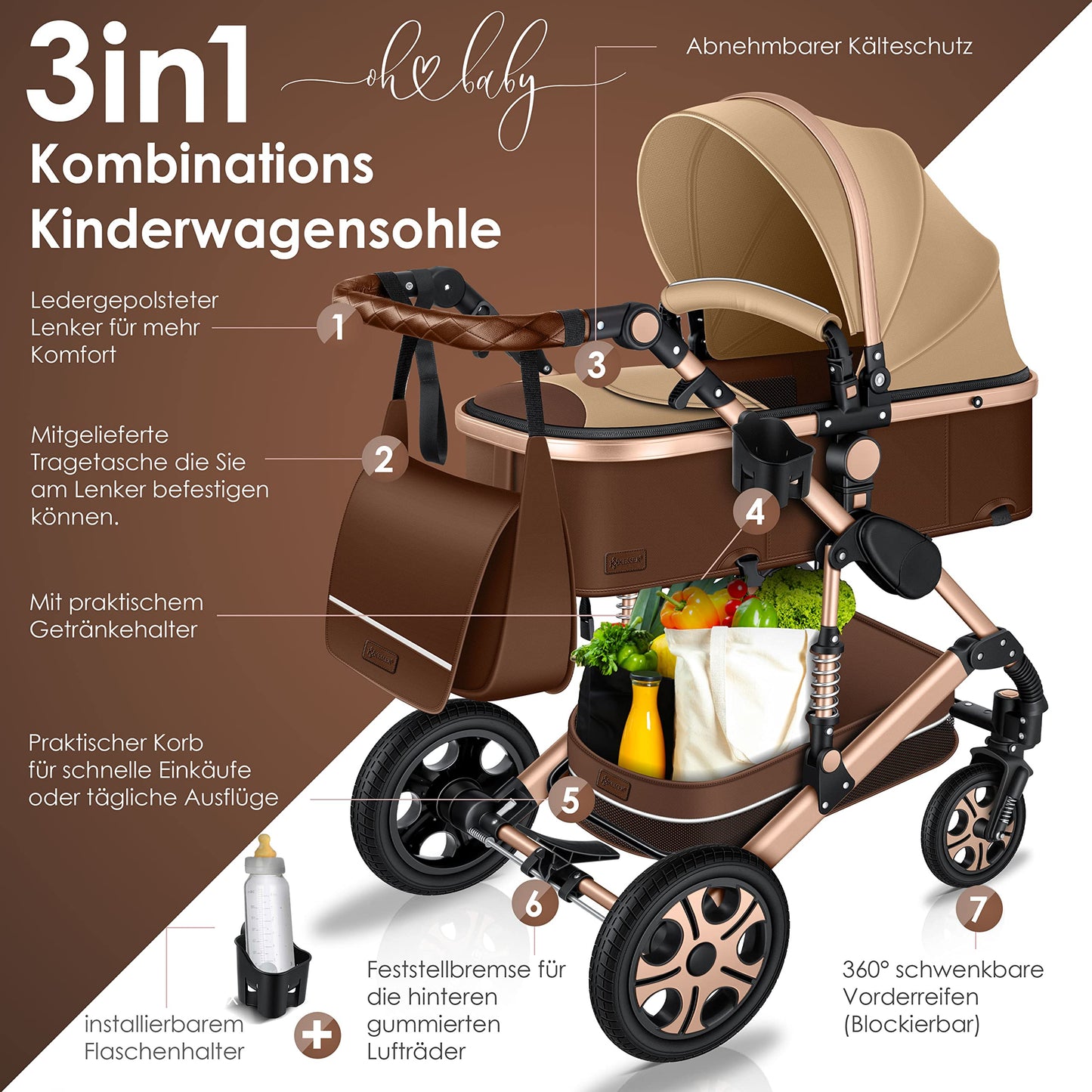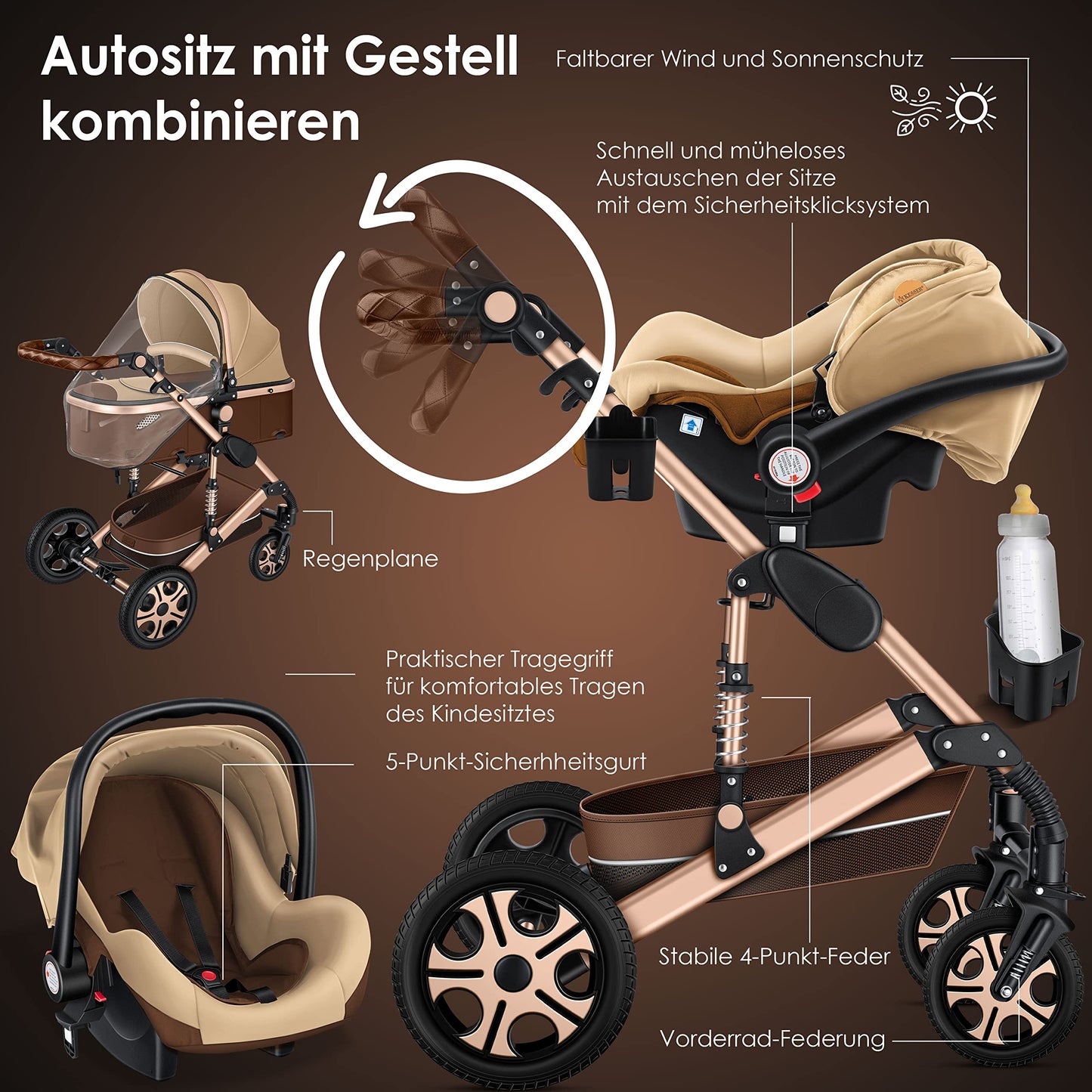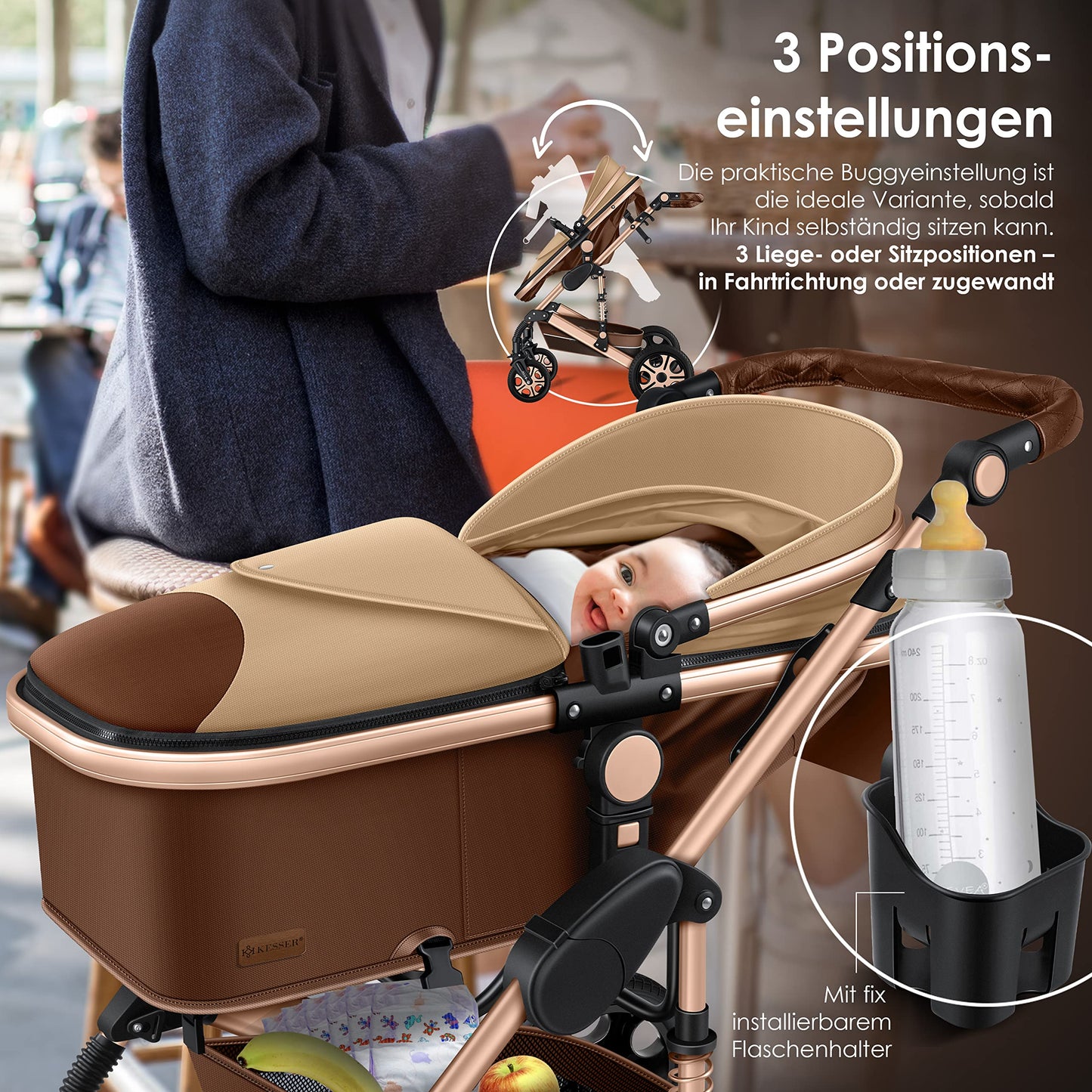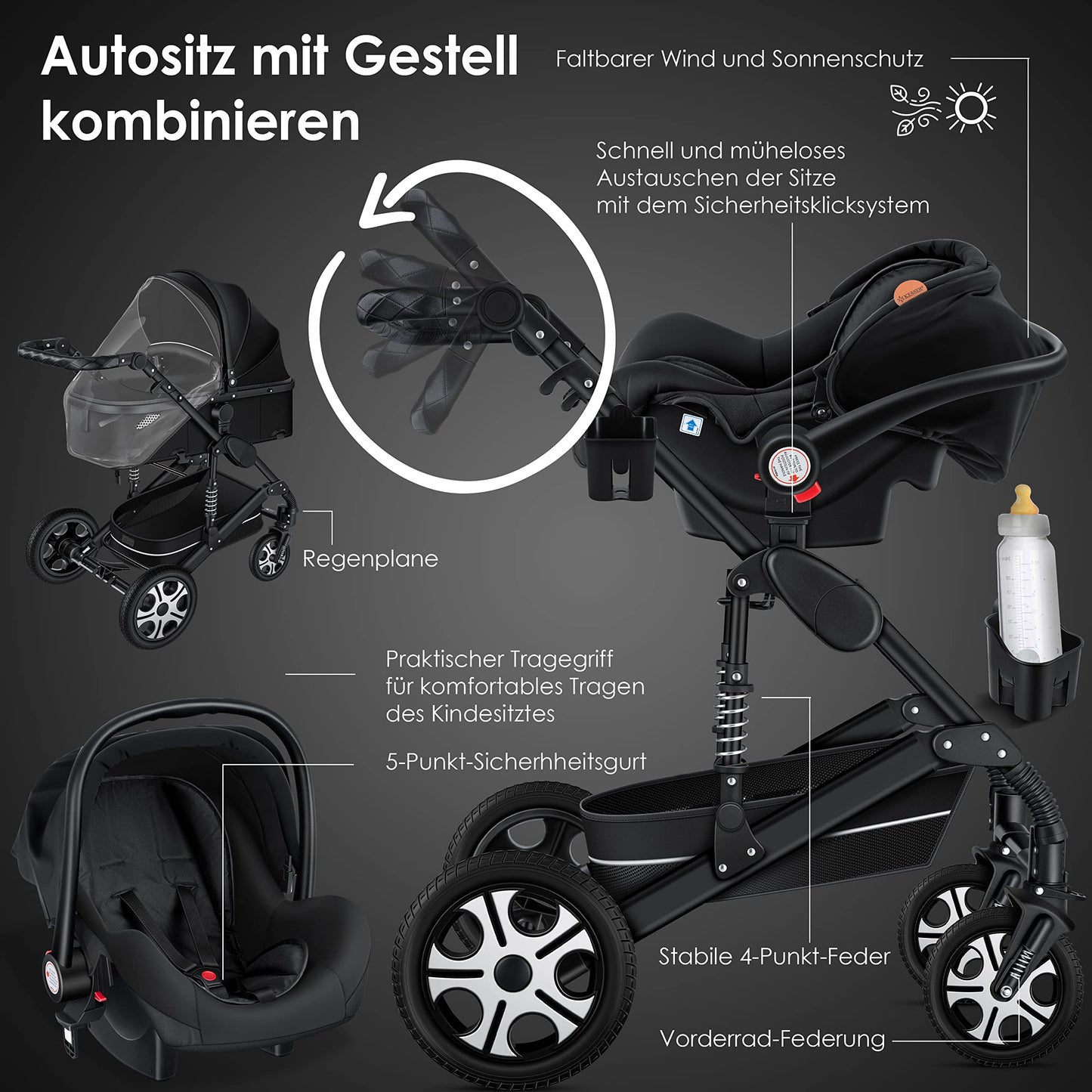 • 𝐒𝐏𝐎𝐑𝐓𝐒𝐈𝐓𝐙: As soon as your child can sit independently, the buggy setting is the perfect companion. In just a few simple steps, you can convert the stroller into a buggy. You can choose between three positions for sitting and lying down. You can also decide which direction your child will face. The carrycot can be converted into a sports seat in just a few seconds. This 3-in-1 combo stroller adapts perfectly to your child's needs.