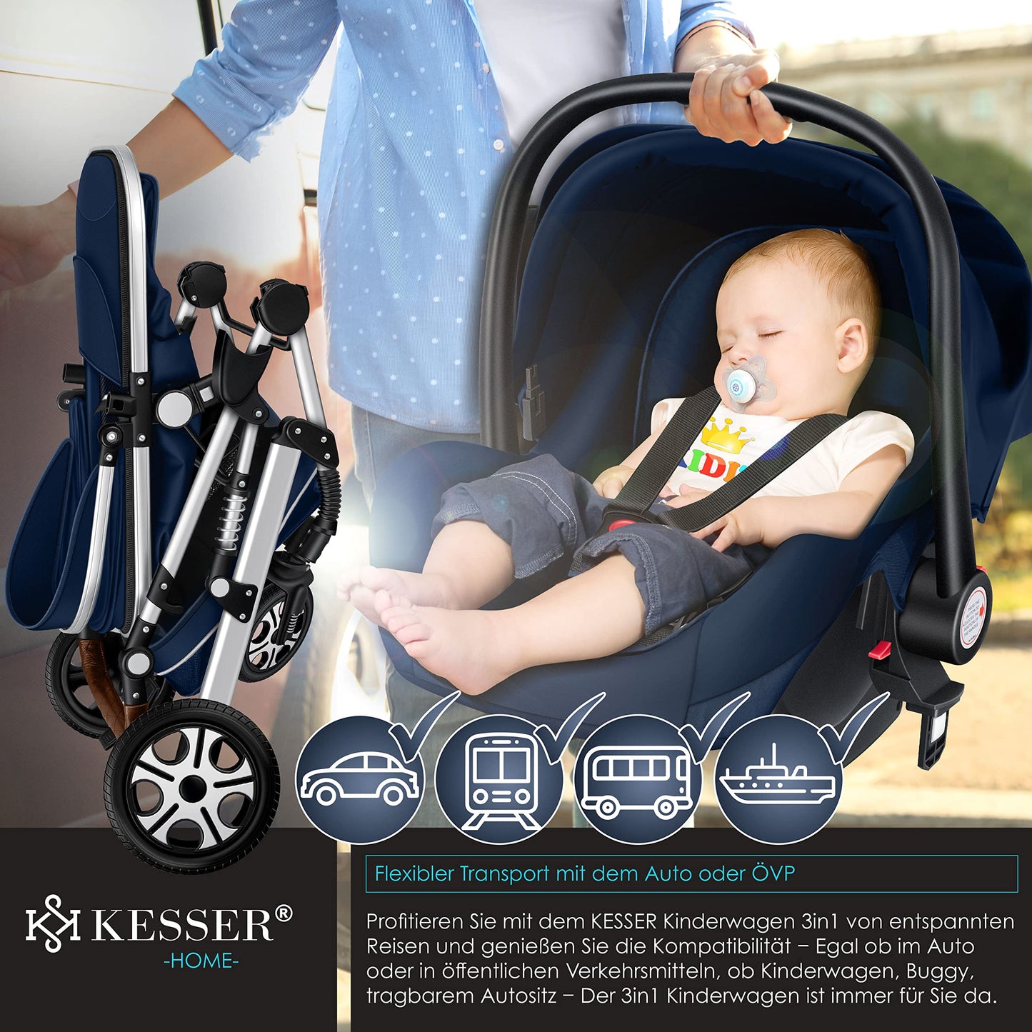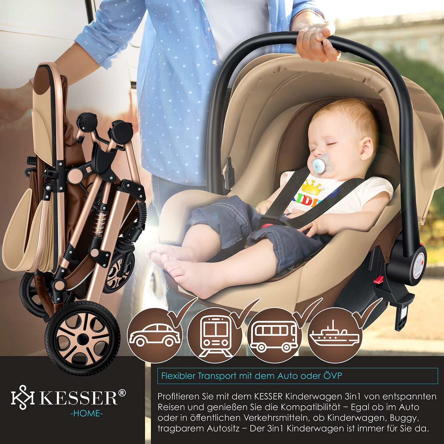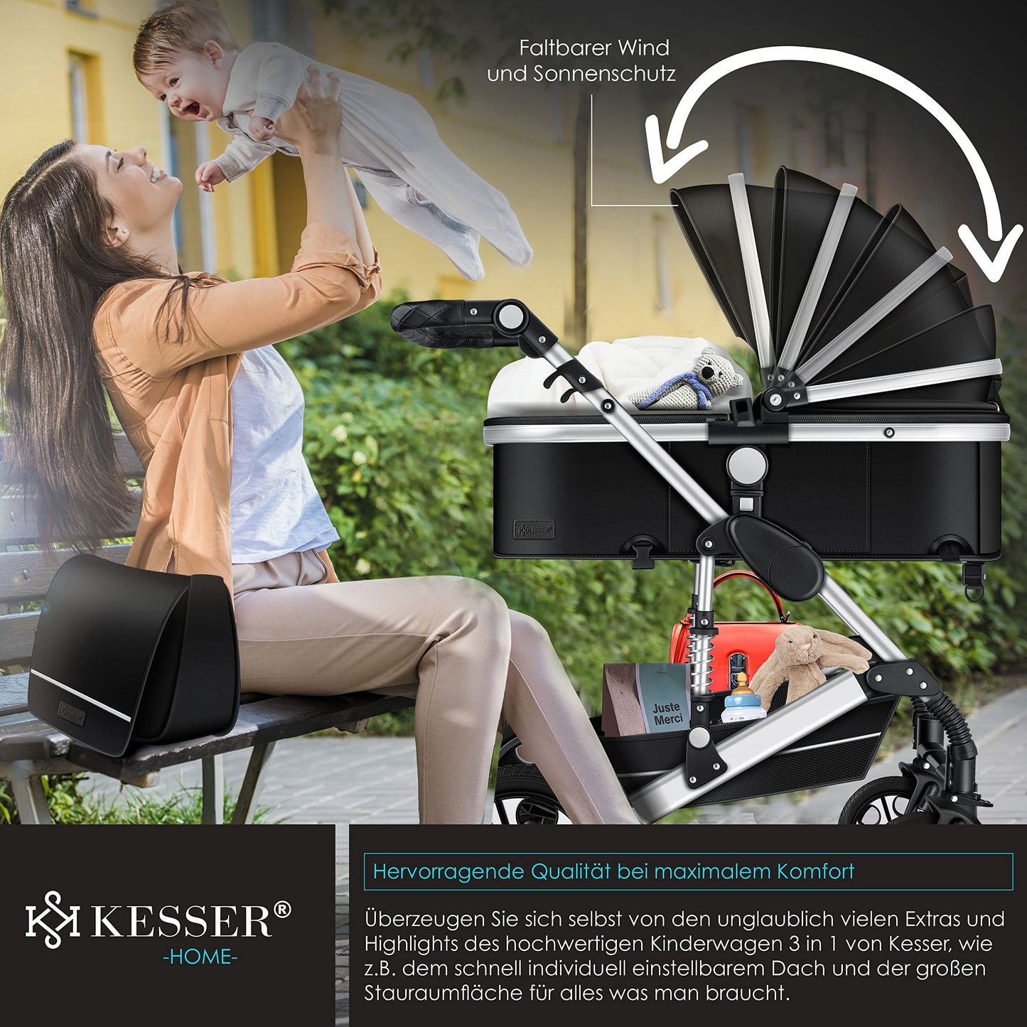 • 𝟑-𝐈𝐍-𝟏 𝐊𝐎𝐌𝐏𝐋𝐄𝐓𝐓𝐒𝐄𝐓: everything you need from birth to toddlerhood. The 3-in-1 stroller with a wide range of accessories offers ideal mobility from the moment your child is born. Your baby lies comfortably in the stroller. You can use the infant car seat from the very first car ride. The click system makes it easy to attach the infant car seat to the frame; no separate adapter is required. The infant car seat clicks onto the stroller with just one click.