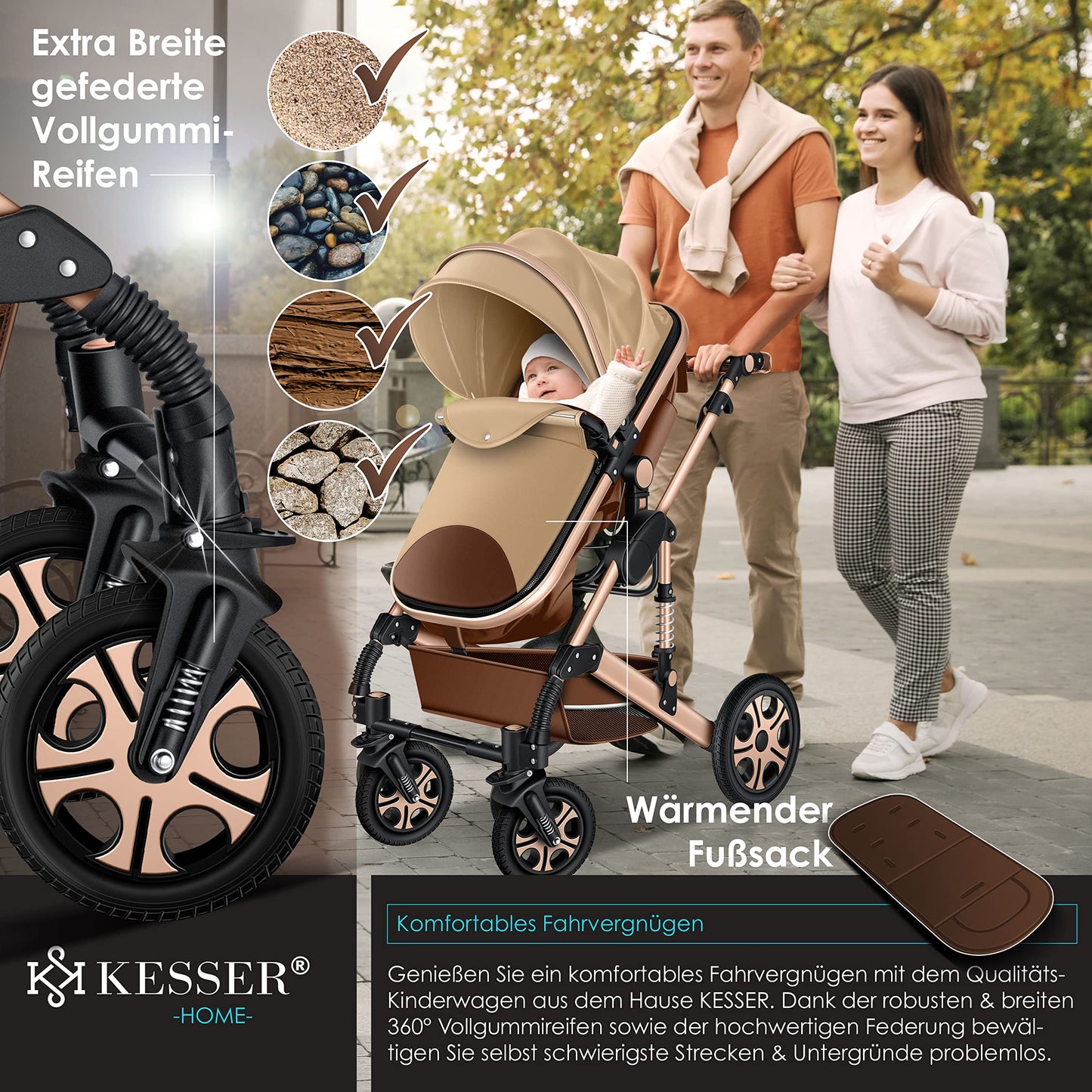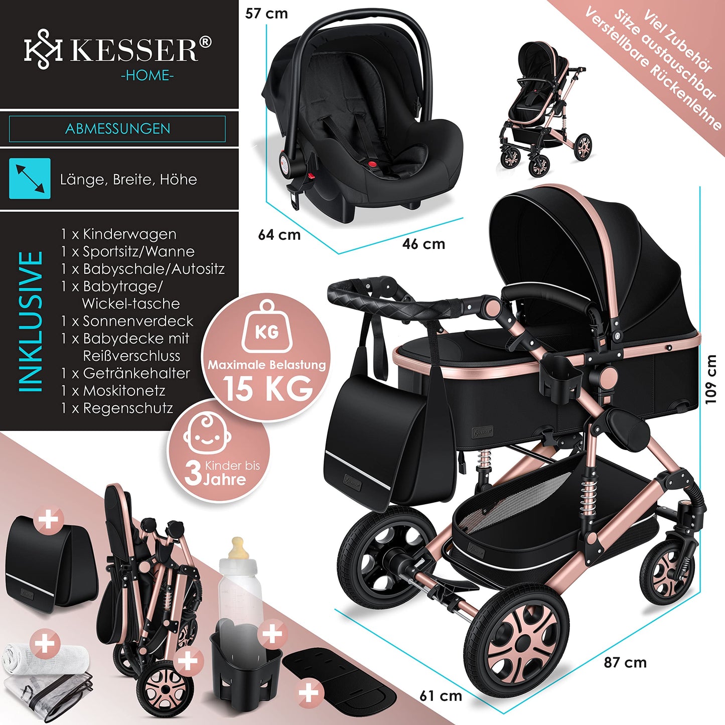 KESSER® Loops 3 in 1 Stroller Combi Stroller Complete Set including Carrycot & Buggy Sports Seat & Car Seat Solid Rubber Tires Changing Bag Rain Cover Children's Table ECE R129, Black/Champagne