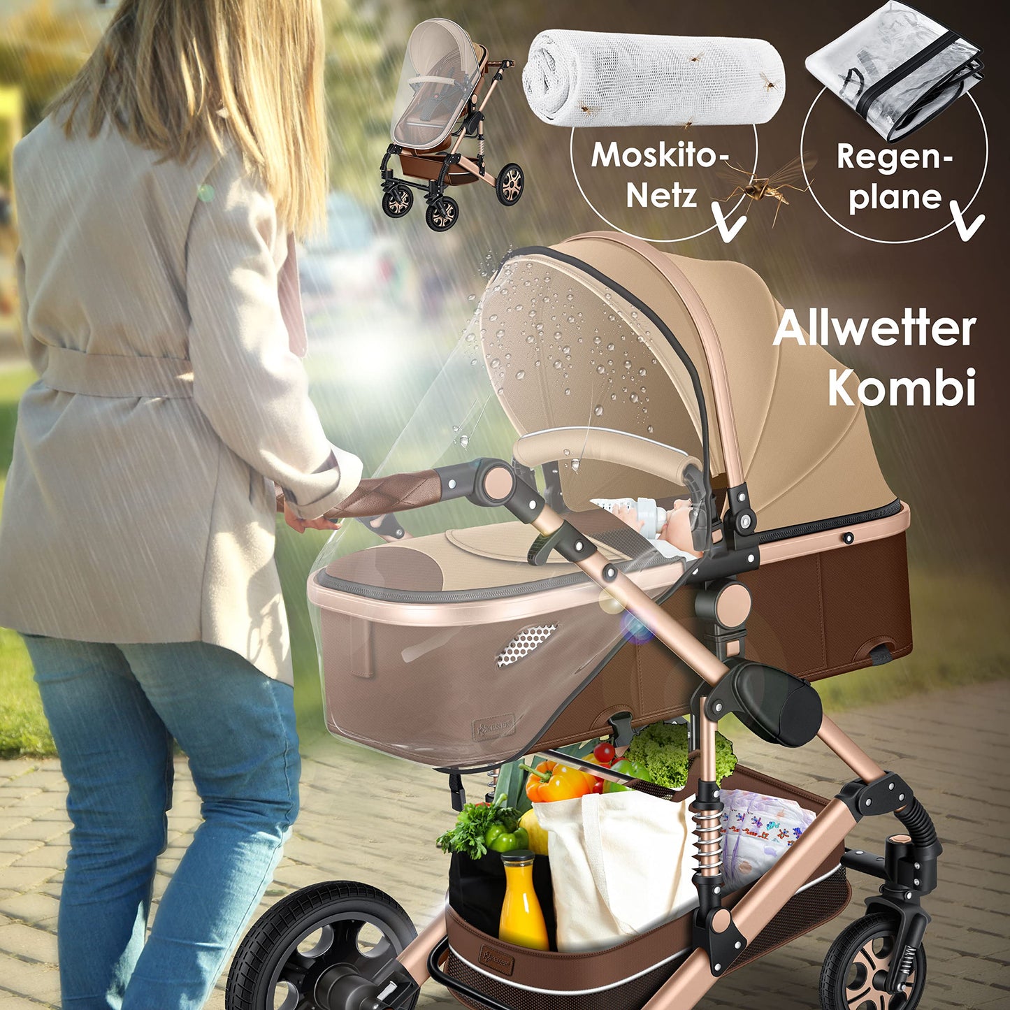• 𝐌𝐈𝐓 𝐕𝐈𝐄𝐋 𝐙𝐔𝐁𝐄𝐇𝐄𝐑𝐄: A practical basket for storing shopping, etc. There's also a pocket with compartments on the back of the buggy. There's a cup holder on the side. Also included are a rain cover, a mosquito net, and a large bag/diaper bag that matches the color of the stroller and can be attached to the handlebars.