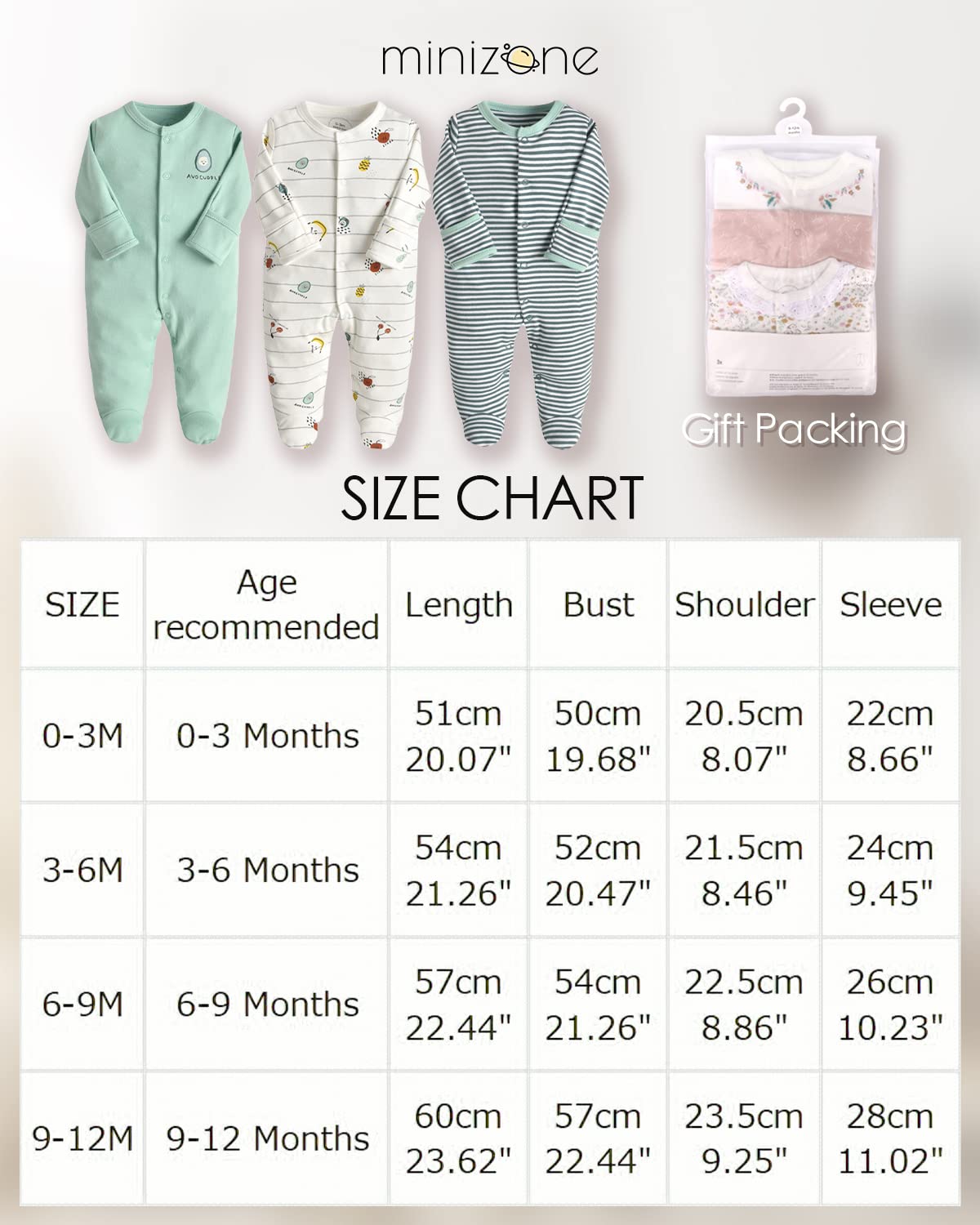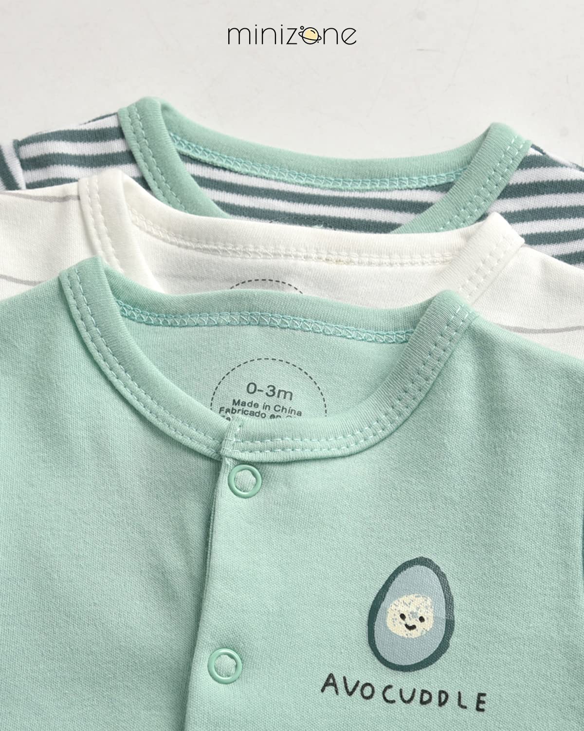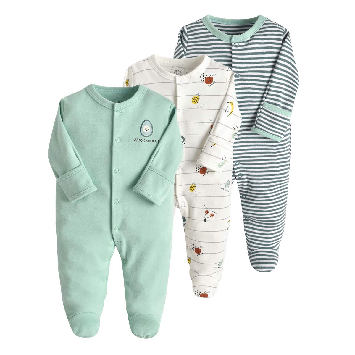 • The set includes 3 long-sleeved rompers, recommended for babies aged 0-12 months. Please note that our pajamas have a regular fit, so we recommend choosing a larger size for chubby babies.