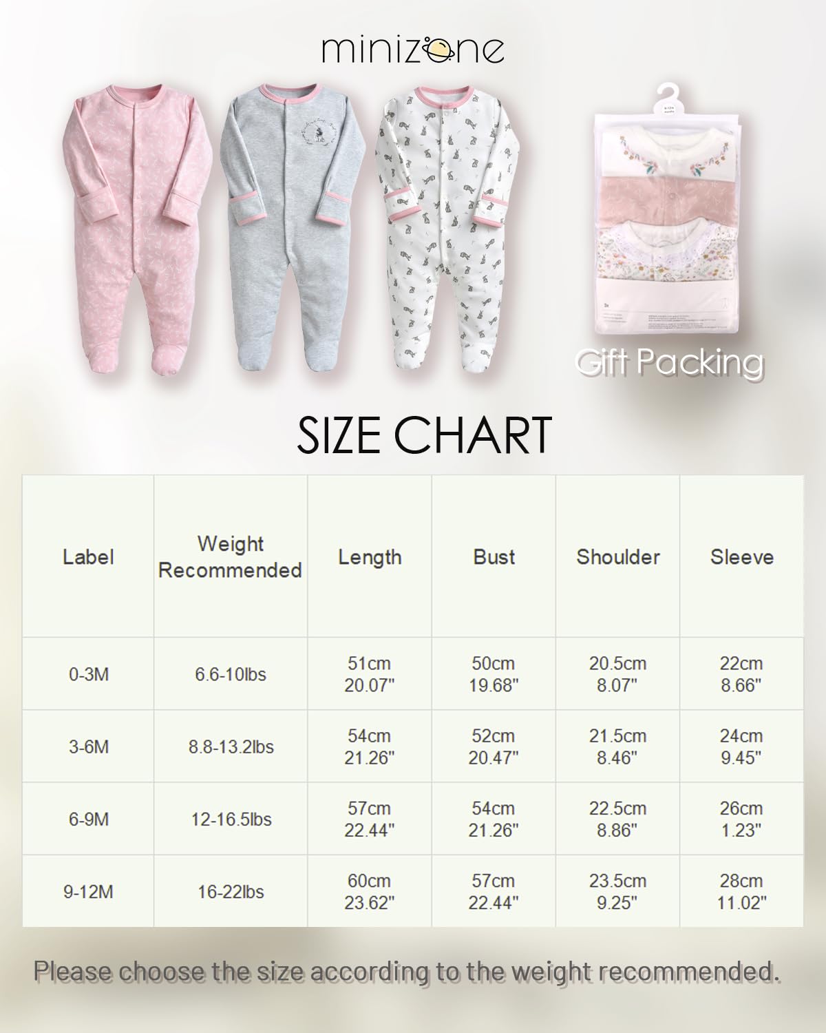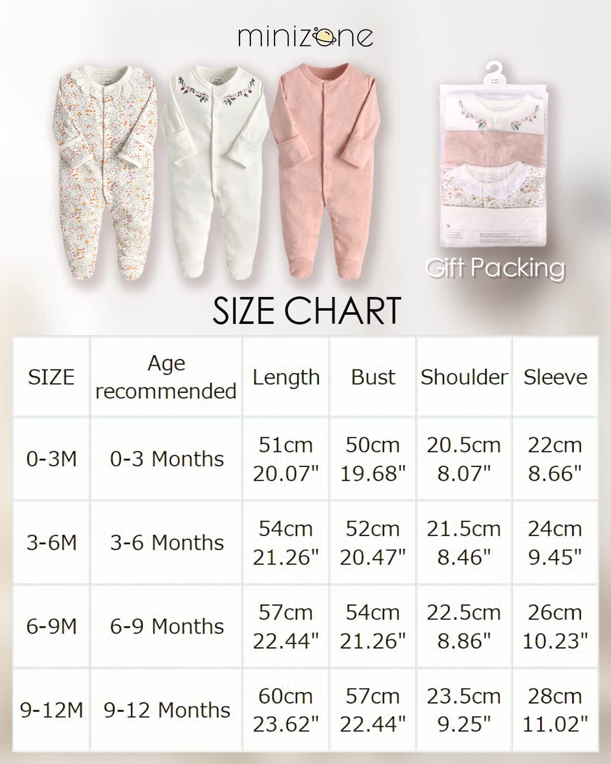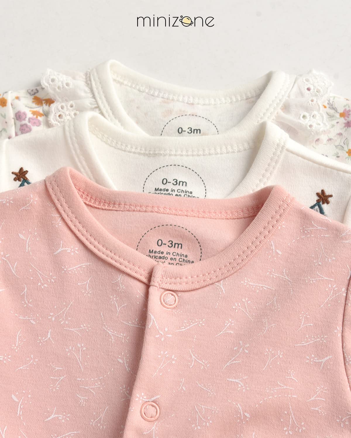 • The set includes 3 long-sleeved rompers, recommended for babies aged 0-12 months. Please note that our pajamas have a regular fit, so we recommend choosing a larger size for chubby babies.