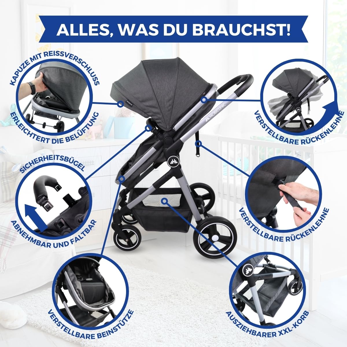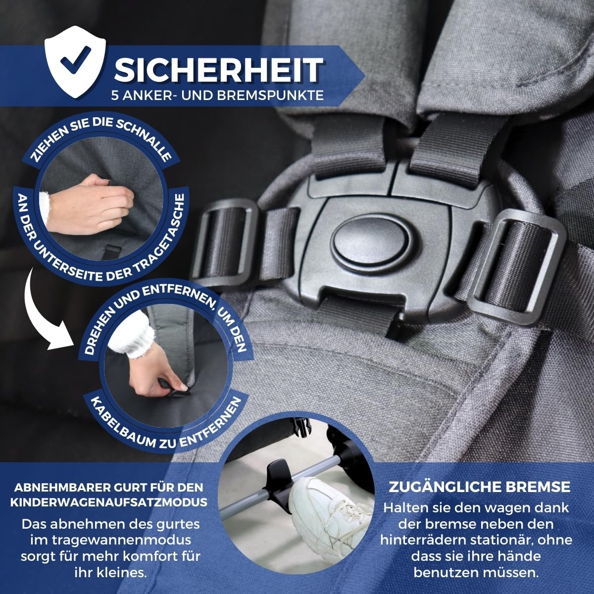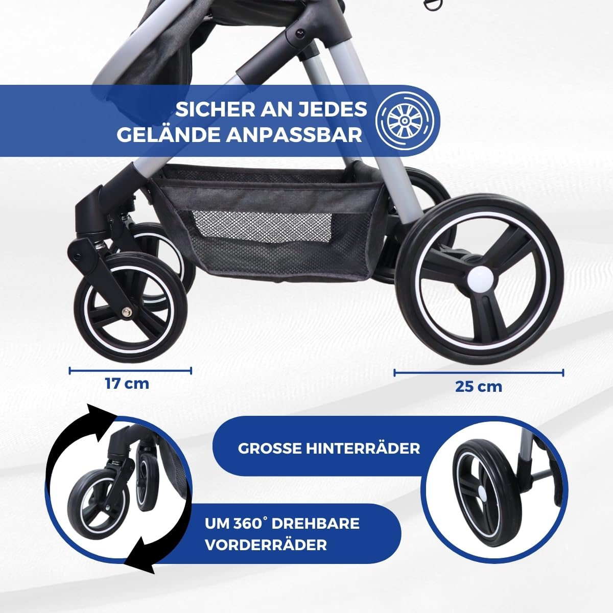 • ✔️SAFETY AND DURABILITY: Approved according to European safety standards EN 1888, our combi stroller is robust and safe. It handles any surface with all-wheel rear wheels and 360° rotating front wheels. The single-touch foot brake provides safety and allows you to keep your hands free during strolls. The 5-point harness and removable safety bar ensure additional safety.
