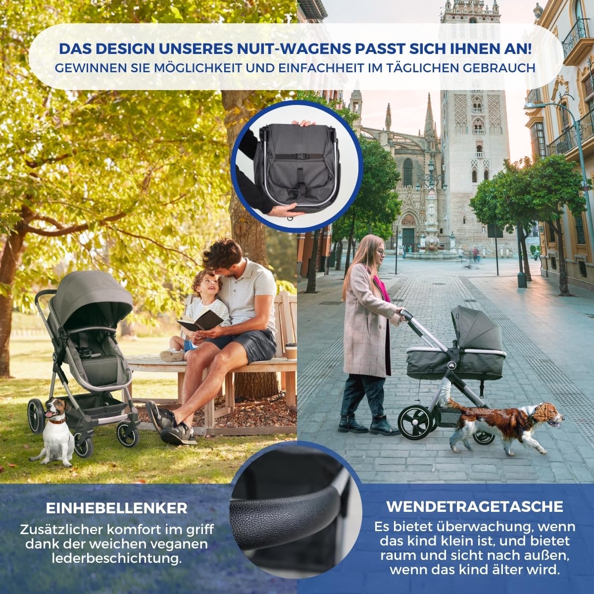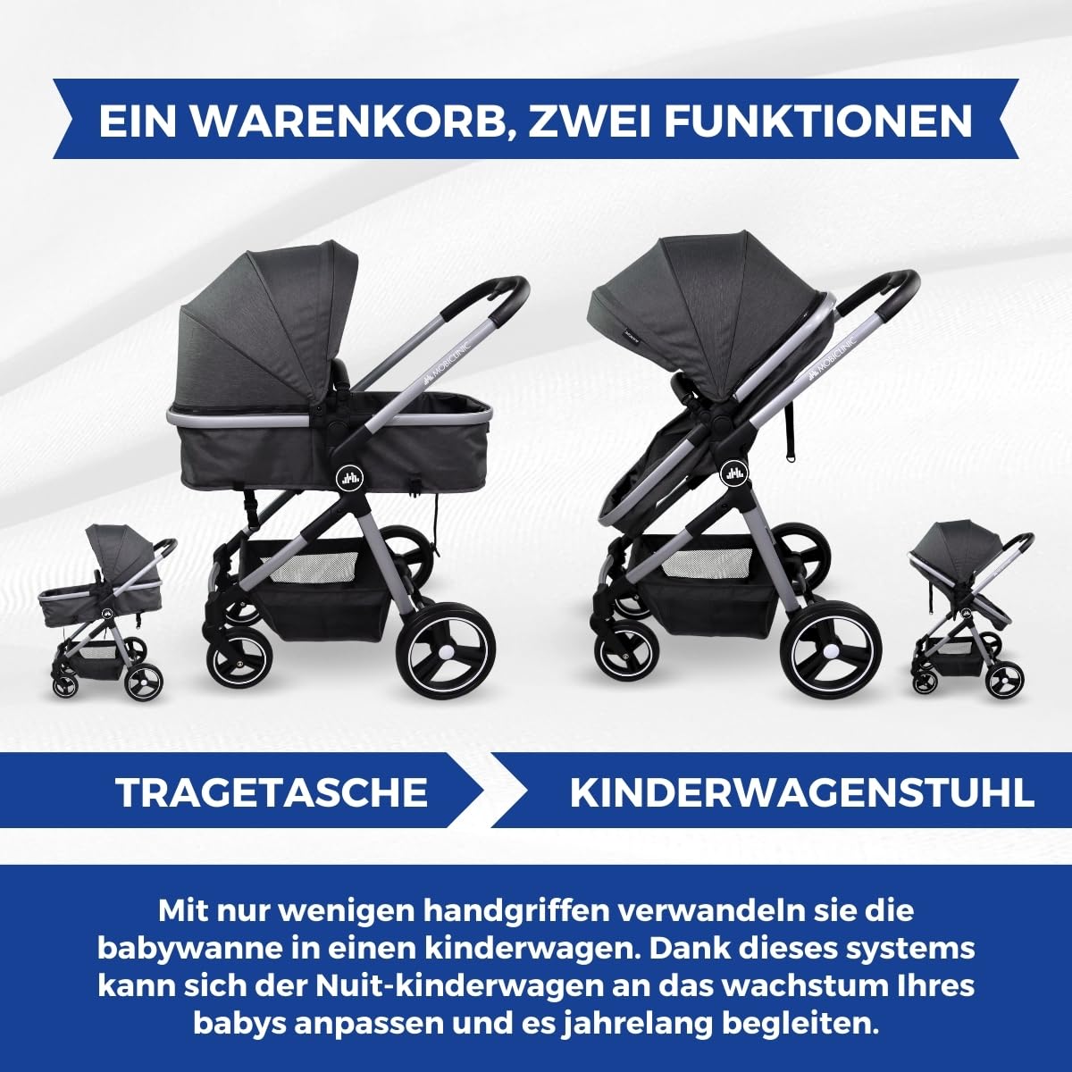 • ✔️2-IN-1 DESIGN AND PRACTICAL ACCESSORIES: The Nuit buggy with its 2-in-1 design transforms from a carrycot into a stroller and offers comfort throughout your baby's growth phases, supporting up to 22 kg