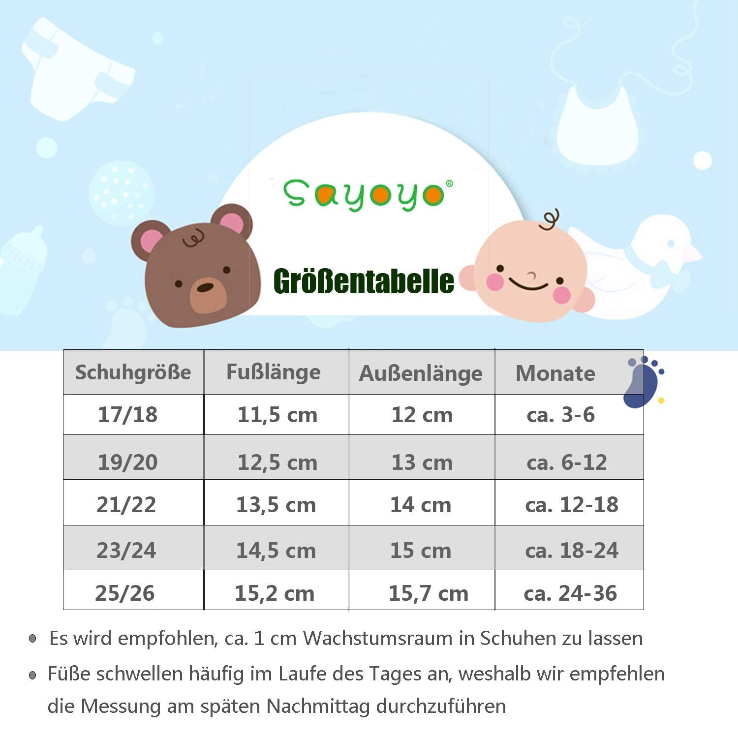 • Size chart: 17/18 EU = 12 cm, 19/20 EU = 13 cm, 21/22 EU = 14 cm, 23/24 EU = 15 cm