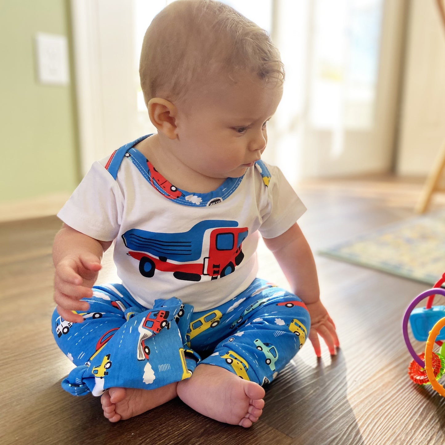This 3-piece set for boys includes a one-piece bodysuit, matching pants, and a hat. The top features a cute truck design. Made from 95% cotton and 5% Lycra—super soft and comfortable. High-quality dyes ensure long-lasting colors. Machine washable—perfect as a gift for little car fans!