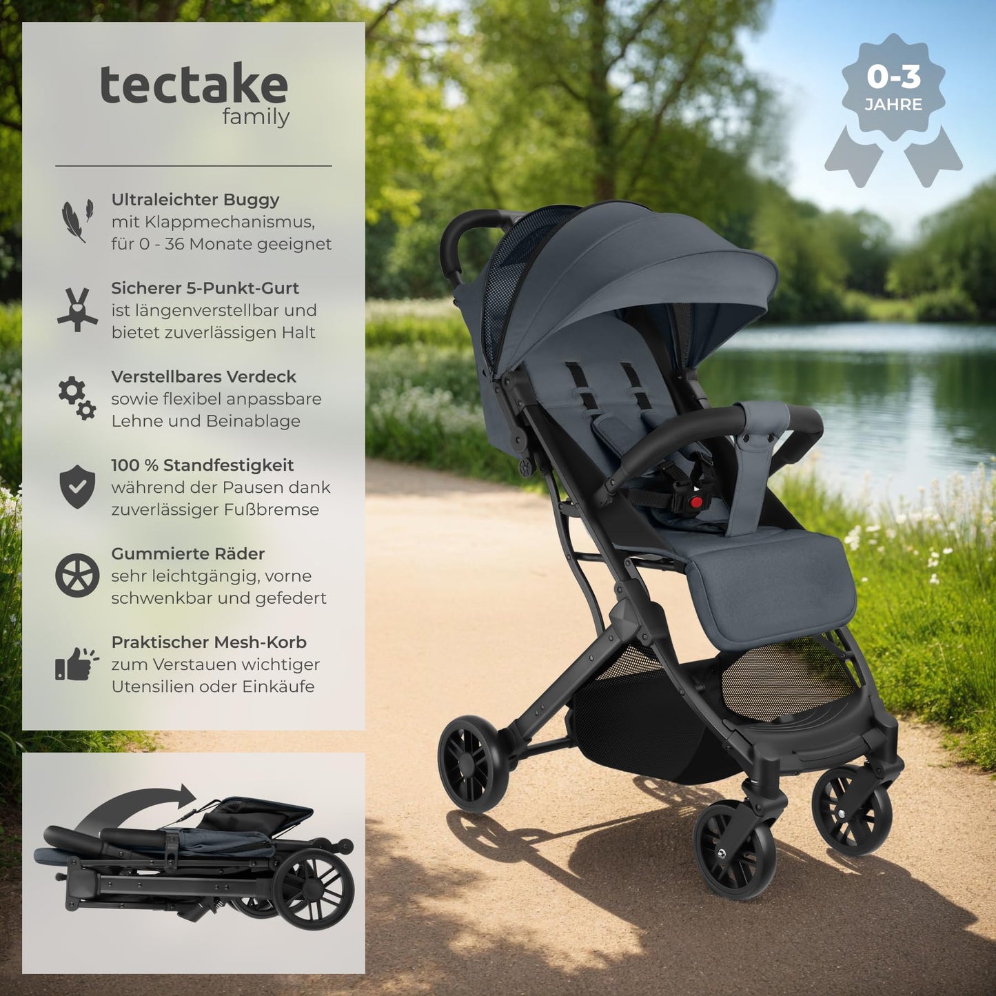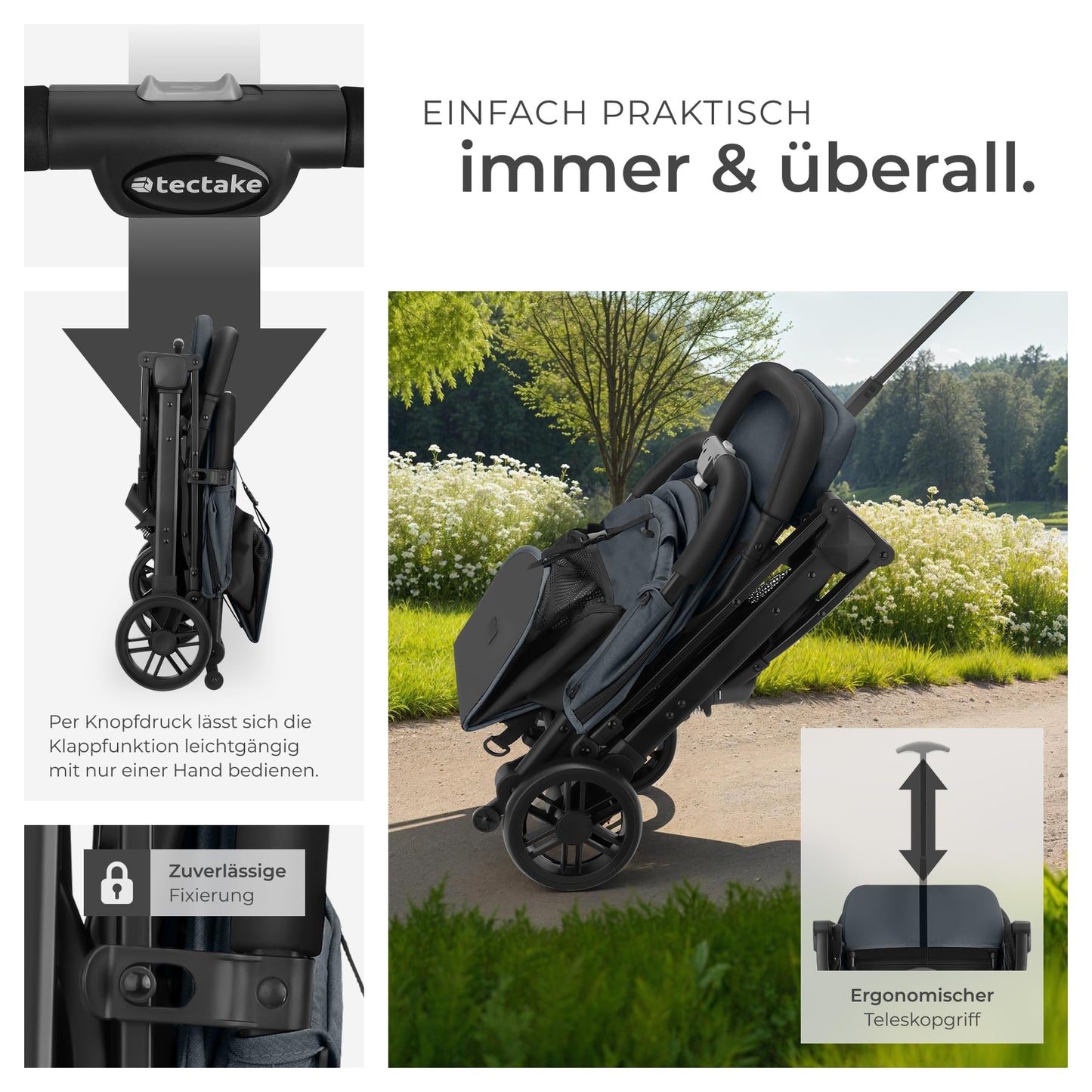 Maximum comfort, top safety, and a sophisticated design – the buggy stroller from tectake is your ideal everyday companion. Whether for walks, shopping, or traveling – it impresses with its flexibility and ease of use. The adjustable backrest and leg rest ensure a comfortable sitting and lying position. The foldable canopy protects your child and features a large viewing window with a mesh insert for ventilation and a clear view inside the stroller. The mesh basket under the seat offers storage space for shopping or baby accessories. The powder-coated steel frame makes the buggy stable and sturdy, while the cover is durable and easy to clean. The rubberized wheels, the front wheels of which are spring-loaded and swivel, allow for easy steering. Thanks to the ultra-lightweight frame and one-hand folding mechanism, the buggy can be stowed away in a flash. Two support wheels ensure stability when folded, while the telescopic handle makes pulling easier. The length-adjustable 5-point harness and the protective bar provide secure support, while the reliable foot brake stops the buggy safely at any time.