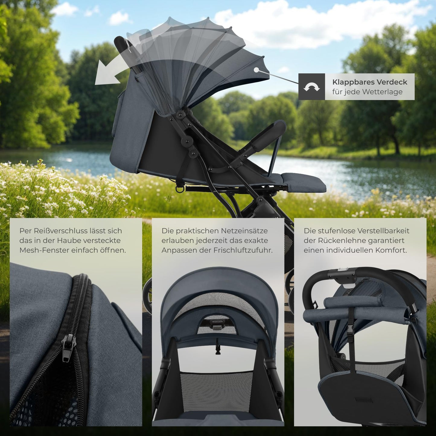 • EASY FOLDING BUGGIES & IDEAL FOR ON THE GO: With just one movement, you can fold the buggy in a flash – perfect for travel or everyday use. The foldable canopy protects your child from sun and wind, while the mesh window ensures good air circulation. The practical large basket and the two additional storage compartments of the buggy keep all your baby's essentials within easy reach.