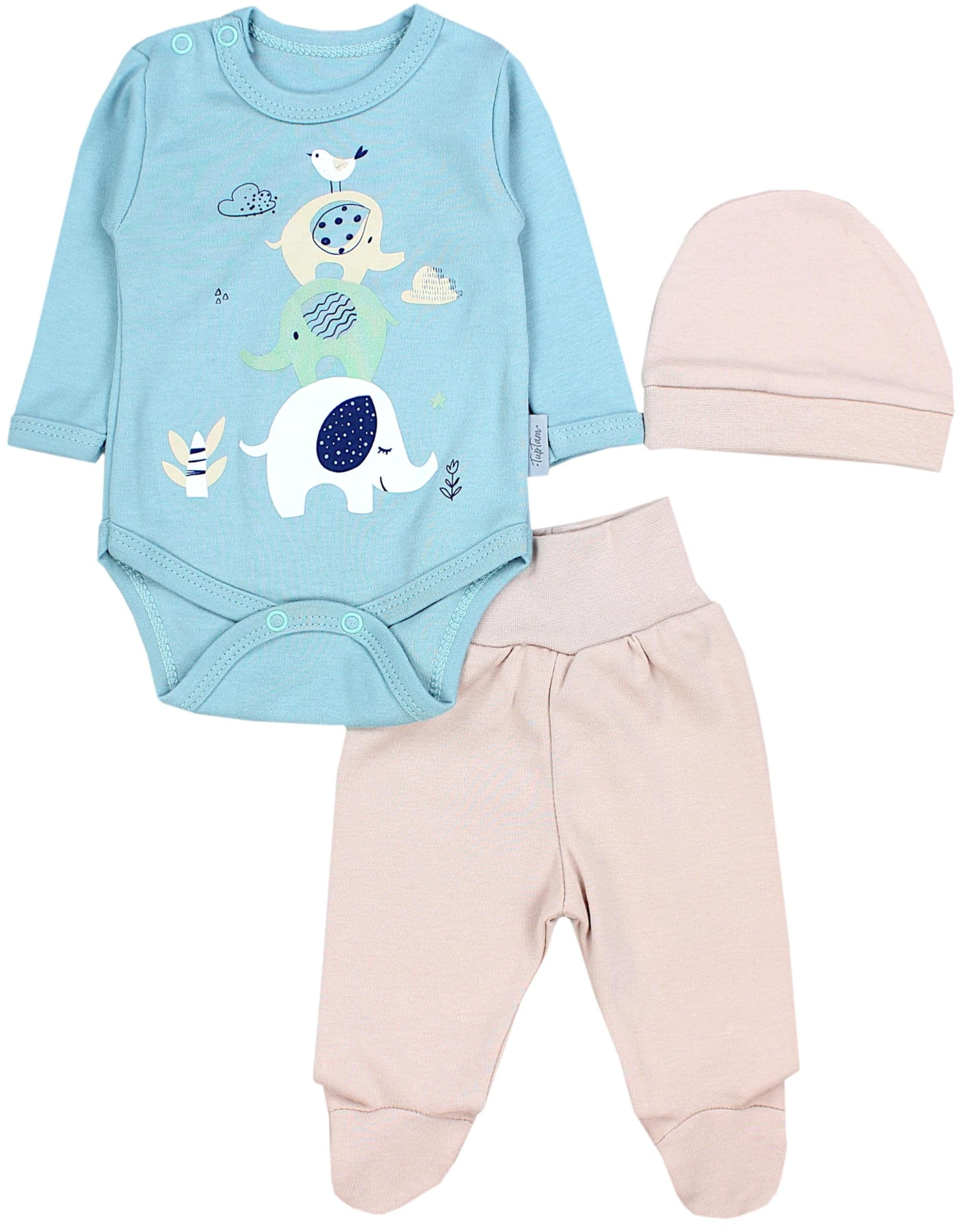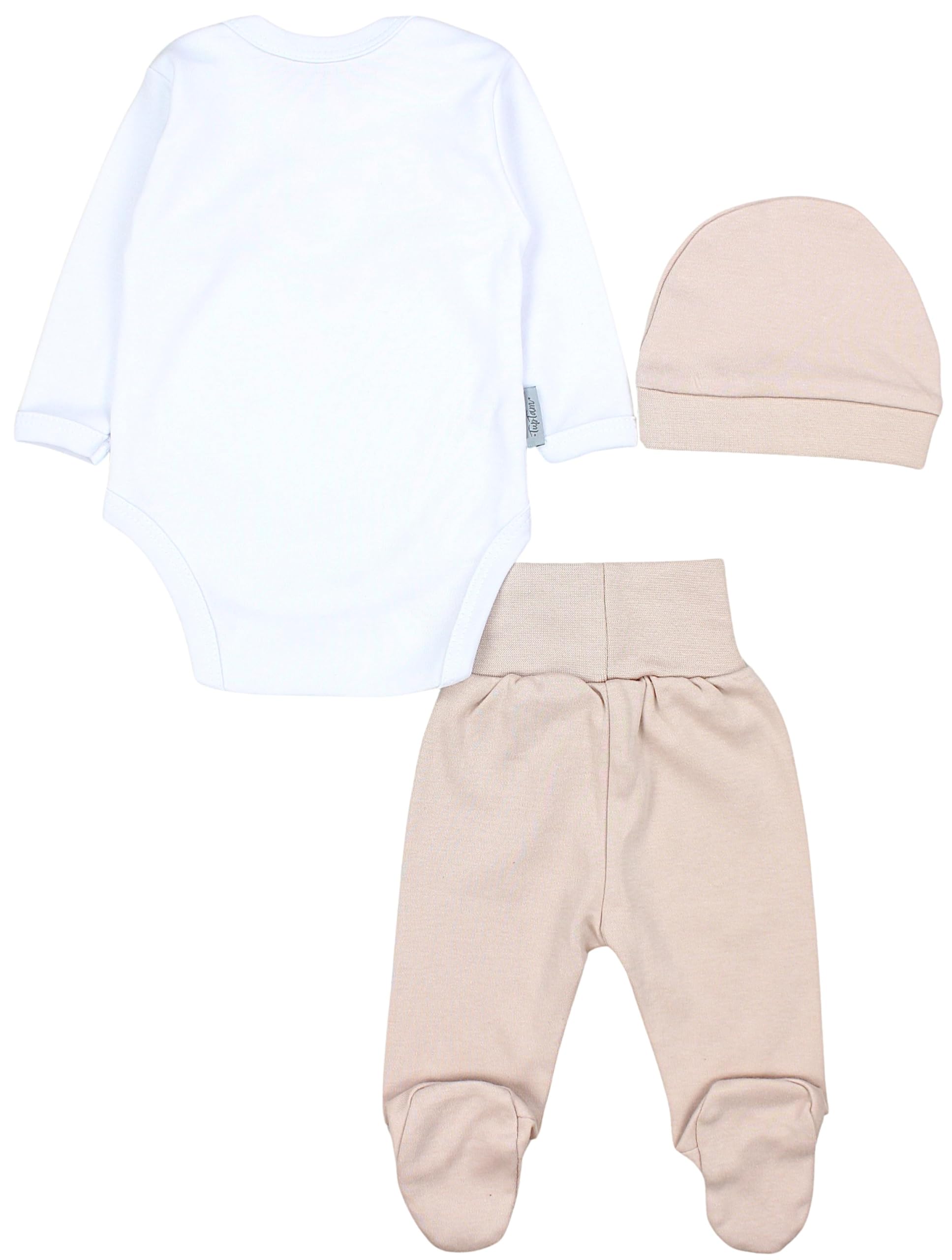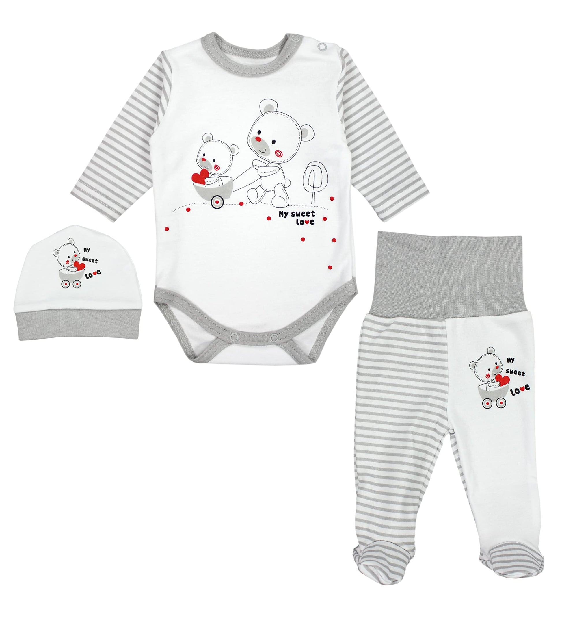 • Baby clothes set of 3 – the offer is two sets of 3 to choose from: set of wrap bodysuit, trousers and hat or set of long-sleeved bodysuit, trousers with foot and hat.