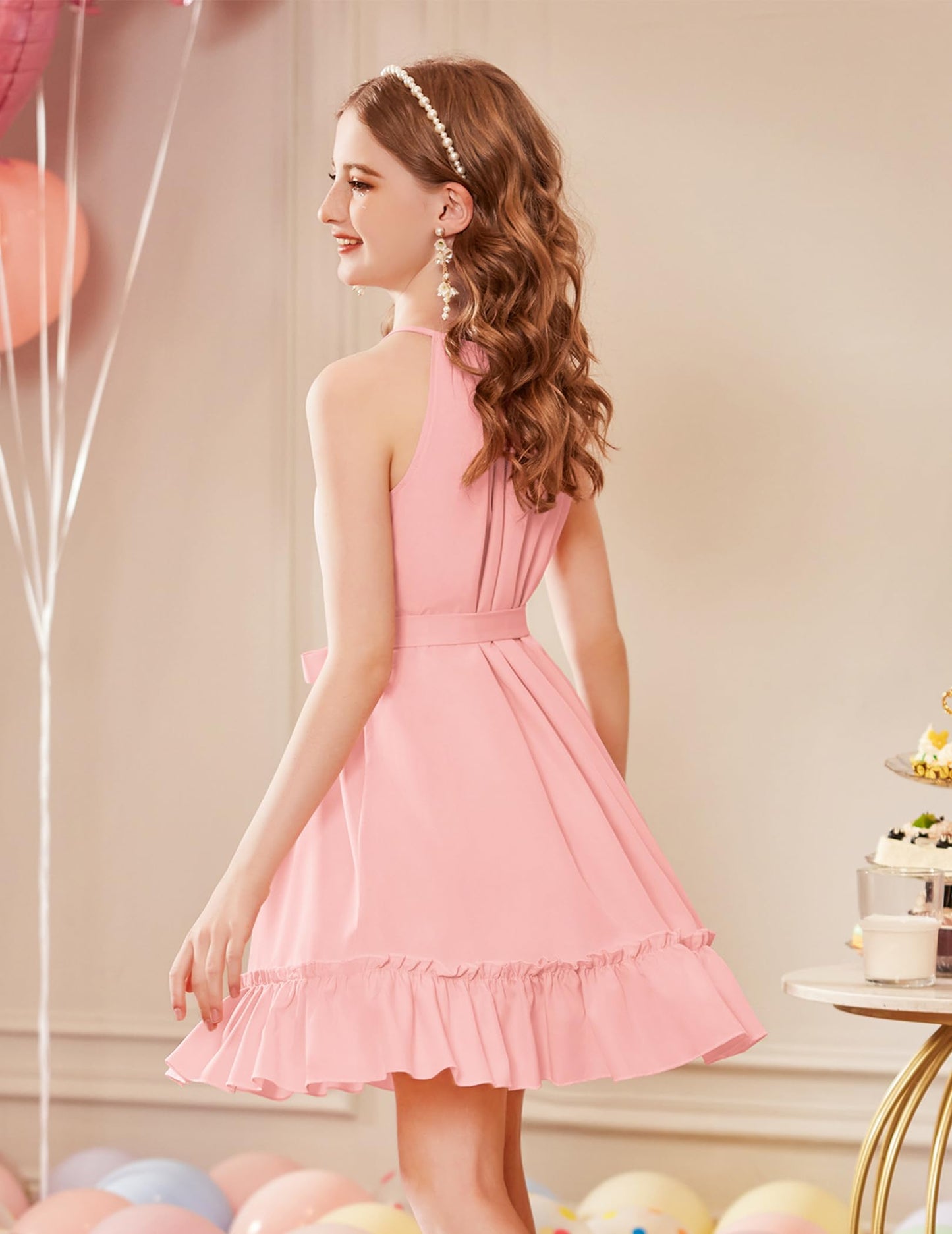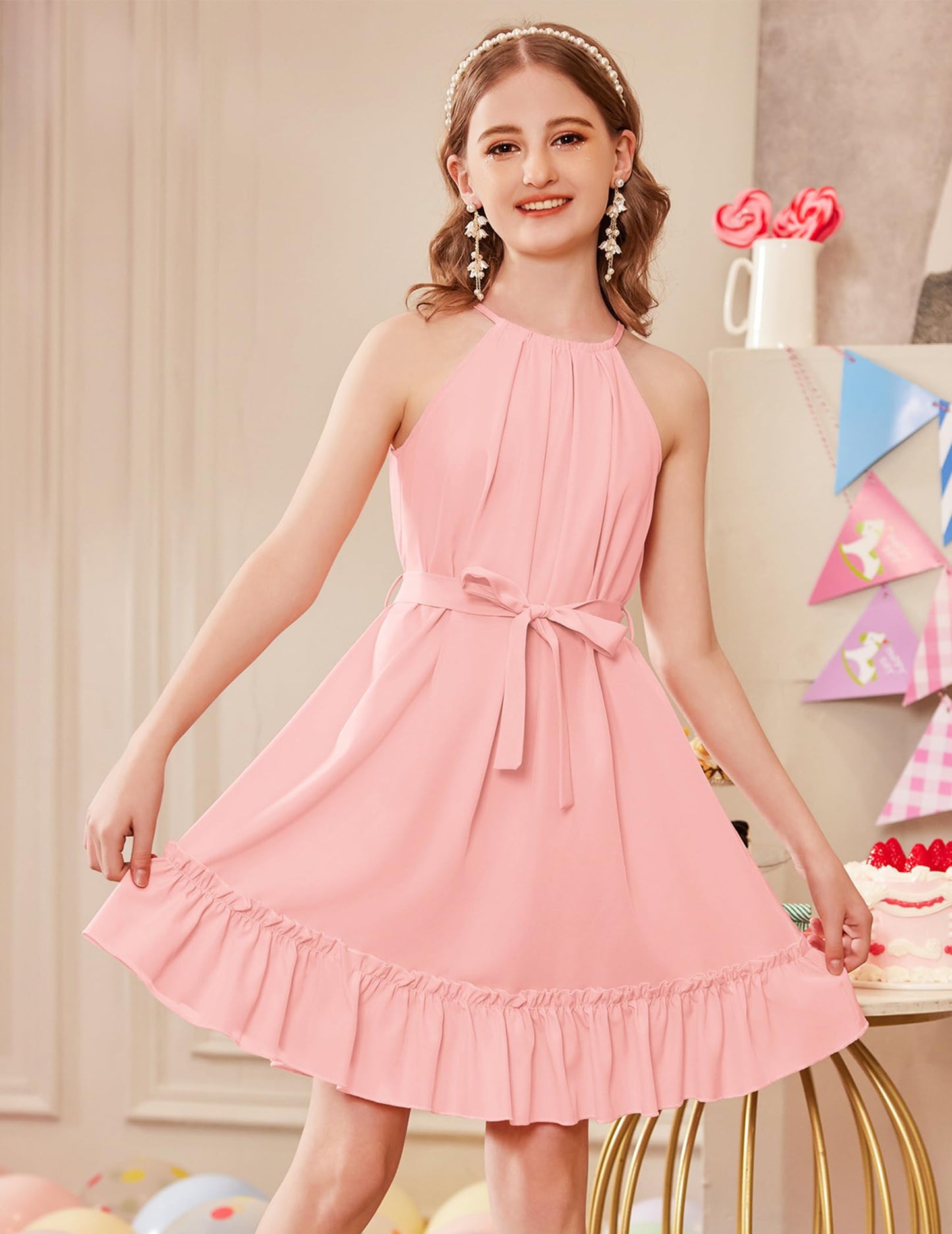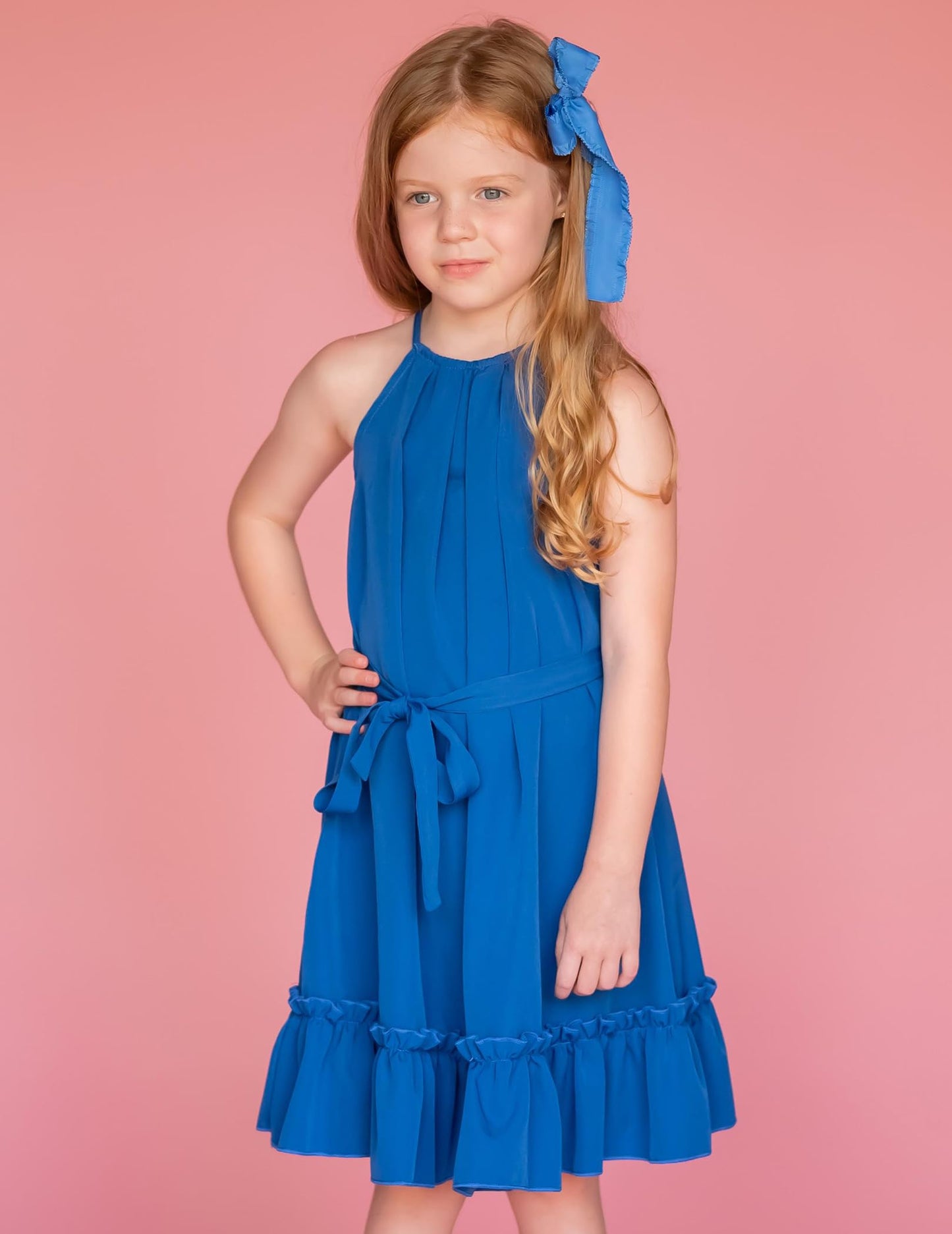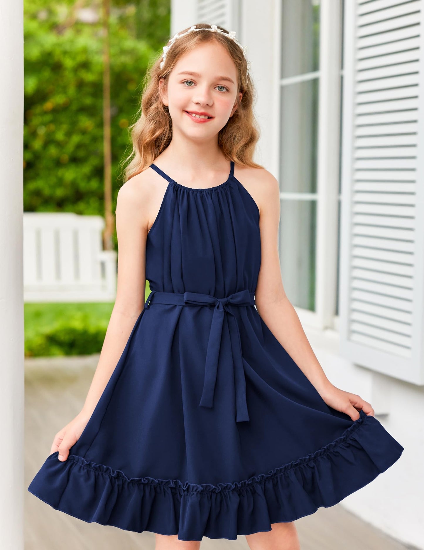 Arshiner Mädchen Kleid Neckholder Sommerkleid Rüschensaum Midikleid A-Linie Kinderkleid Swing Partykleider Abendkleid Kinder Festliche Kleider Freizeitkleid mit Gürtel 6-14 Jahre