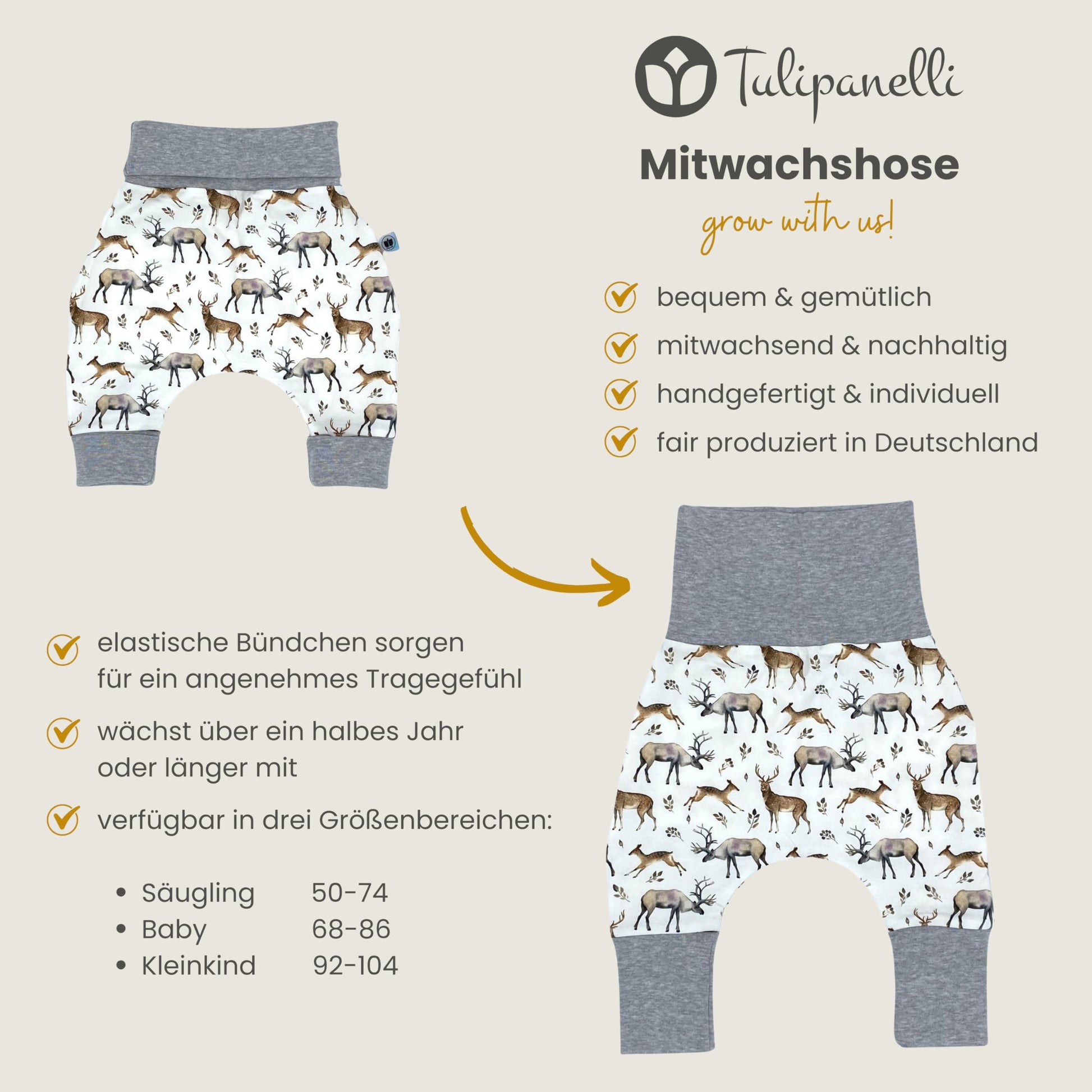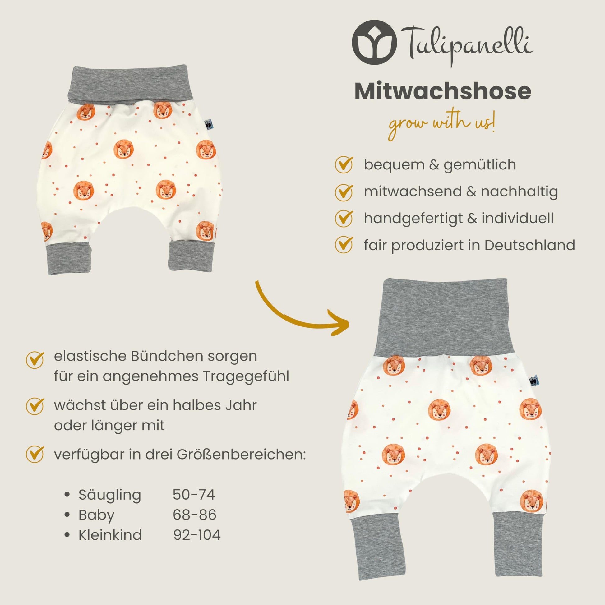 By rolling the cuffs on the stomach and legs, the trousers fit over multiple dress sizes. Our grow trousers are particularly airy and comfortable thanks to their pumpy cut. The elastic cuffs ensure a comfortable fit. Even cloth nappies can be found in our grow trousers.
