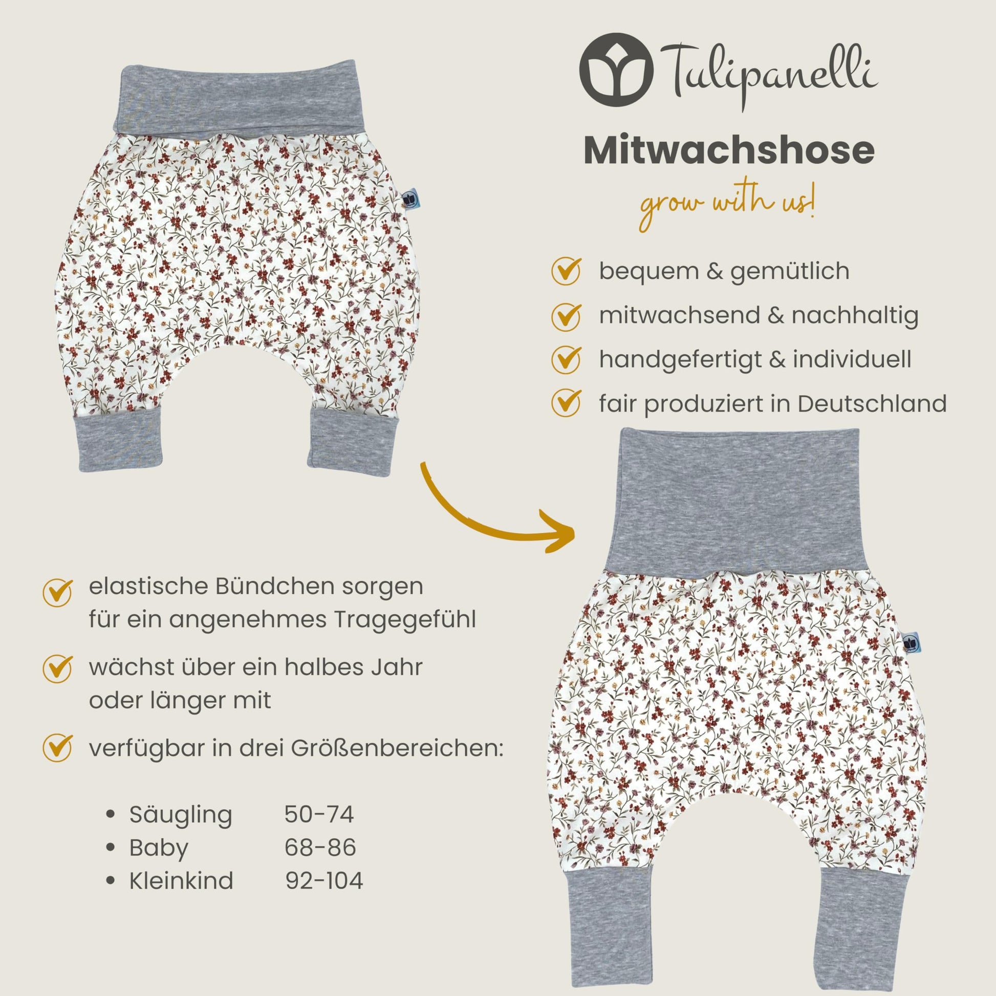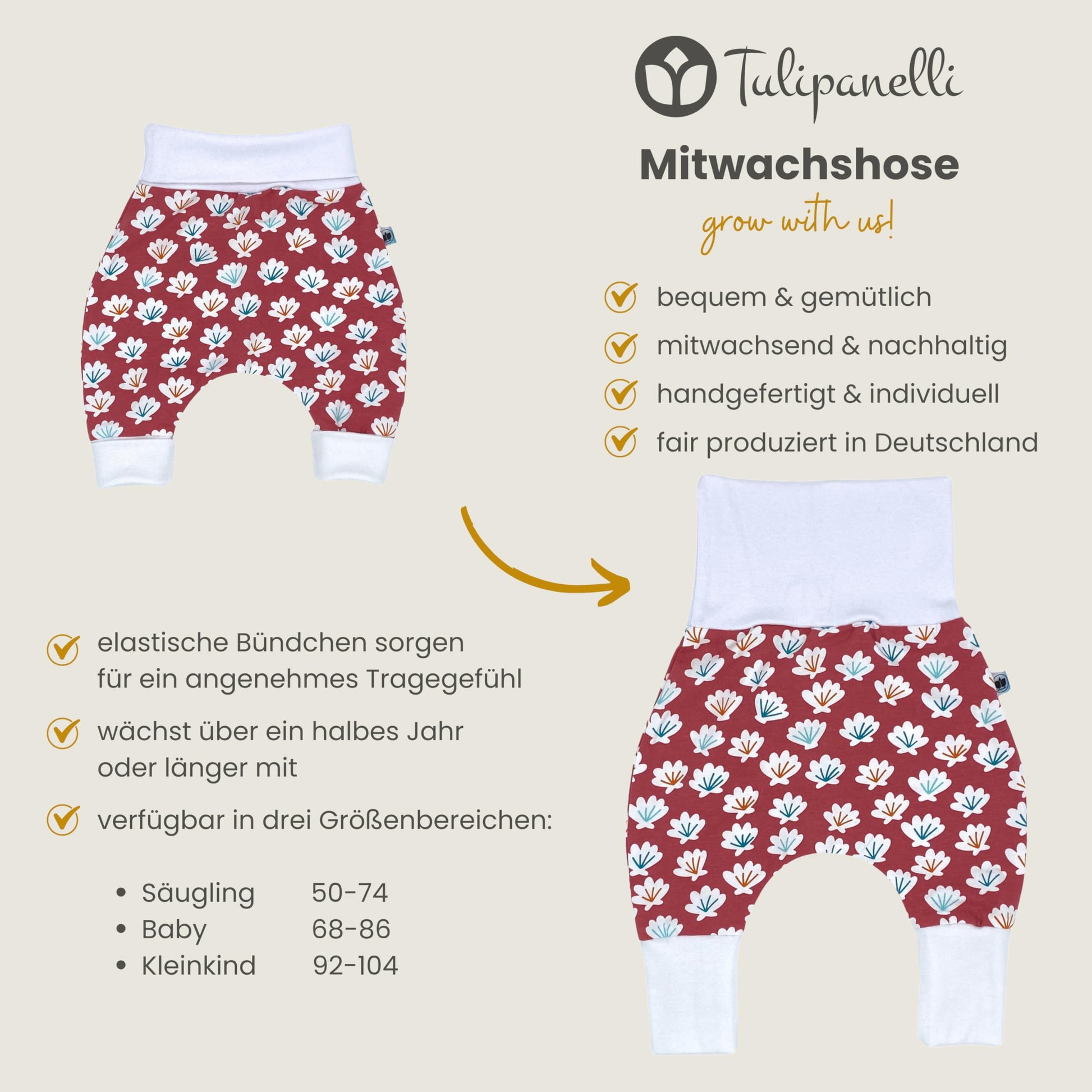 By rolling the cuffs on the stomach and legs, the trousers fit over multiple dress sizes. Our grow trousers are particularly airy and comfortable thanks to their pumpy cut. The elastic cuffs ensure a comfortable fit. Even cloth nappies can be found in our grow trousers.