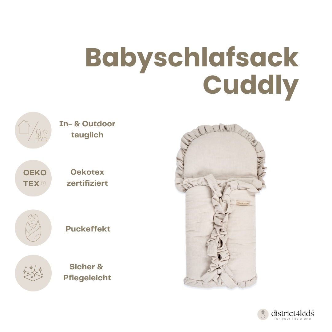 Der Babyschlafsack aus Musselin mit Rüschen & Schleifenbindung von District4Kids ist die perfekte Verbindung von Stil, Komfort & Sicherheit. Das elegante Design mit zarten Rüschen und Schleifen macht den Schlafsack zu einem liebevollen Hingucker im Babybett, während die weichen & atmungsaktiven Materialien für einen erholsamen Babyschlaf sorgen.