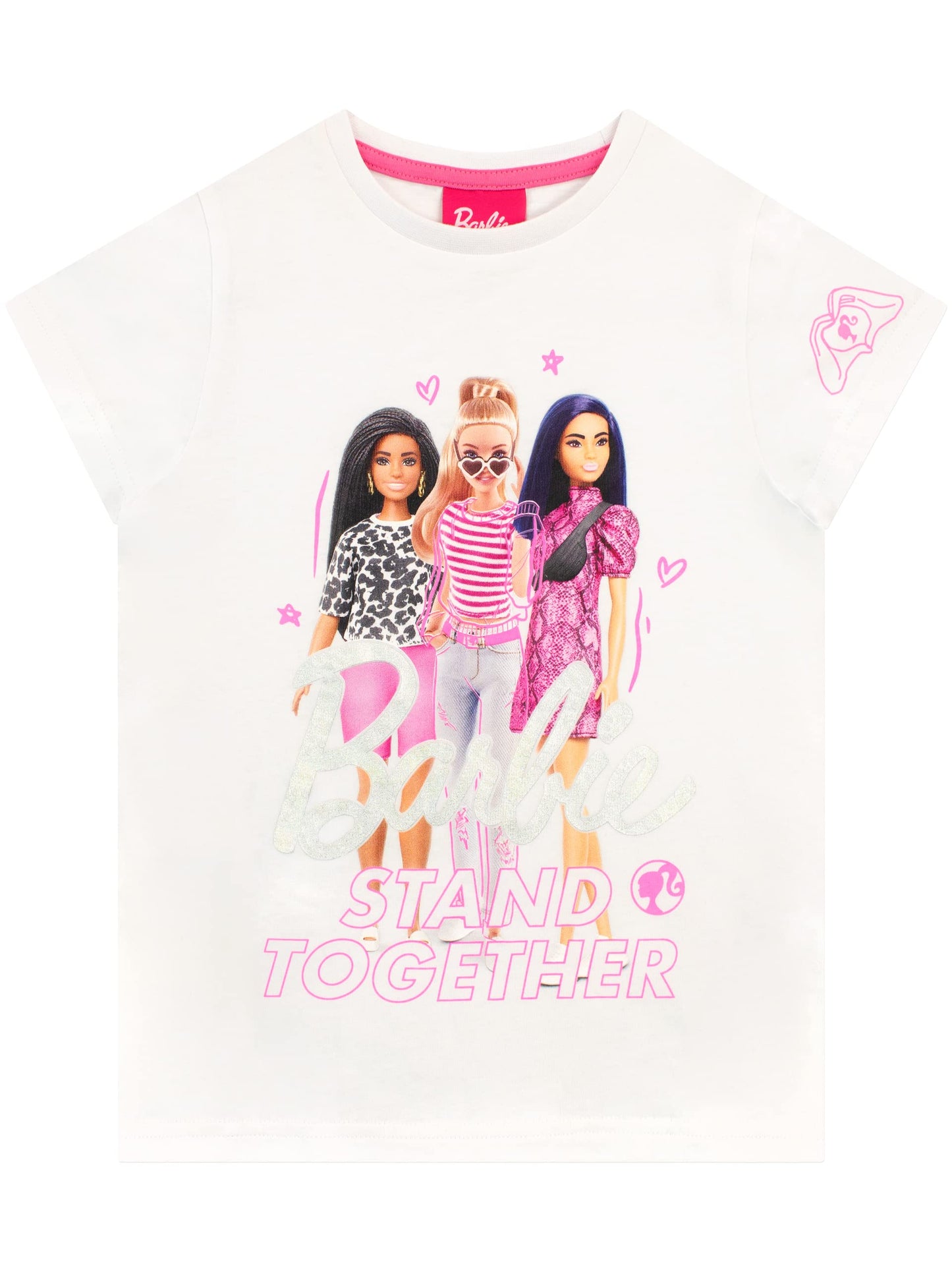 Mädchen Barbie T-Shirt. Mit diesem stylischen Barbie Oberteil kann deine kleine Modeikone die Kraft der Freundschaft feiern! Das weiße kurzärmlige T-Shirt zeigt Barbie und ihre Freunde zusammen mit dem Schriftzug "Barbie" in Silberfolie und dem Slogan "Stand Together" sowie einem Herzaufdruck auf dem linken Ärmel. Dieses T-Shirt wird den Tag deiner Fashionista mit Sicherheit glamouröser machen!