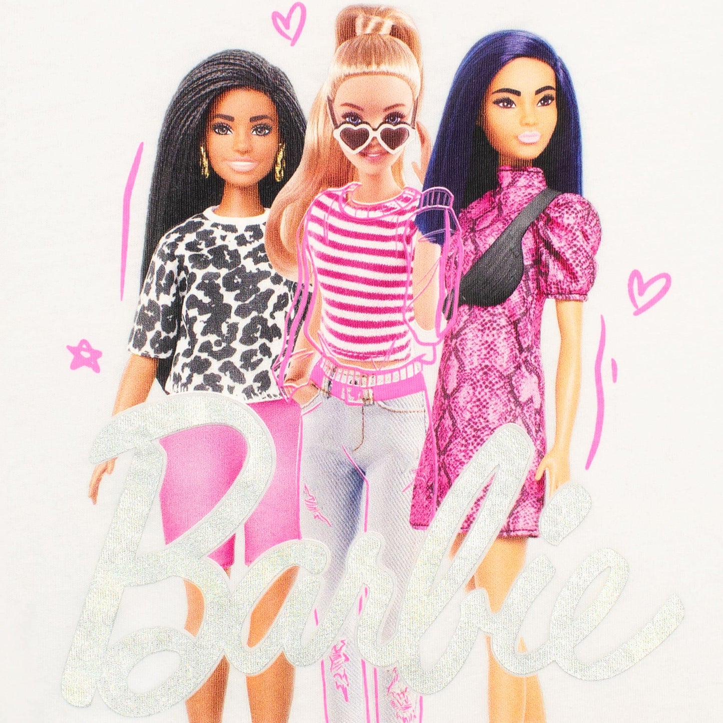 • Dieses kurzärmelige weiße T-Shirt zeigt Barbie und ihre Freunde mit dem "Barbie" Schriftzug in Silbermetallic und dem Slogan "Stand Together" auf der Vorderseite sowie einem aufgedruckten Handherz auf dem linken Ärmel