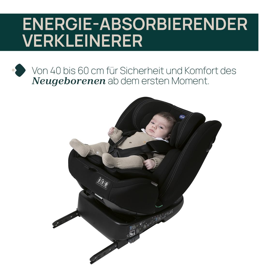 Mit seinem eleganten schwarzen Design fügt sich der Chicco Unico Evo I-Size harmonisch in jede Fahrzeuginneneinrichtung ein. Die umsetzbare 360° Drehfunktion erleichtert das Handling, während die Anpassungsfähigkeit des Kindersitzes sicherstellt, dass Ihr Kind über Jahre hinweg sicher und bequem reist. Egal ob als rückwärtsgerichteter Sitz für Neugeborene oder als vorwärtsgerichteter Sitz für größere Kinder, dieser Sitz passt sich flexibel an die Bedürfnisse Ihrer Familie an. Durch die robuste Konstruktion und die Verwendung hochwertiger Materialien bietet der Chicco Unico Evo I-Size nicht nur einen erstklassigen Schutz, sondern auch eine lange Lebensdauer.