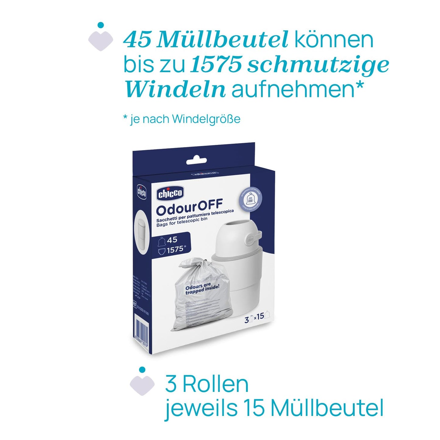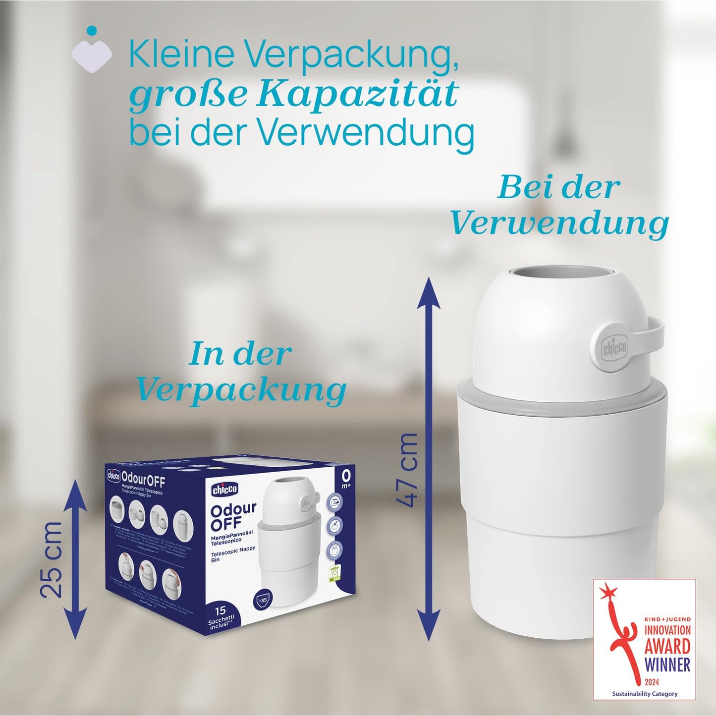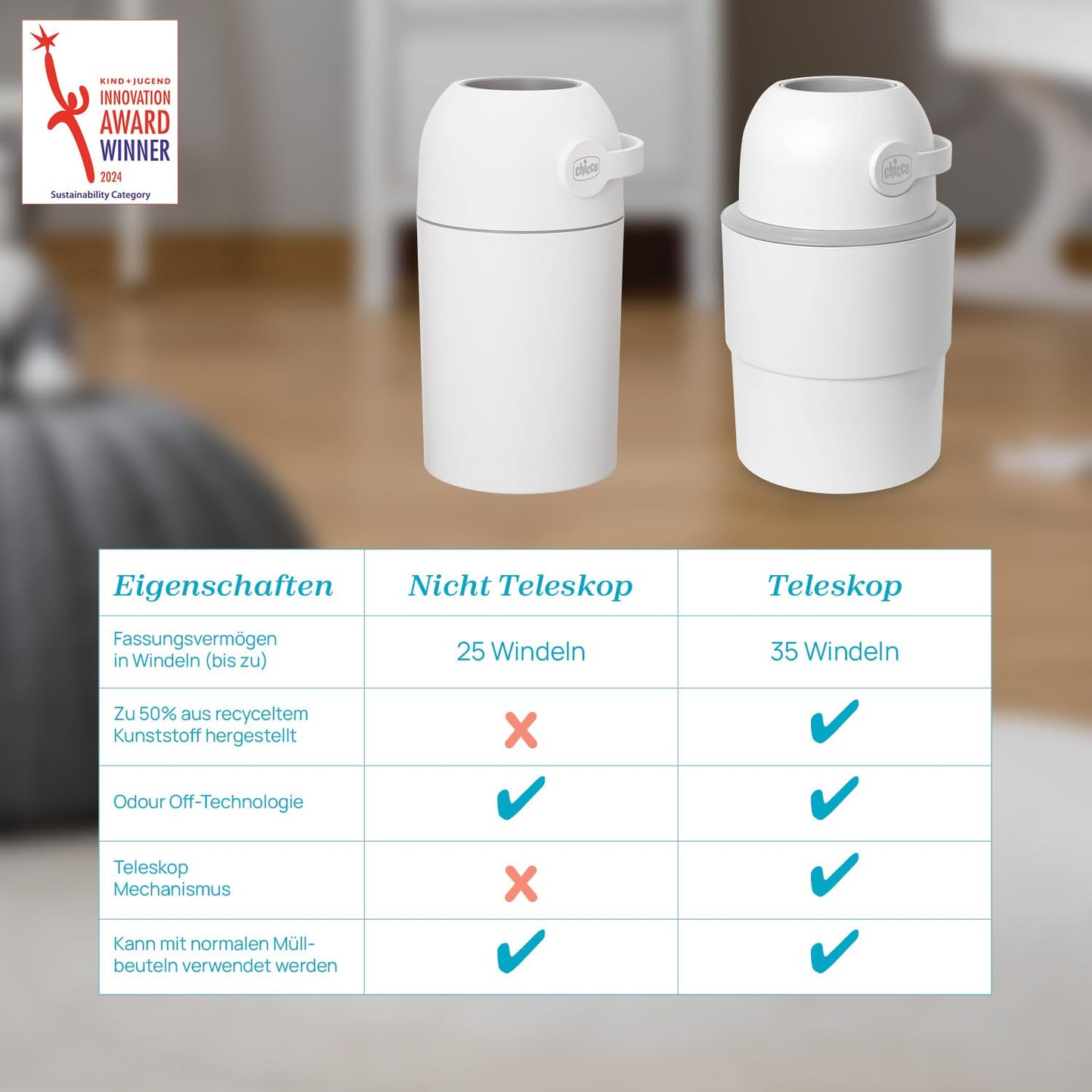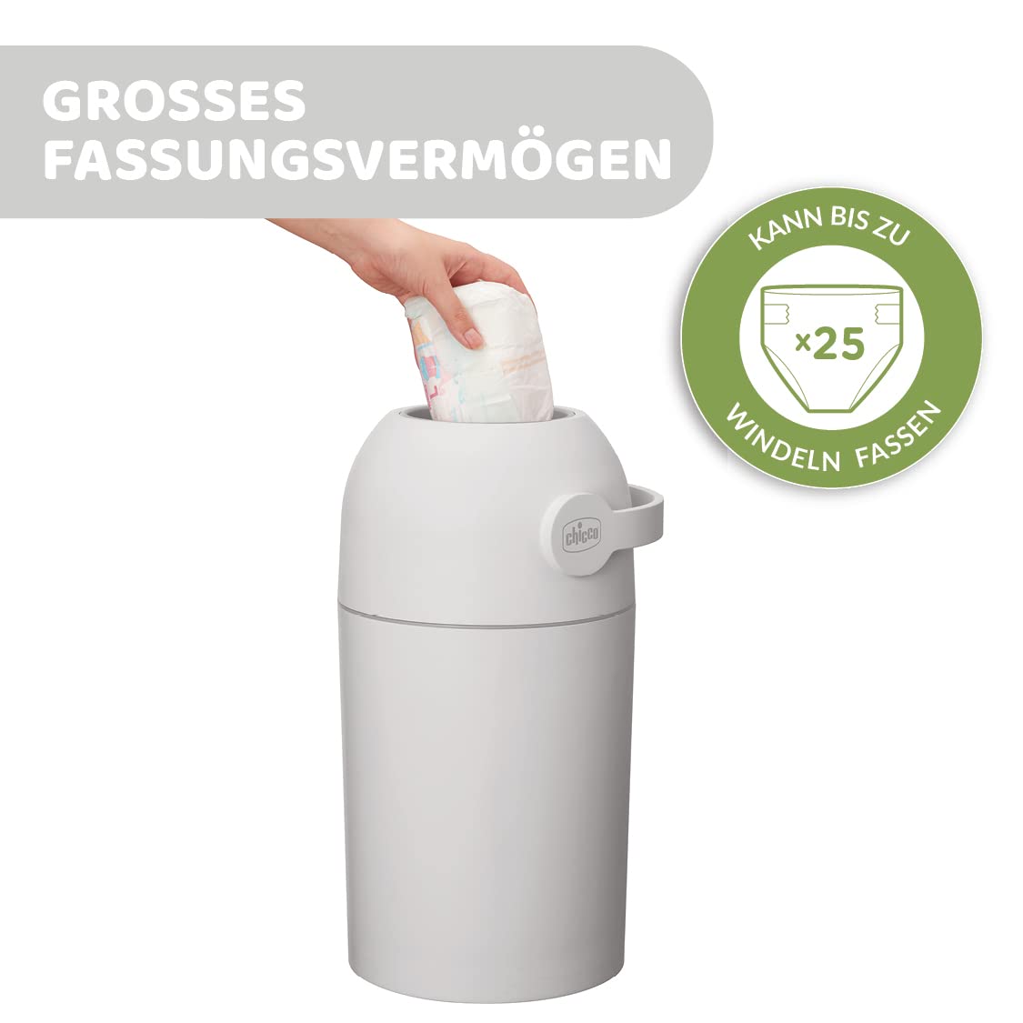 Der Windeleimer mit Deckel von Chicco ist ein Windeleimer, der mit normalen Plastiktüten verwendet werden kann, wodurch die Kosten für spezielle Tüten oder die Verschwendung von Plastik vermieden werden. Das patentierte Anti-Geruchs-System und die verwendeten innovativen Dichtungen verhindern das Entweichen von unangenehmen Gerüchen. Der Windeleimer ist praktisch und einfach zu benutzen und zu reinigen. Der Müllbeutel kann in 3 einfachen Schritten entsorgt werden. Der kompakte und platzsparende Behälter kann bis zu 25 Windeln aufnehmen (je nach Größe der Windeln kann die Menge leicht variieren). Durch die Verwendung eines einzigen Beutels wird der Plastikmüll deutlich reduziert und der Recyclingprozess vereinfacht.