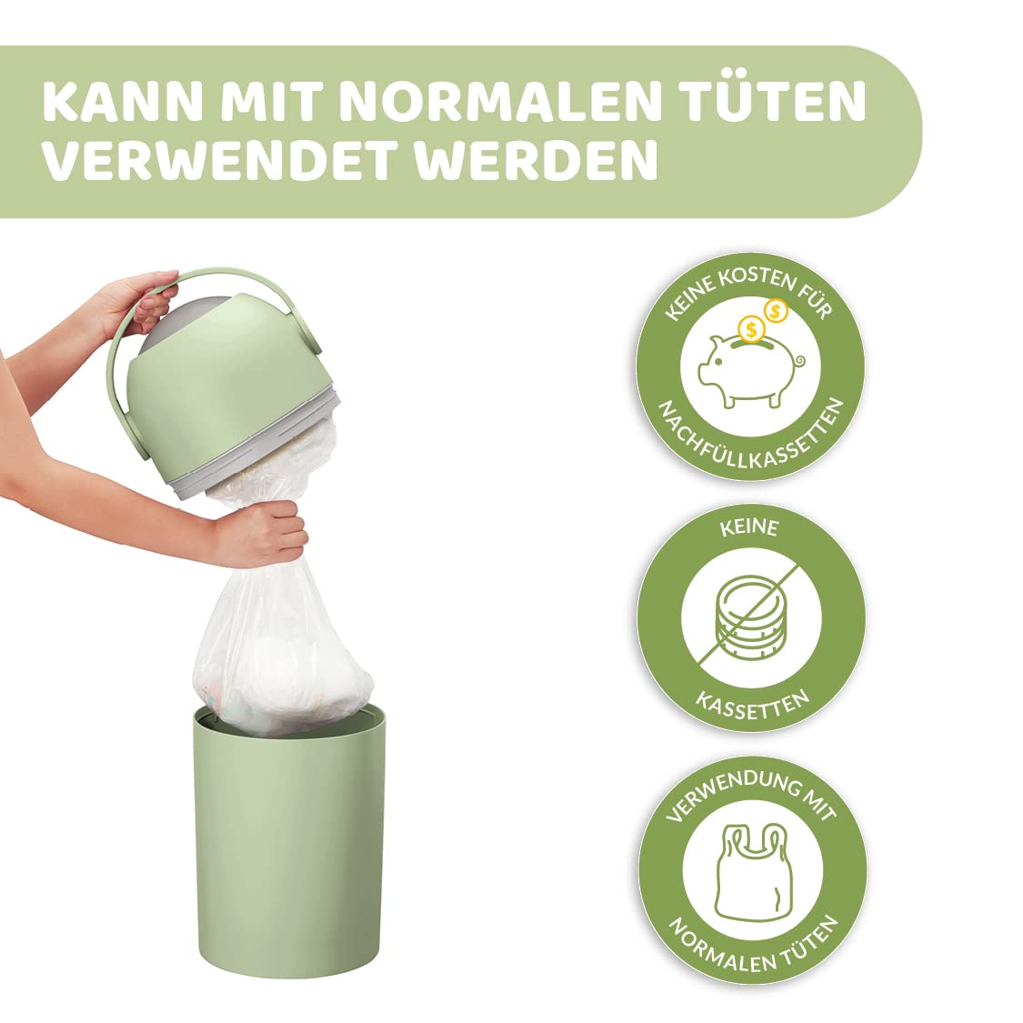 • KEINE SPEZIELLEN BEUTEL ERFORDERLICH: Der Windeleimer kann mit normalen Plastiktüten verwendet werden, wodurch die Kosten für spezielle Tüten und Kassetten oder die Verwendung von Plastik reduziert werden