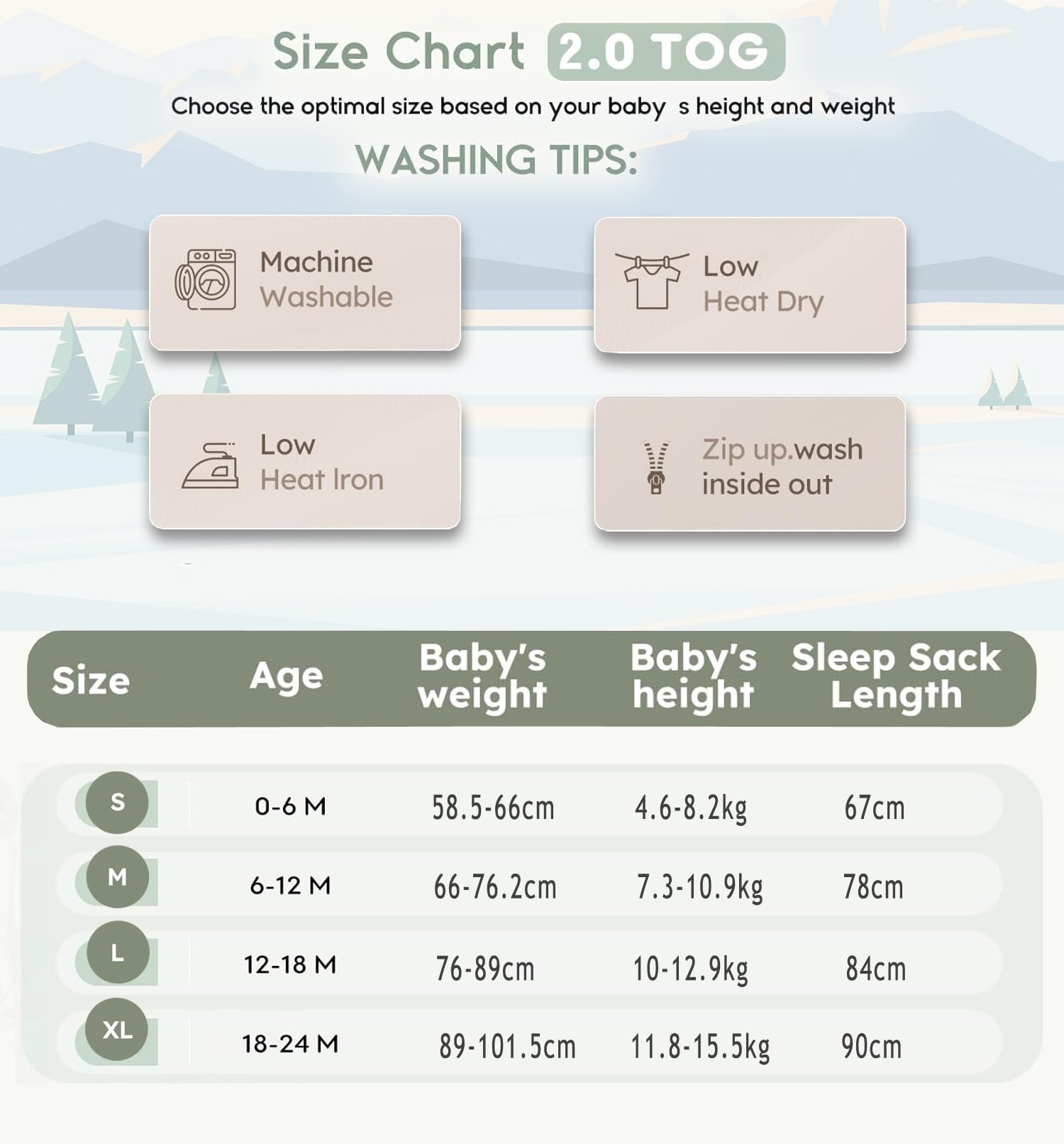 • 67 cm/0-6 months suitable for baby height 59-66 cm. 78 cm/6-12 months suitable for baby height 66-76 cm. 84 cm/12-18 months suitable for baby height 76-89 cm. 90 cm / 18-24 months suitable for baby height 89-102 cm. The appropriate size can be chosen according to the height of the baby.