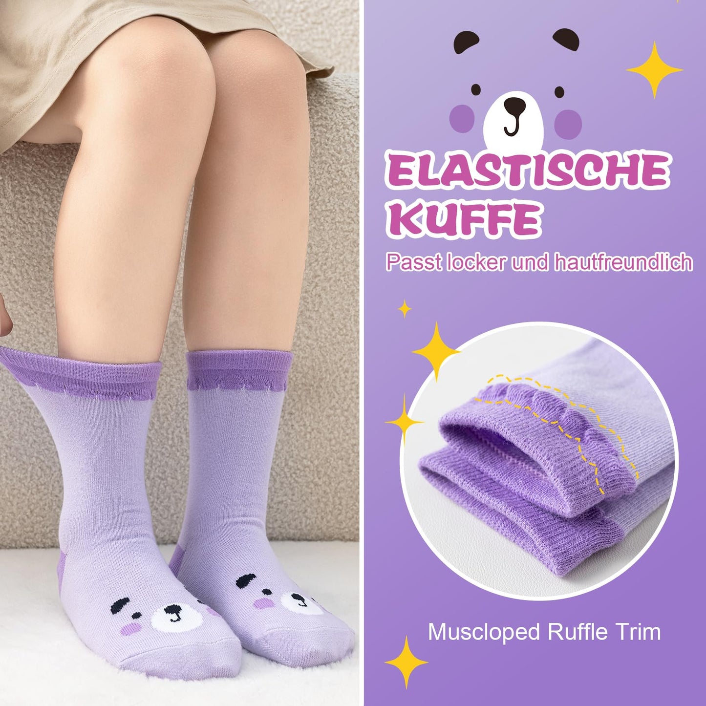 Das nahtlose Socken sorgt dafür, dass sich Ihre Kinder wohlfühlen. Das süße Cartoon-Tier-Design macht diese Socken zu einer tollen Geschenkidee für Mädchen, z. B. zum Geburtstag oder zu Weihnachten.