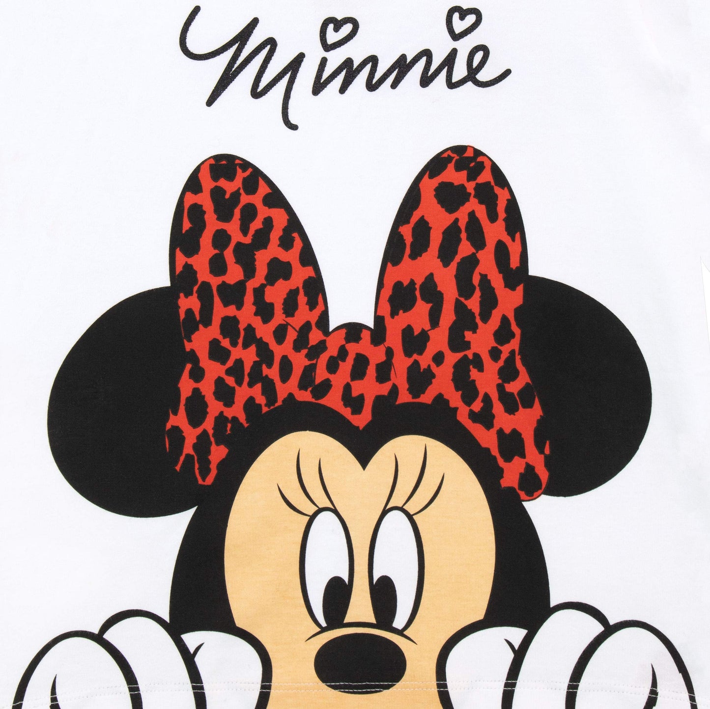 Minnie Maus T-Shirt für Mädchen. Mit einem großen Motiv von Minnie Maus mit ihrer ikonischen Schleife, aber diesmal in einem roten und schwarzen Leopardenprint. Mit diesem tollen weißen Oberteil, das mit roten Nähten an den Ärmeln versehen ist und "Minnie" mit Herzen in schwarzem Glitzer bestickt ist, sieht man immer stilvoll aus. Minnie ist am unteren Ende des Shirts zu sehen und spielt das Guck-Guck Spiel, Ihre kleine Maus wird sicherlich stundenlang mit ihr dieses Spiel spielen wollen.