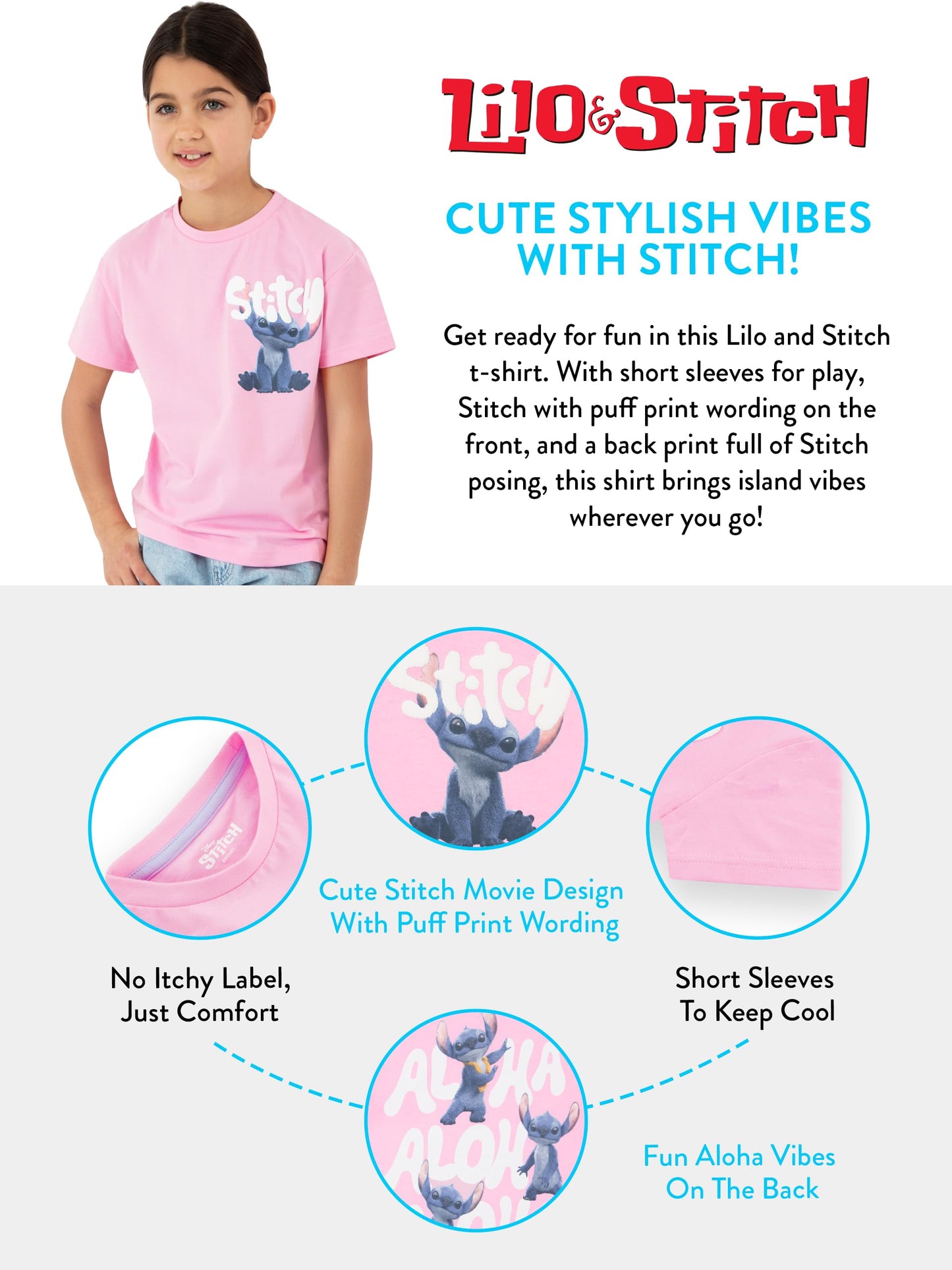 • Doppelseitiges Stitch-Design: Dieses Lilo und Stitch-T-Shirt, das Mädchen gerne tragen werden, zeigt Stitch, auf der Vorderseite wie er lächelt, mit seinem Namen in kräftigem weißem Puffdruck und einer großen Grafik auf der Rückseite, die Stitch in mehreren süßen Posen zeigt, umgeben von „Aloha“ – eine lustige Variante für Fans von Lilo & Stitch