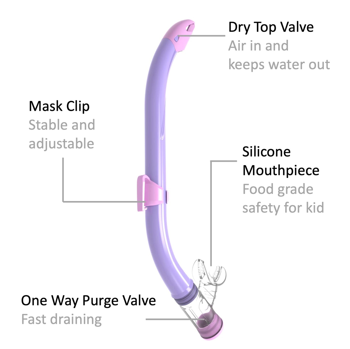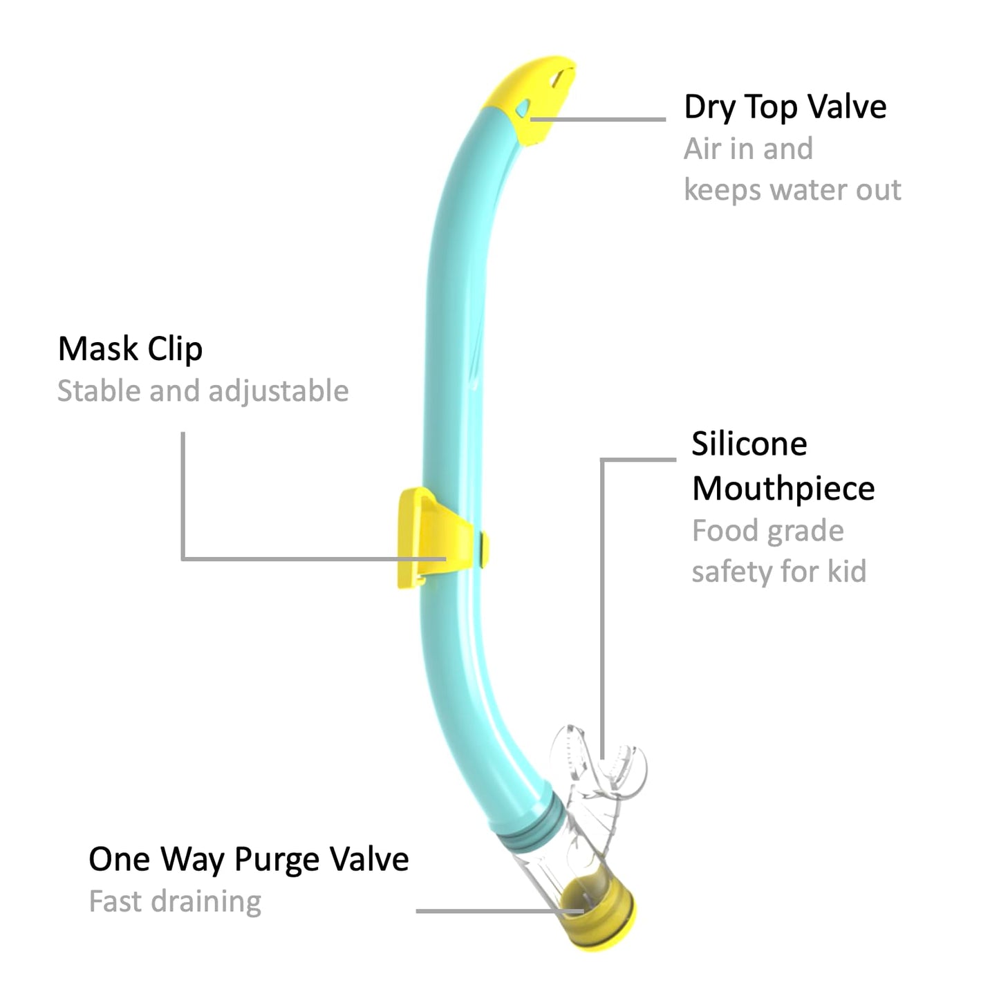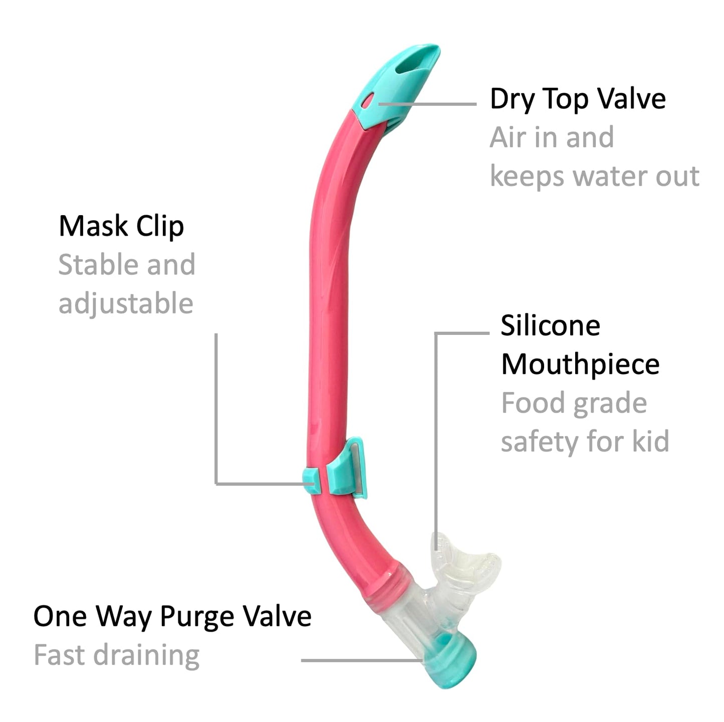 • Easy Breathing with Dry Snorkel: The snorkel is equipped with a dry top system that prevents water from entering and makes breathing easier even when diving. The wider diameter of the snorkel tube ensures smoother breathing, and the included hose clamp attaches to the mask, leaving your child's hands free.