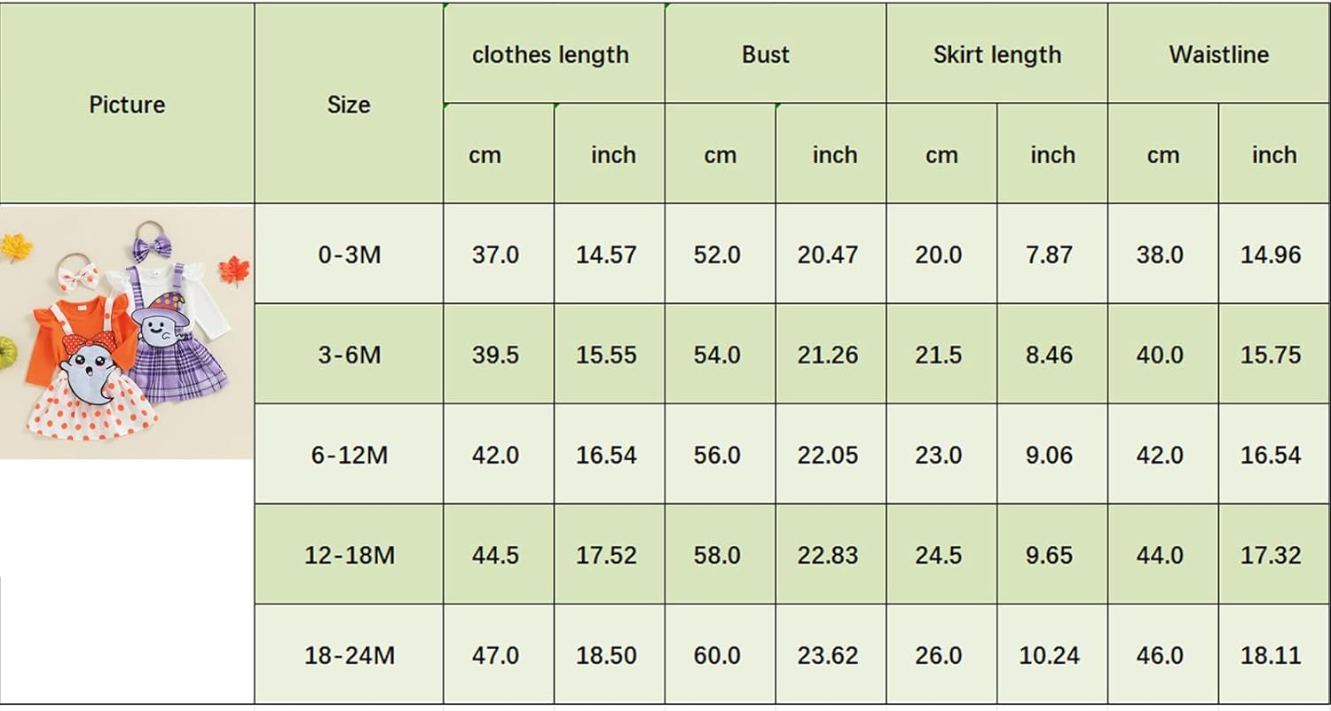 • Tip: it is a great Halloween or party gift for a little girl. Make up a girl fashion and cute with this clothing set. A variety of sizes for babies from 0 to 24 months. Please check the size chart carefully before purchasing.