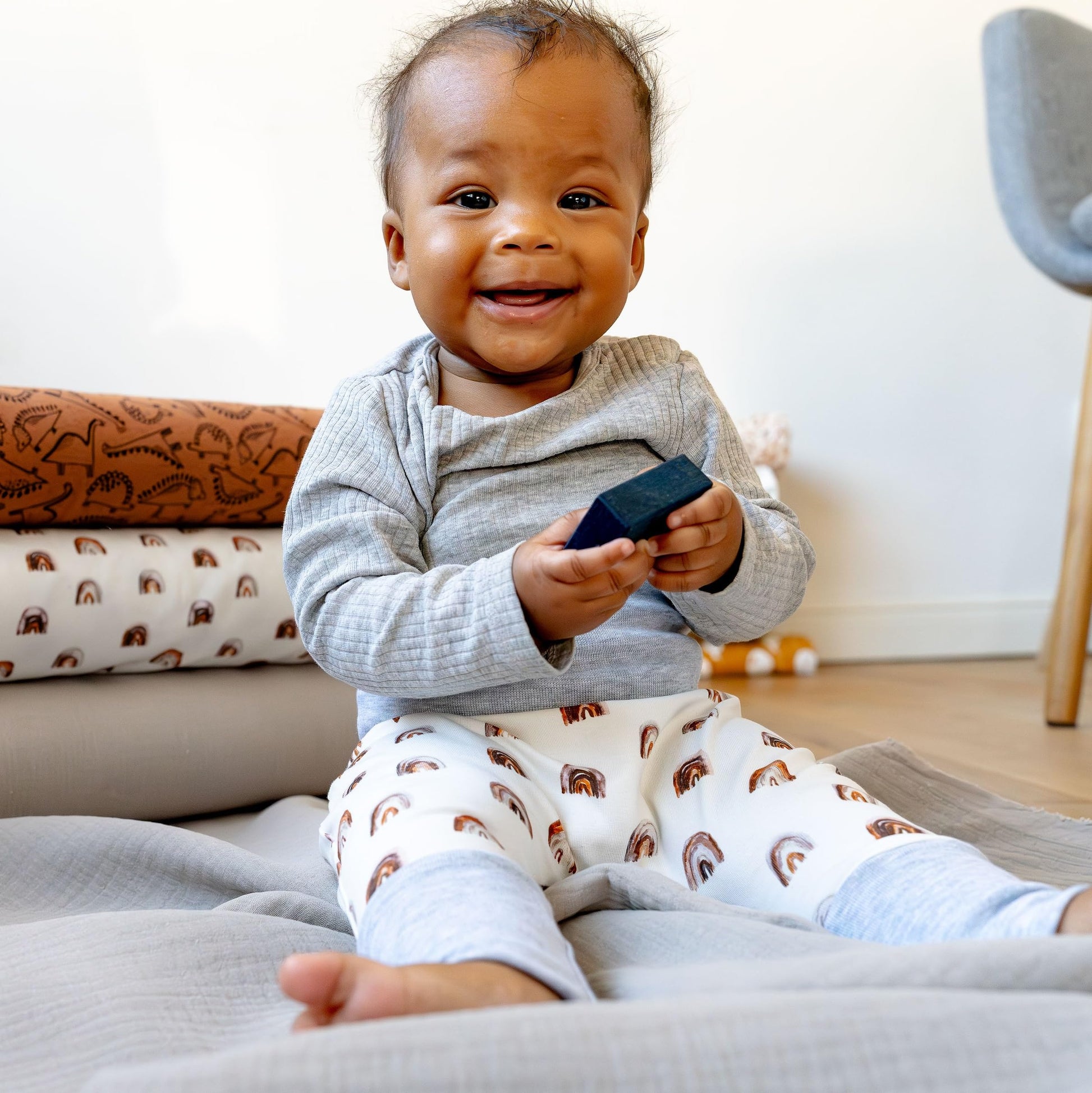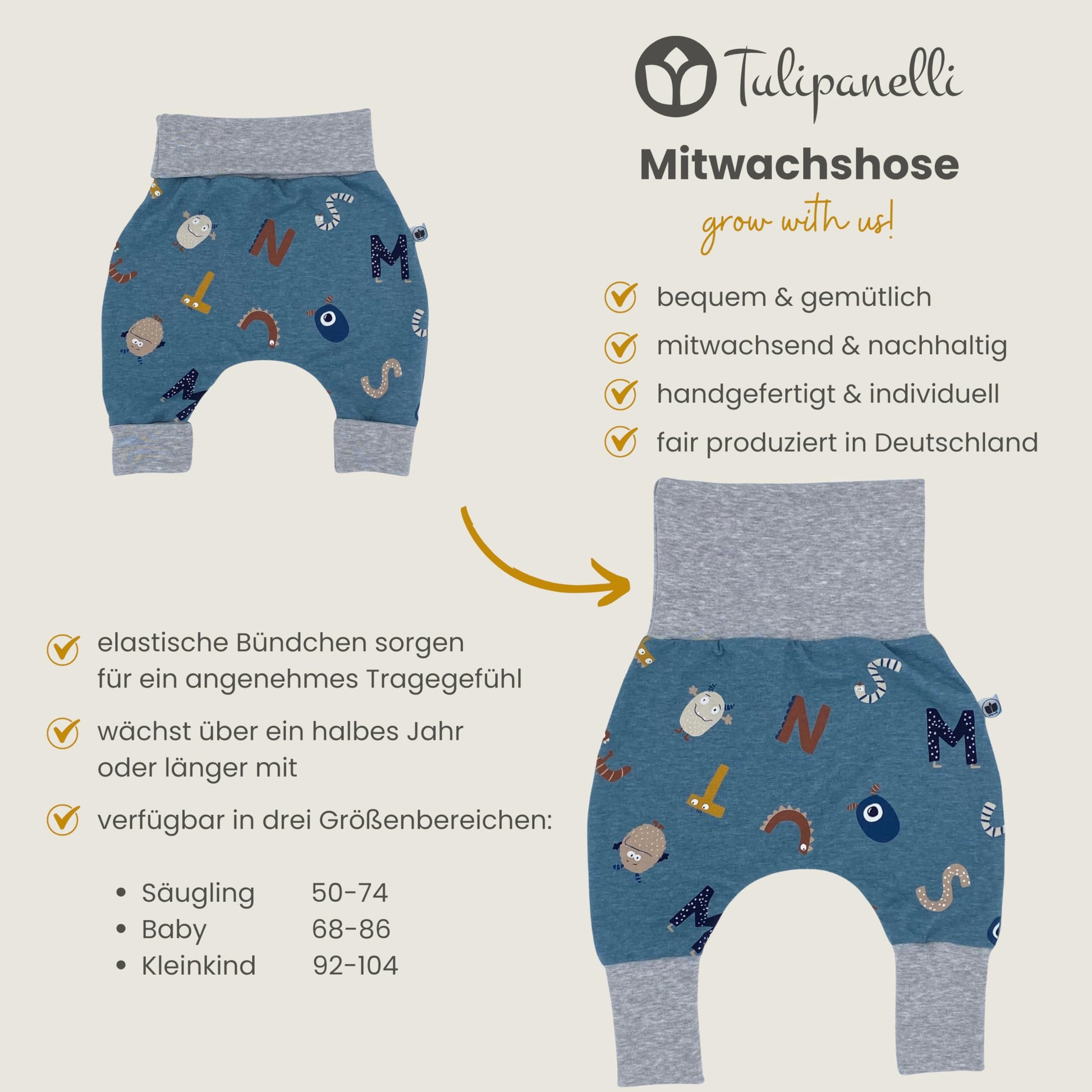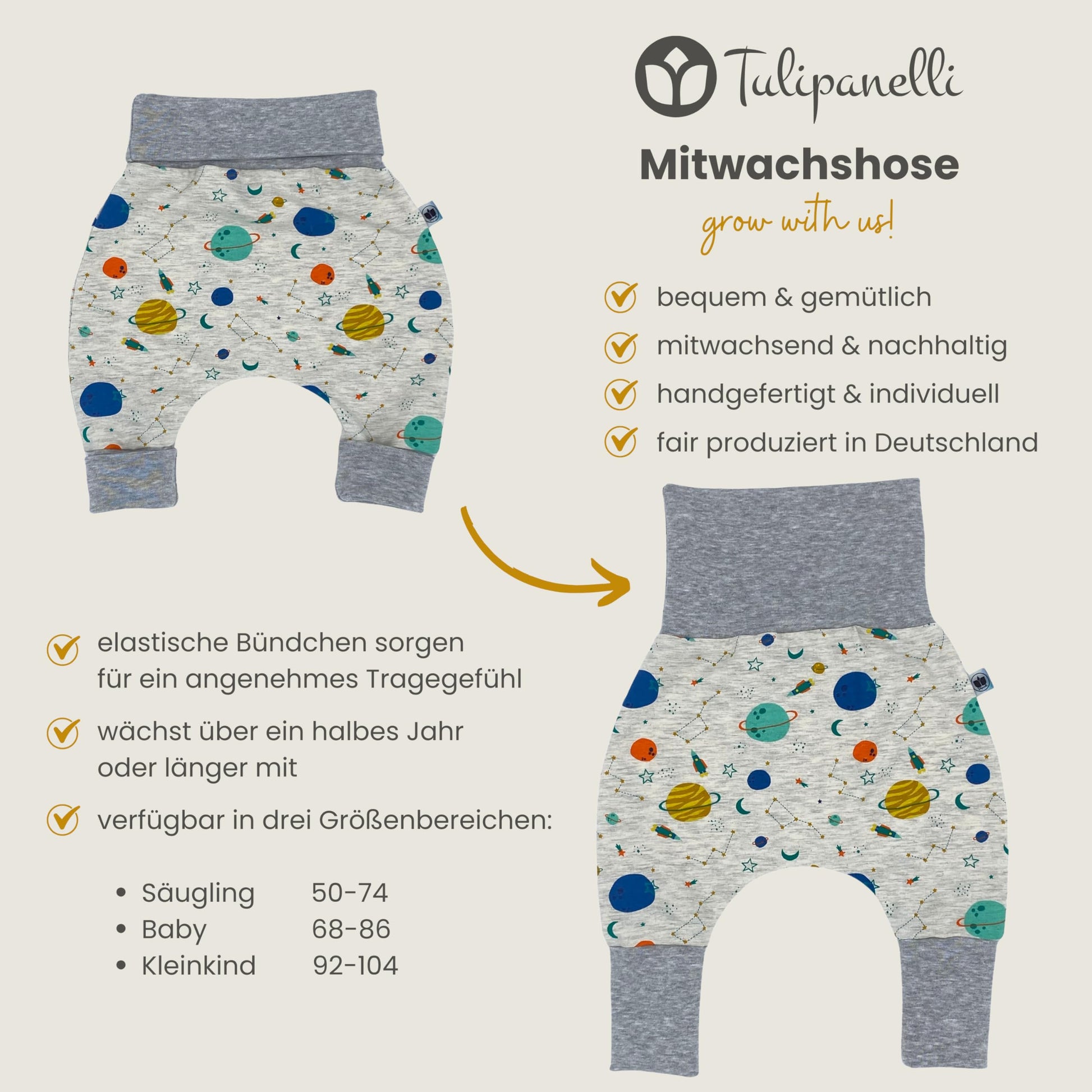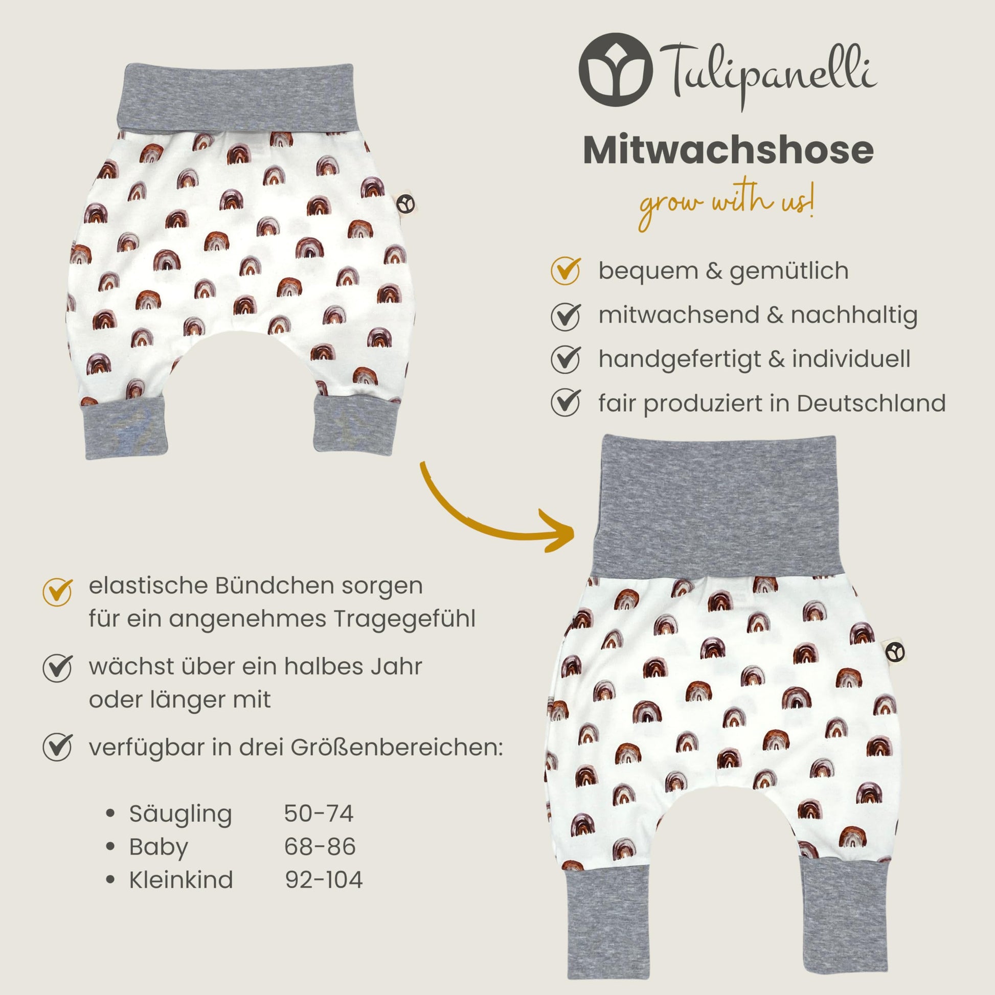 Our grow trousers made of cotton jersey offer your baby a high level of comfort thanks to soft and elastic cuffs. They grow with your child for many months, possibly even years. You can control the "growing with you" by turning the stomach and leg cuffs yourself. So one of our baggy trousers can become a real favourite piece in the baby's wardrobe.