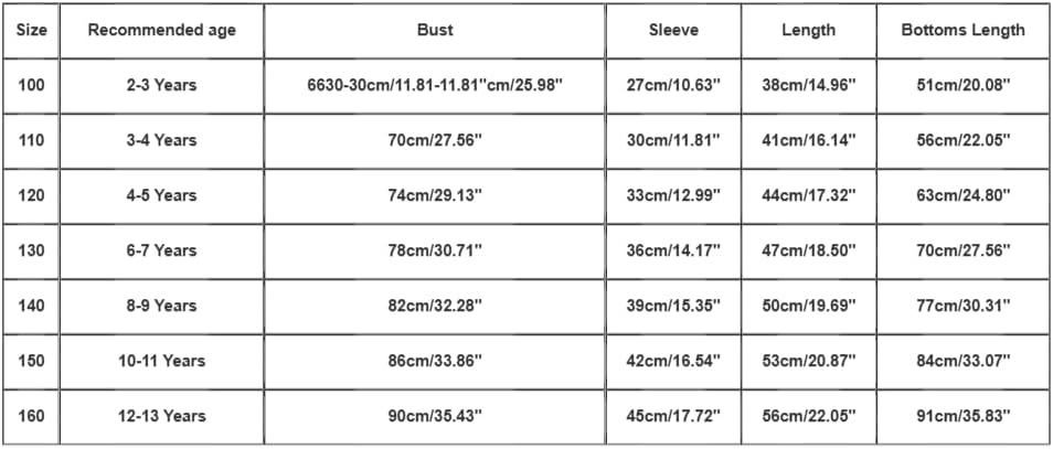 Altersempfehlung: 12–13 Jahre, Brustumfang: 90 cm, Ärmel: 45 cm, Länge: 56 cm, Hosenlänge: 91 cm.