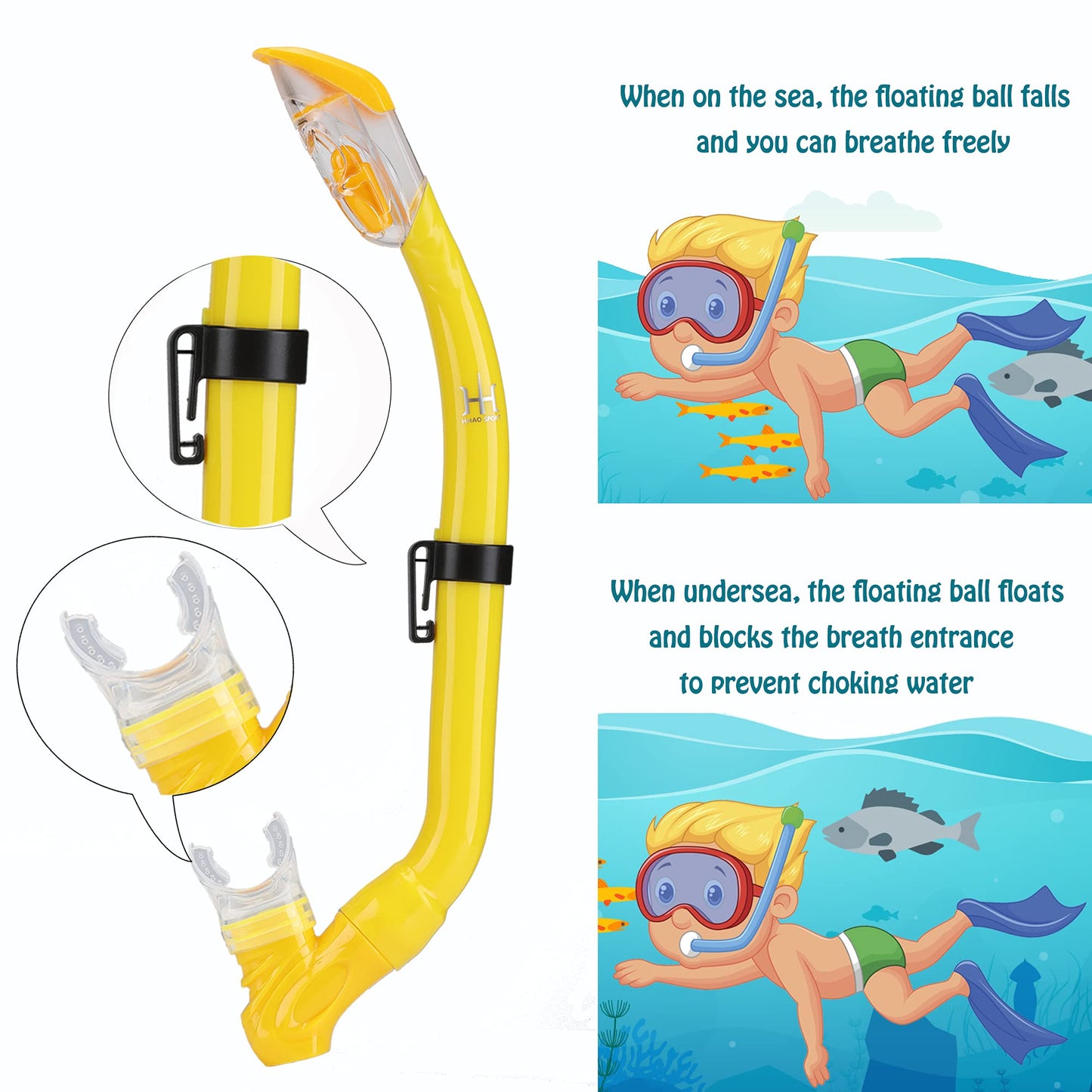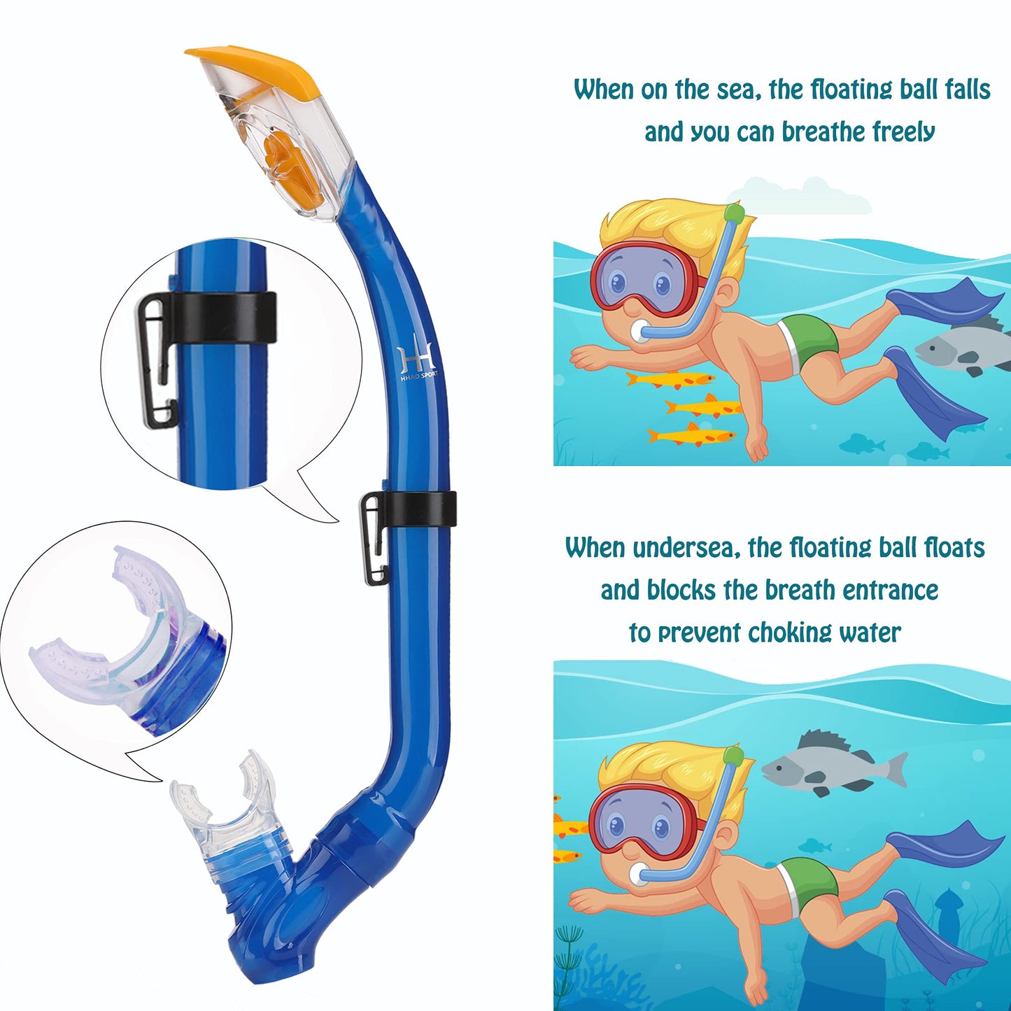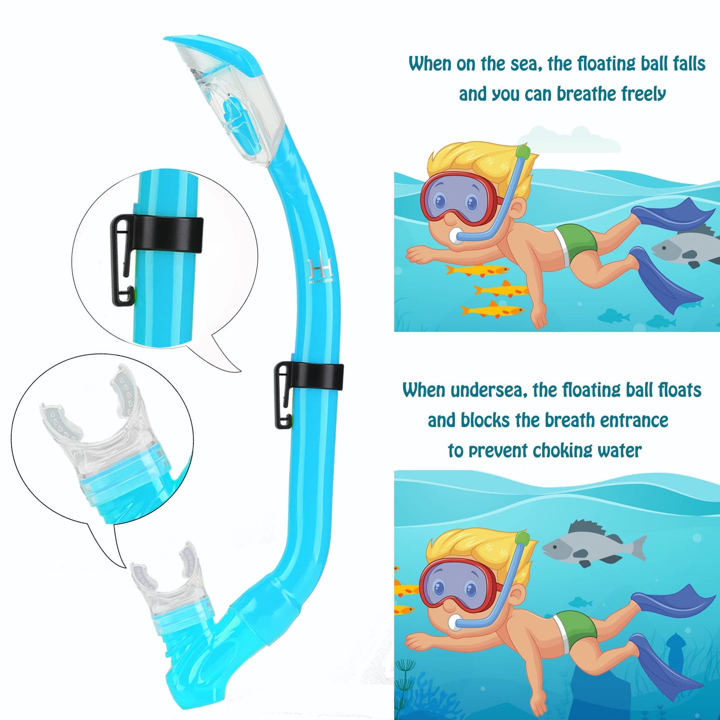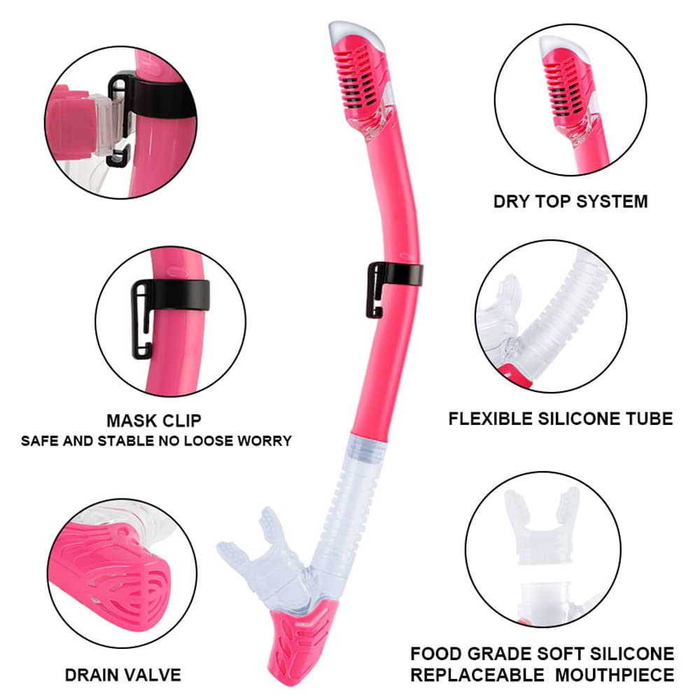 • Dry Top Snorkel: The dry top system is very friendly for beginners and children. The snorkel is a one-way inhalation valve and on the top there is a movable floating ball to close the hose entrance and prevent water from entering when the top of the breathing tube is underwater.