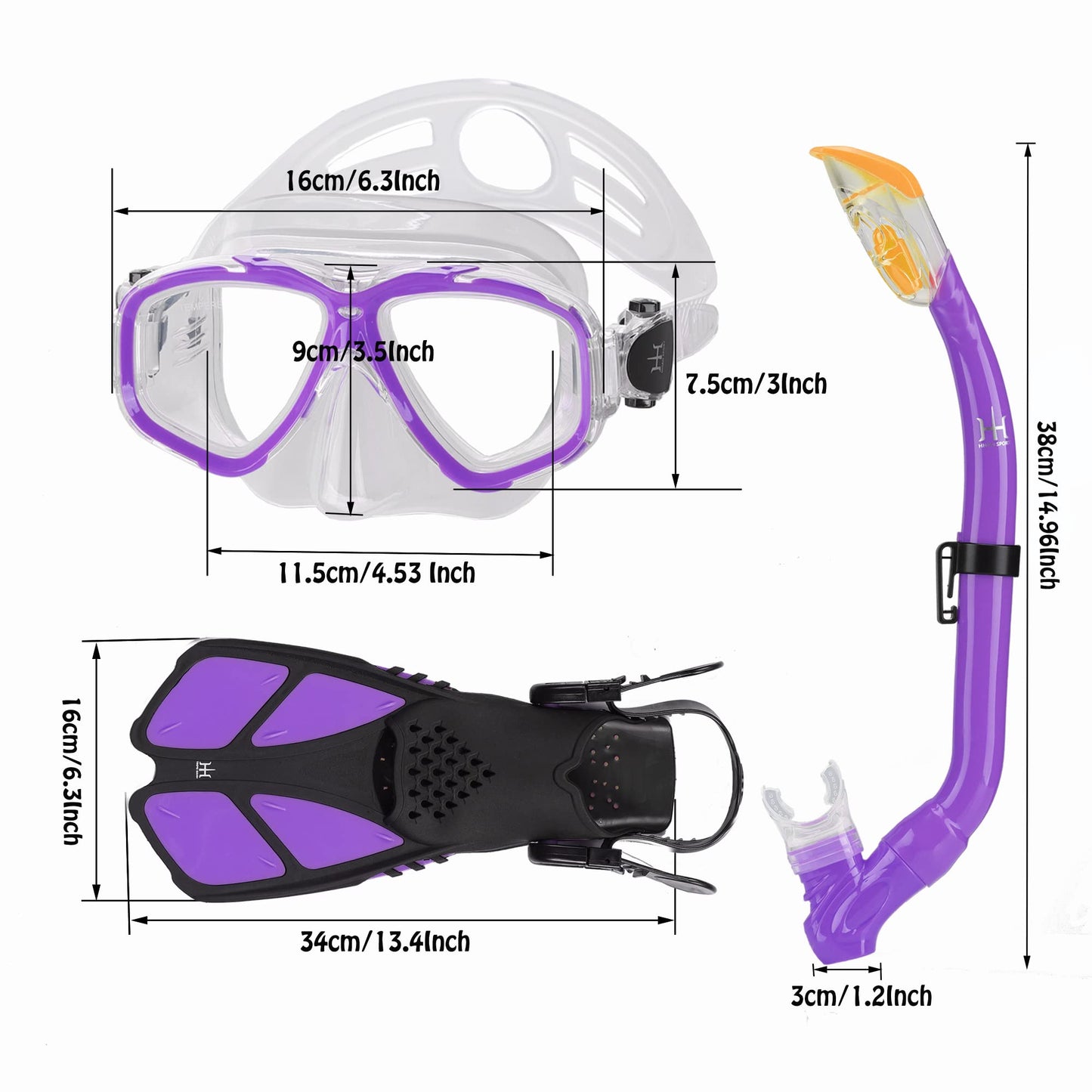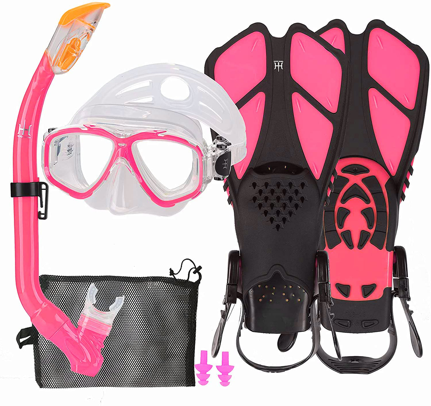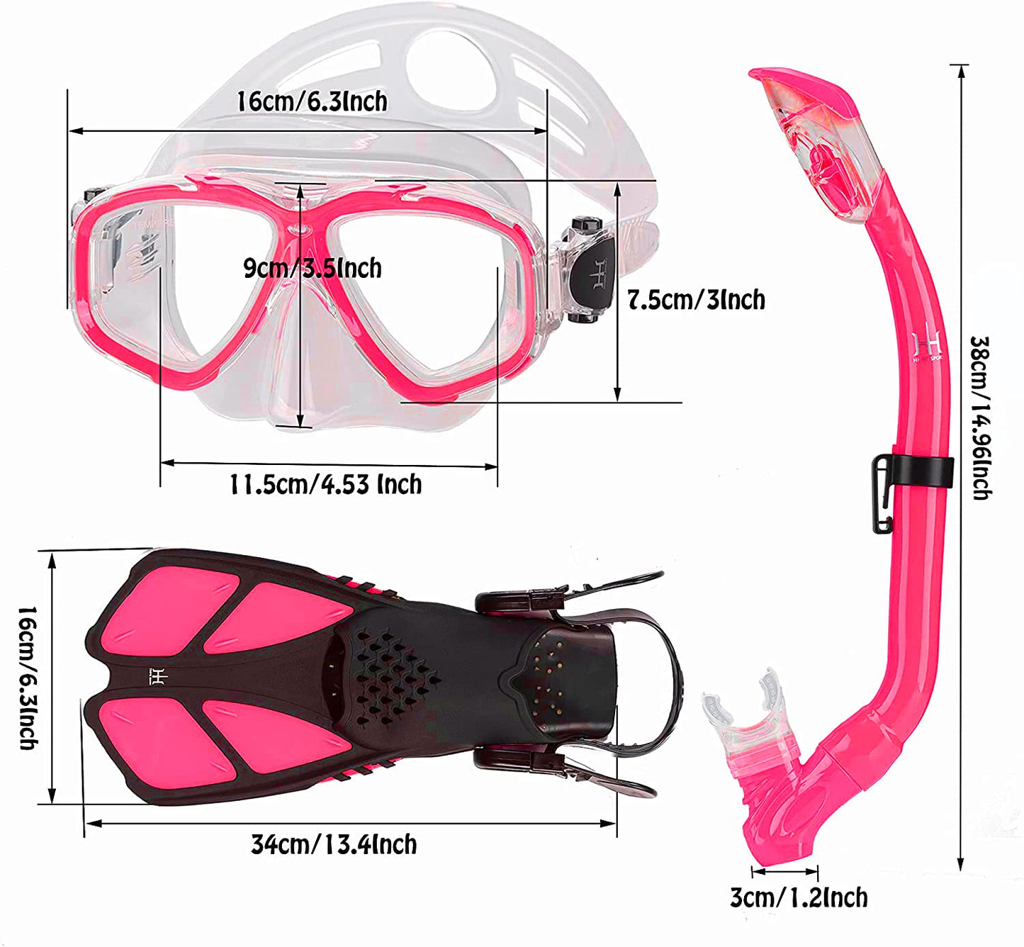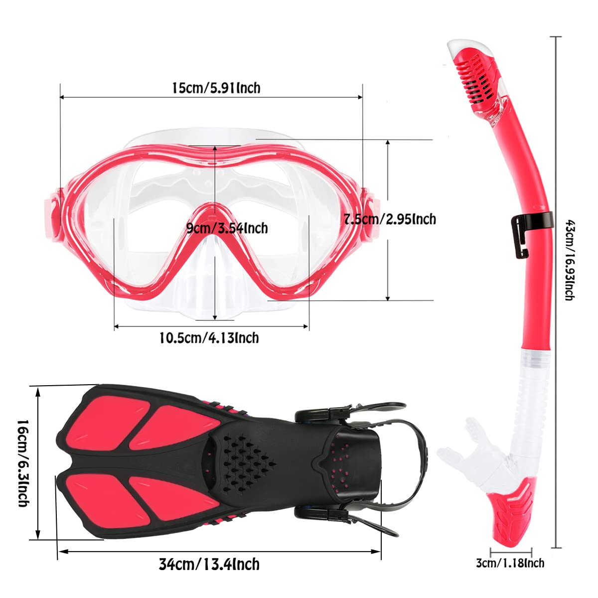 • All-in-one snorkel set, you are prepared for everything: a complete gear diving kit is just perfect for your 5-12 year old kids to explore swimming and diving. The snorkel set for kids includes diving goggles, flippers, and snorkels, a quick dry mesh bag and 1 pair of soft silicone earplugs.