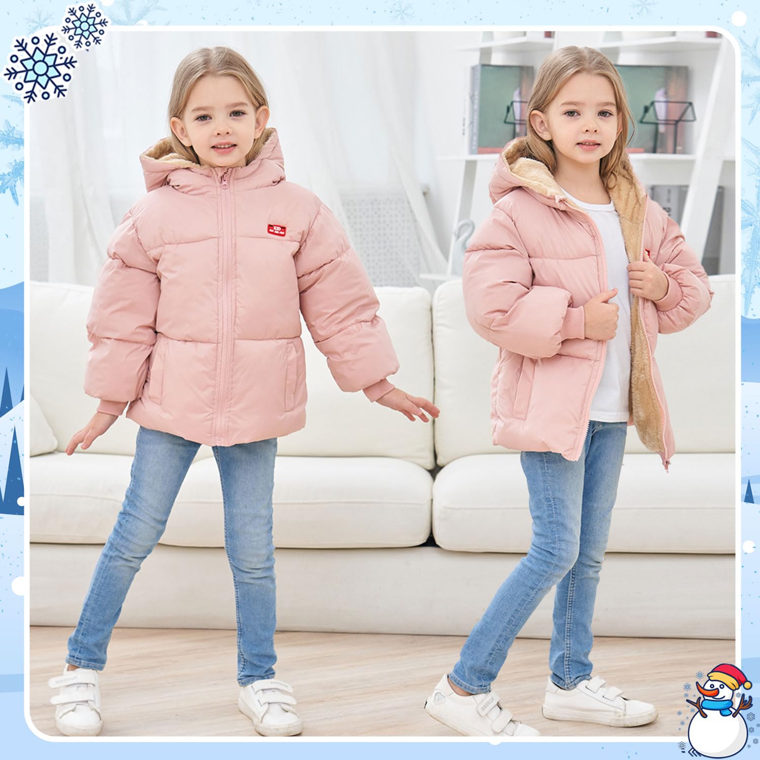 - Design:Fashion hooded coat for kids Zipper Closure - Easy for little kids to put on and take off. Collar design with zip protection, can protect your baby's chin. The hood is not removable, protects your head and neck from the cold. Two slanted pockets and elastic, windproof cuffs keep the heat in place.