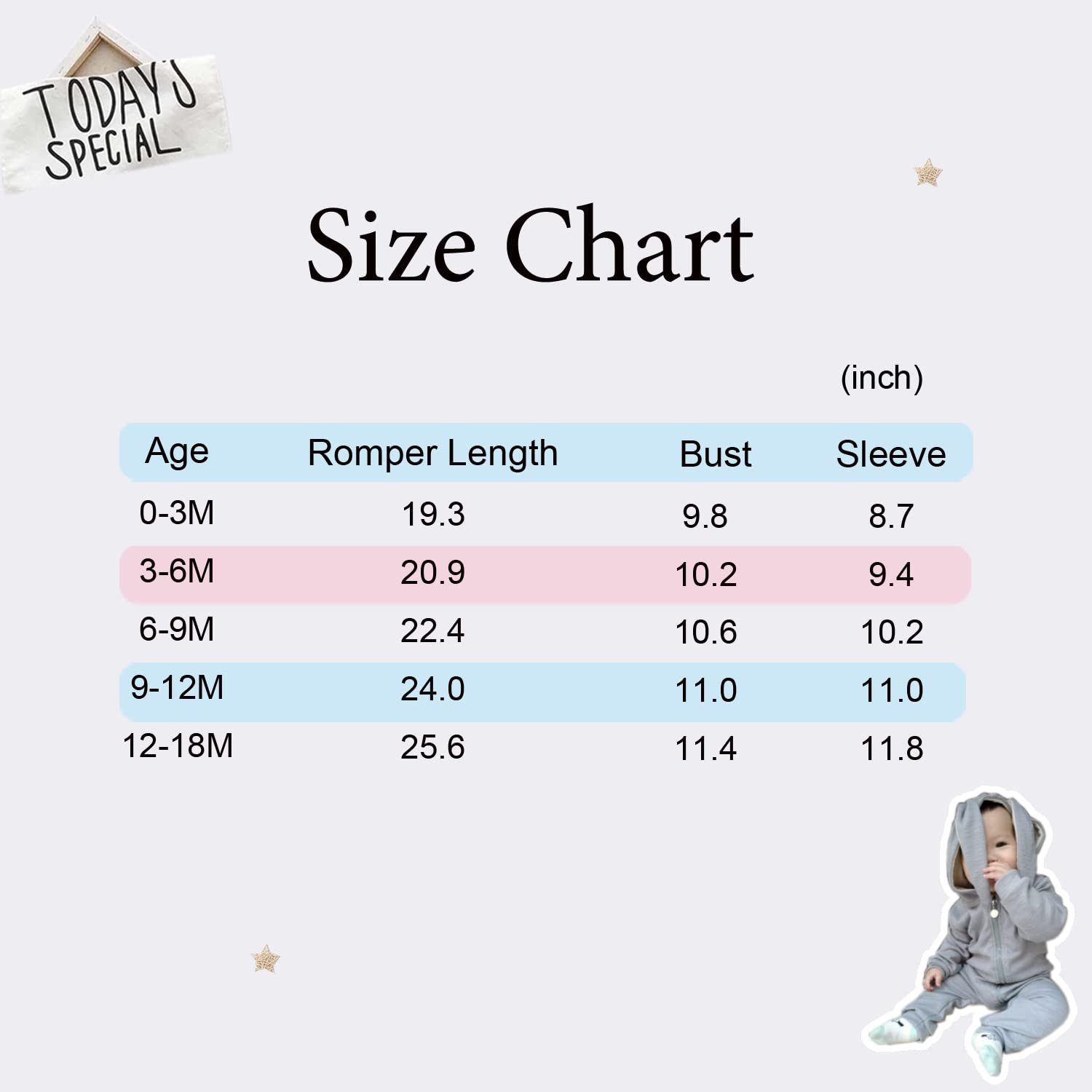 Alter (3–6 Monate): Oberteillänge 21 Zoll, Brustumfang 10,5 Zoll, Ärmellänge 9,8 Zoll.