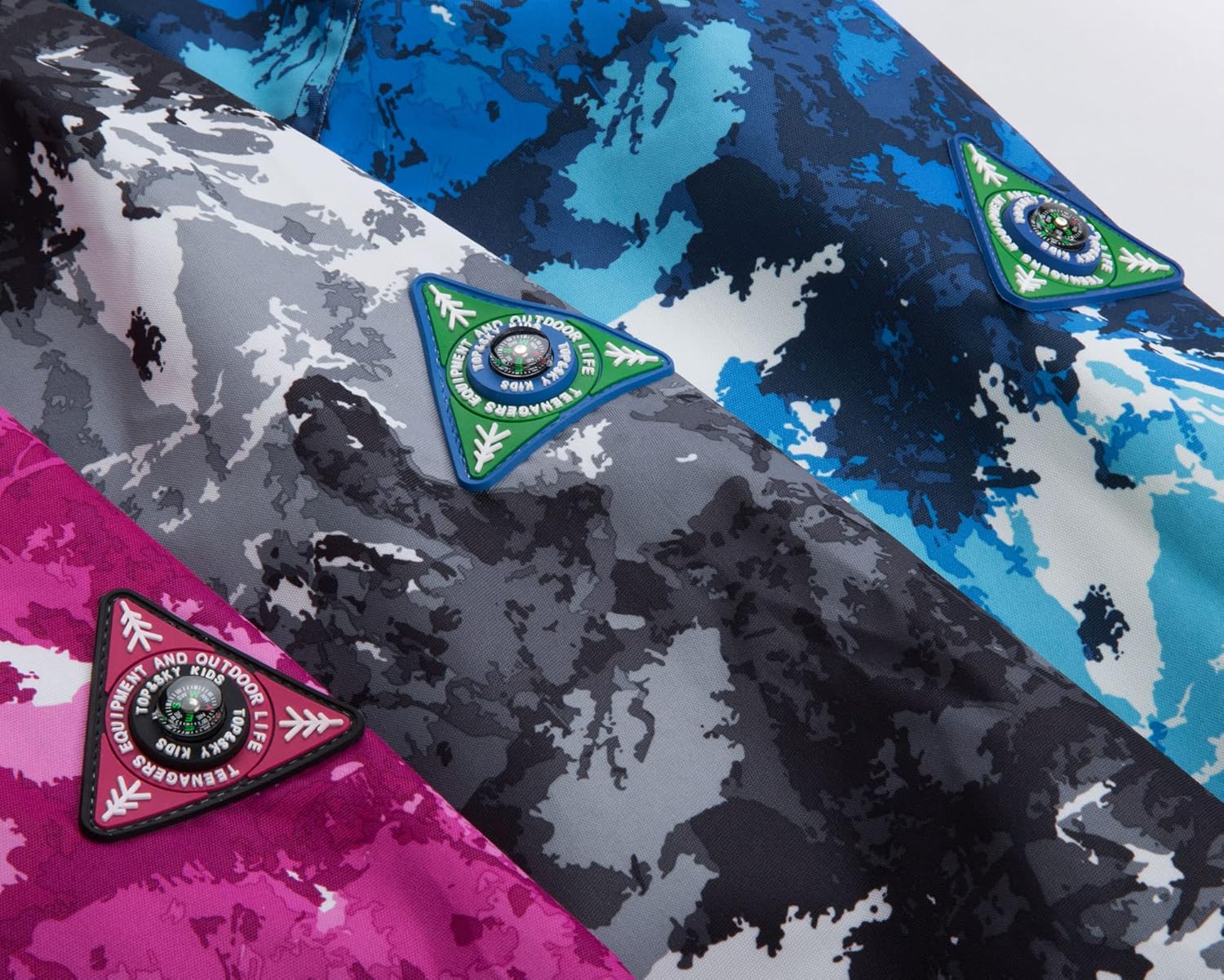 • Children’s camouflage windbreaker with patchwork design. On the left arm there is a compass.