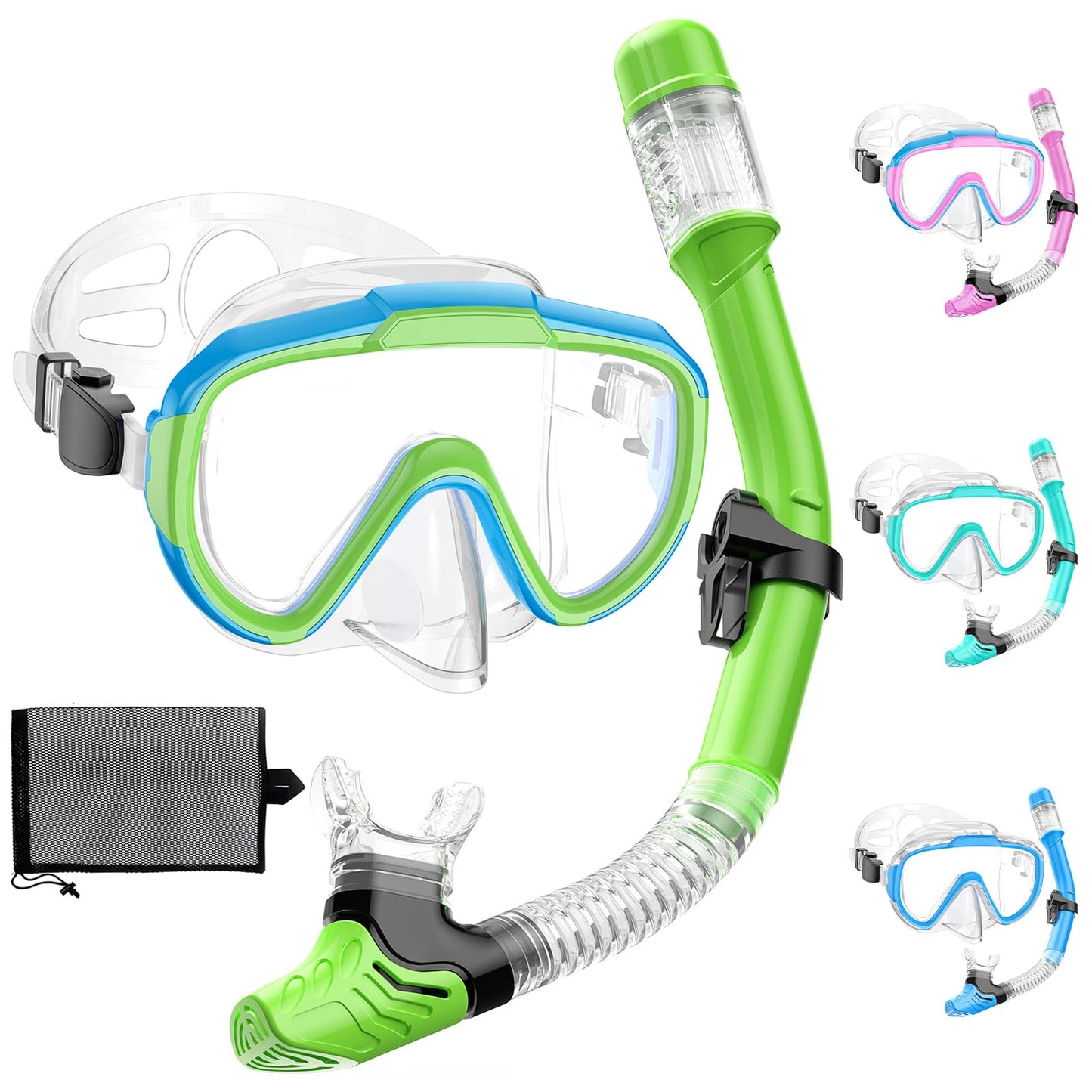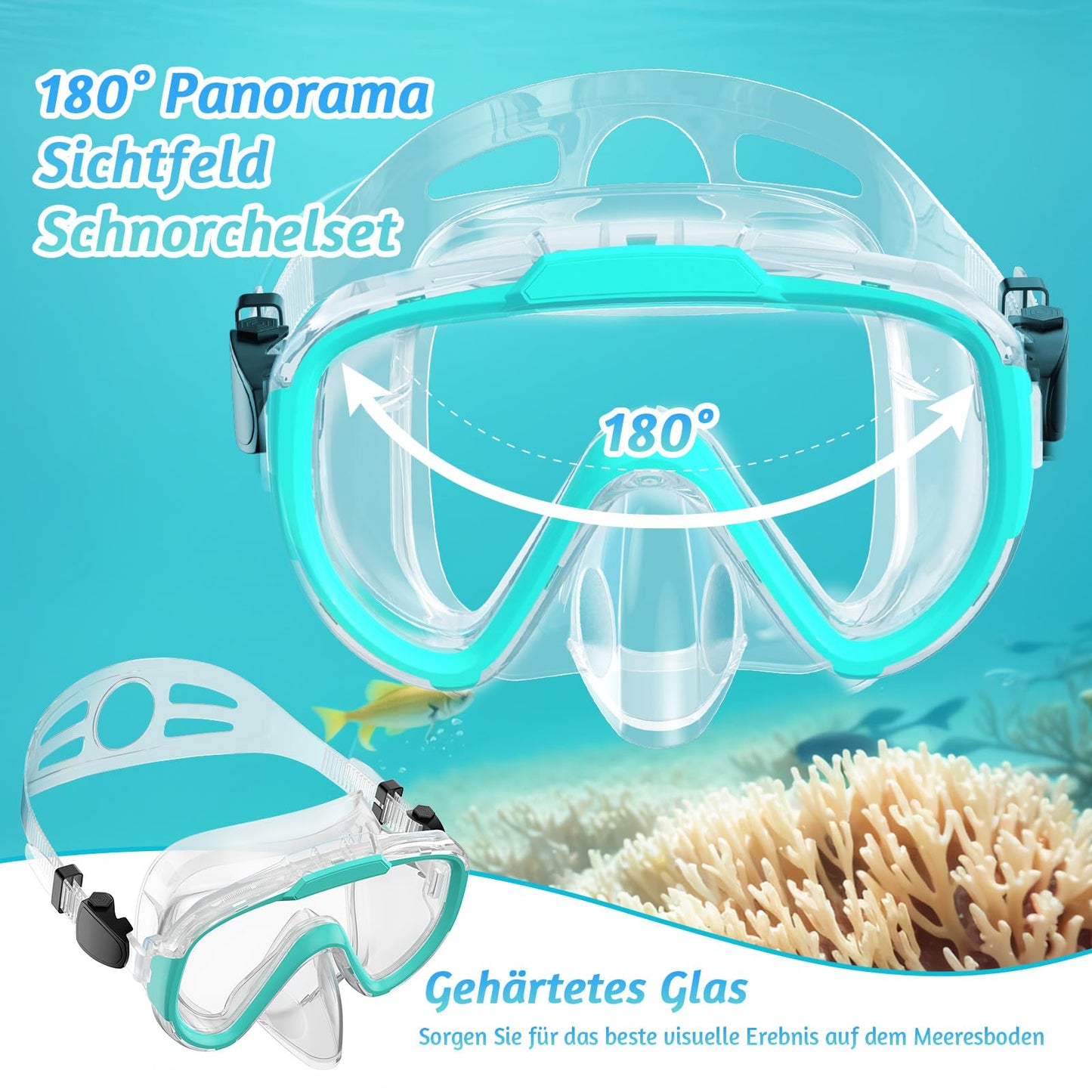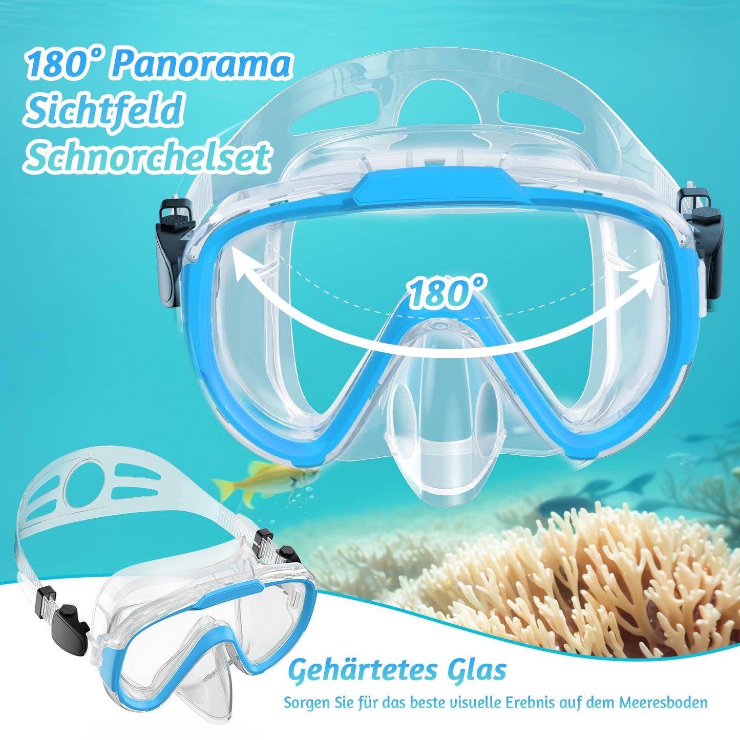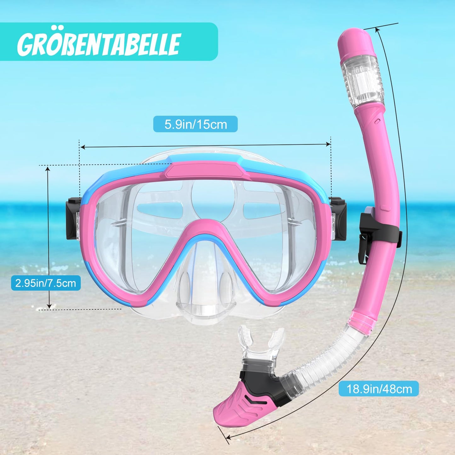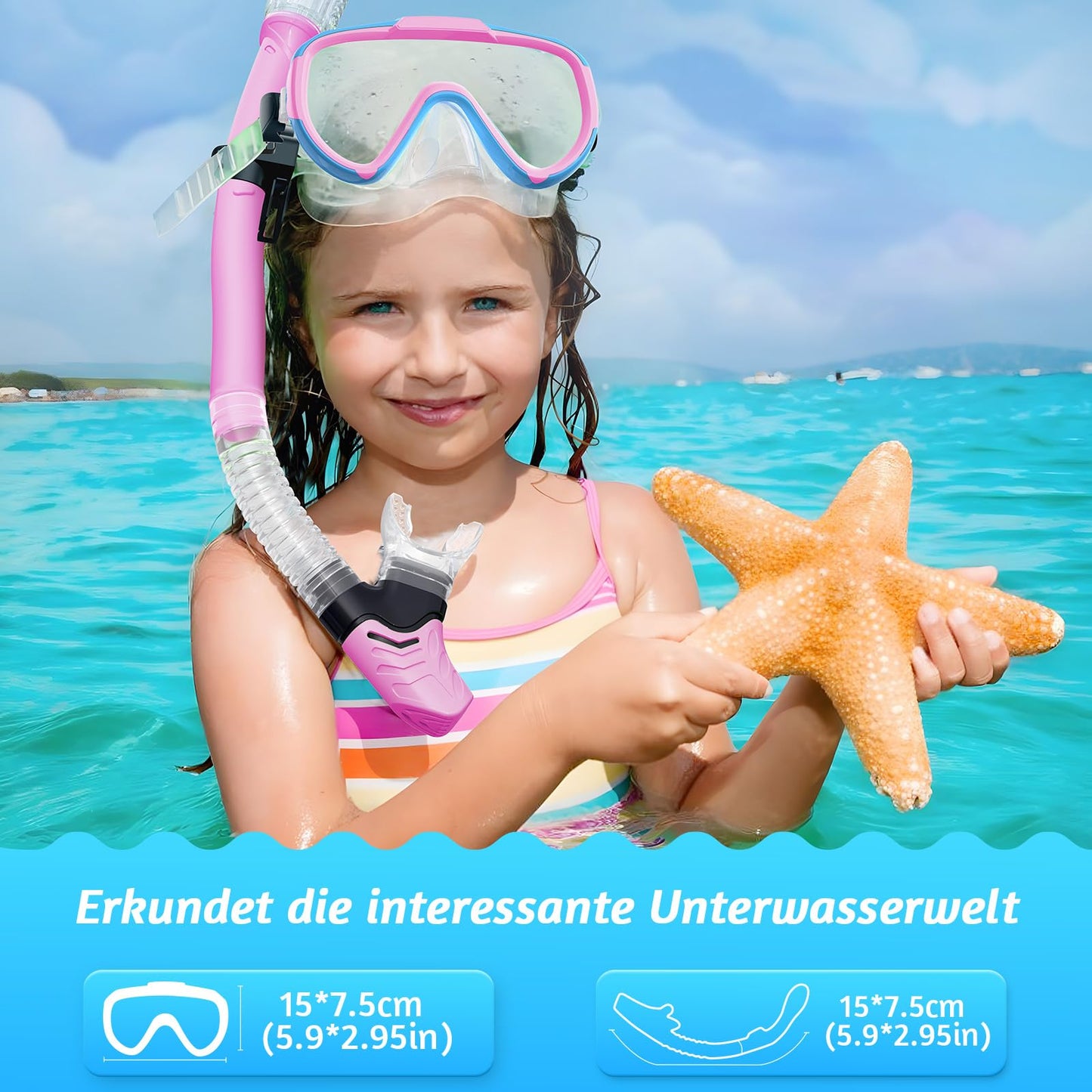 • Ultra comfortable silicone skirt: the apron The snorkel set is made of hypoallergenic silicone material, which does not cause allergies or discomfort on the children's face. Thanks to the elastic silicone that seals the face comfortably, the diving mask is suitable for children with different face shapes. So your child can explore the underwater world and experience the allure of snorkelling.
