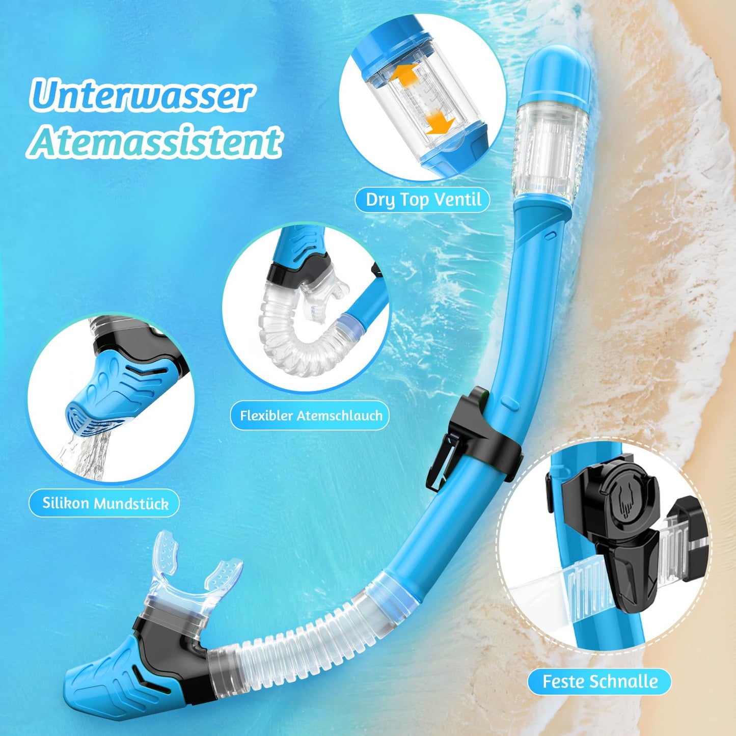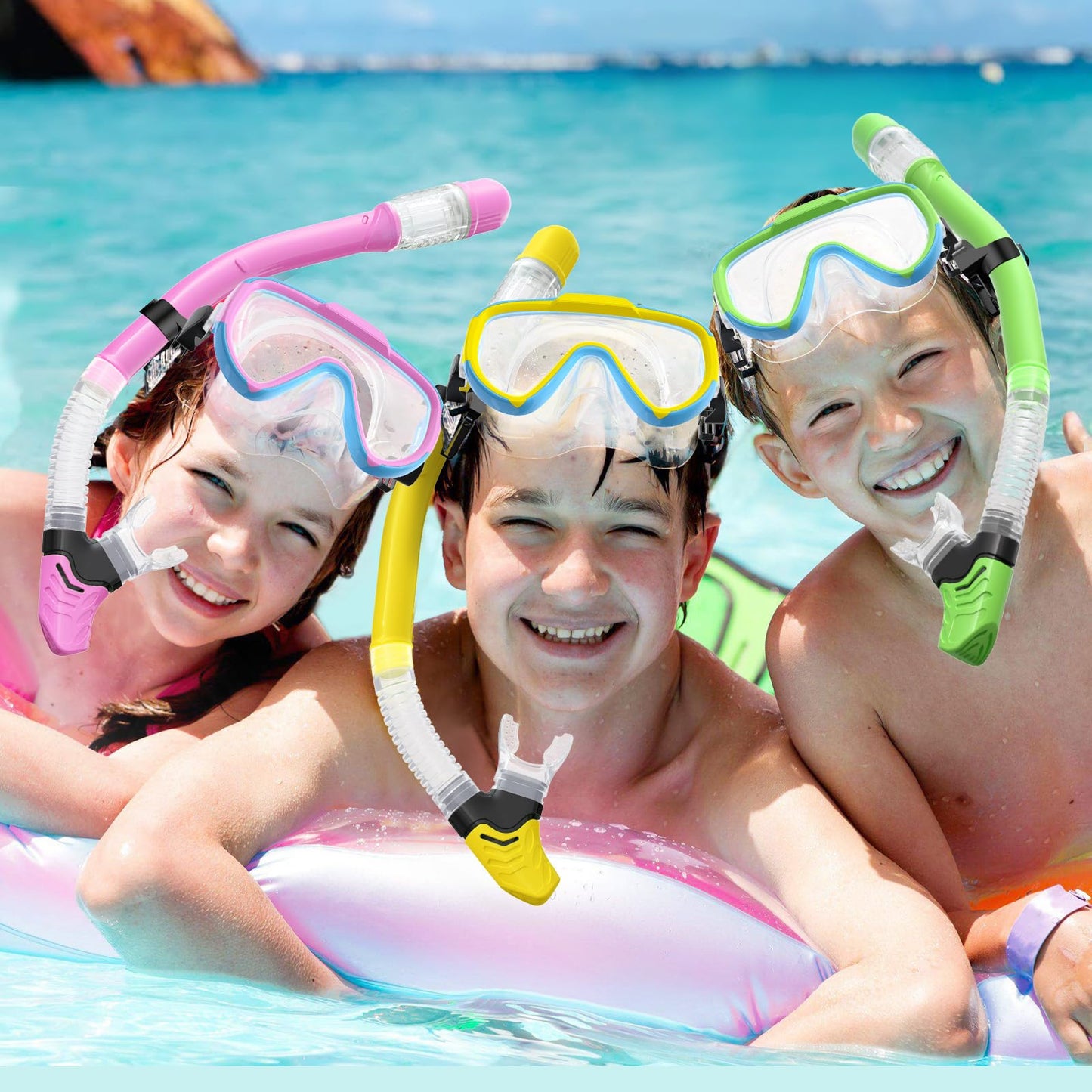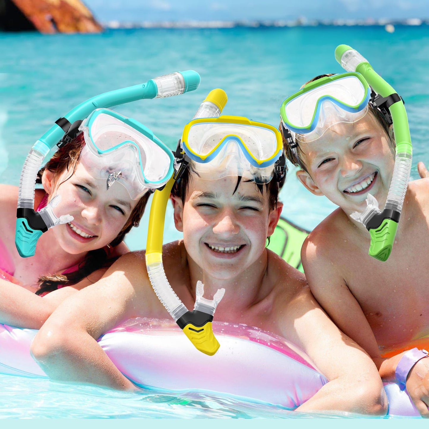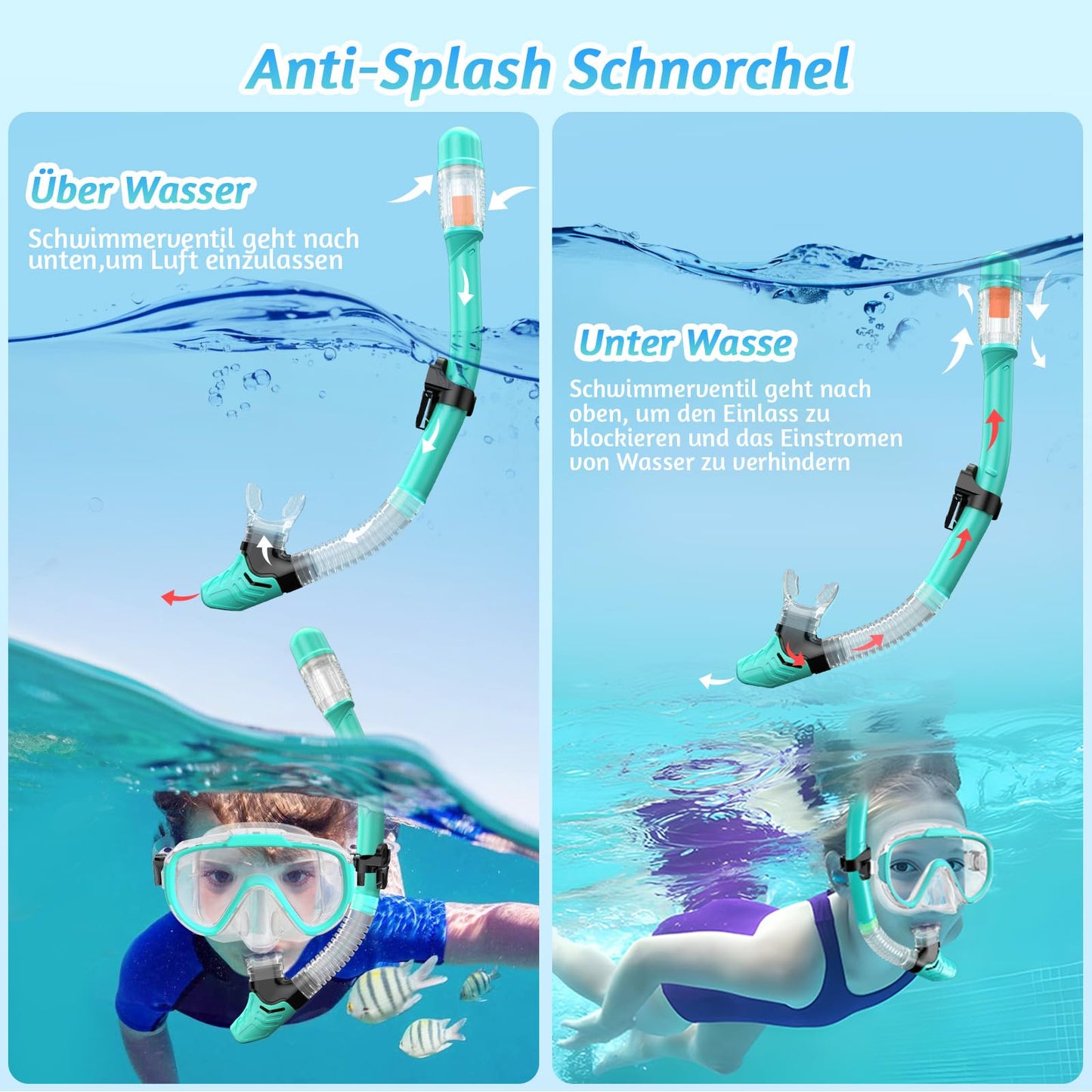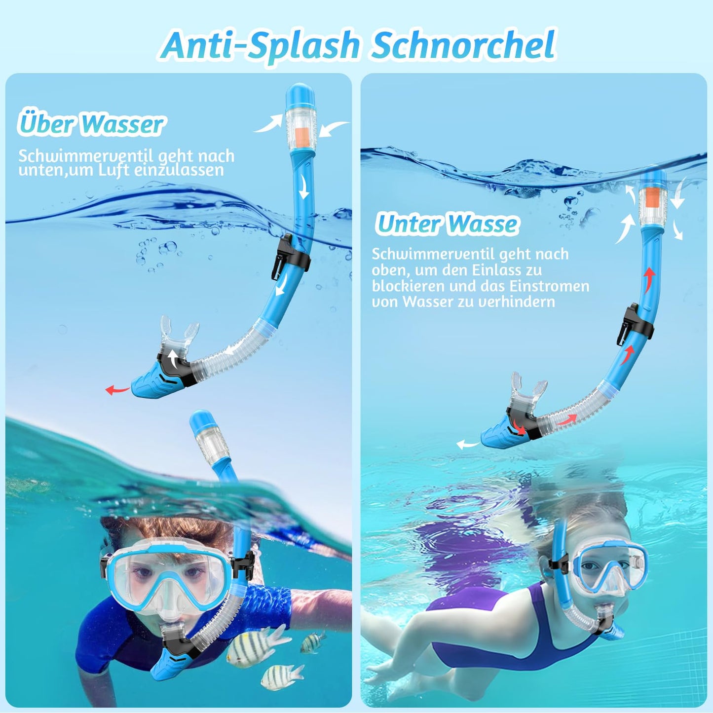 • Ultra comfortable silicone skirt: the apron The snorkel set is made of hypoallergenic silicone material, which does not cause allergies or discomfort on the children's face. Thanks to the elastic silicone that seals the face comfortably, the diving mask is suitable for children with different face shapes. So your child can explore the underwater world and experience the allure of snorkelling.