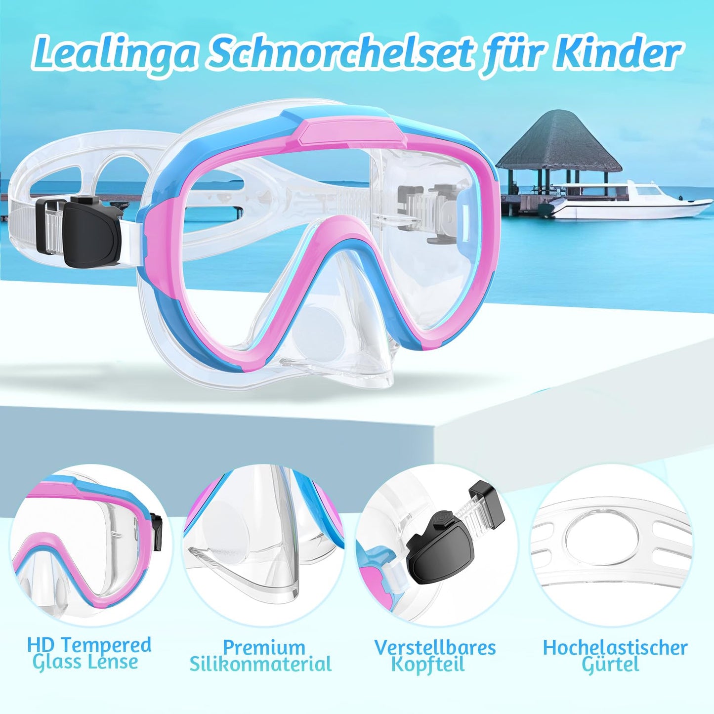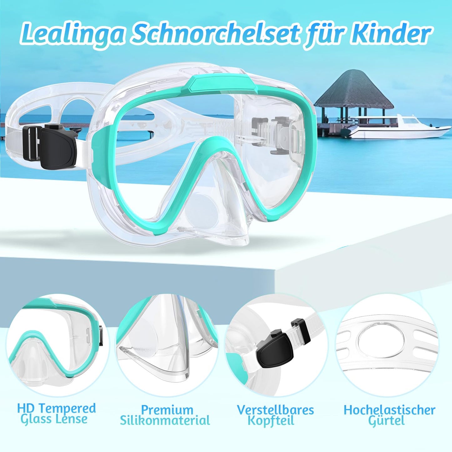 • Professional diving goggles with snorkel children: the Lealinga snorkel set for children is equipped with tempered glass panels that withstand pressure in deep water and do not shatter. Thanks to the all-glass design and anti-fog treatment, children can discover the lively fish and delicate corals under the sea with a bright and clear view. Available in a wide range of colours.