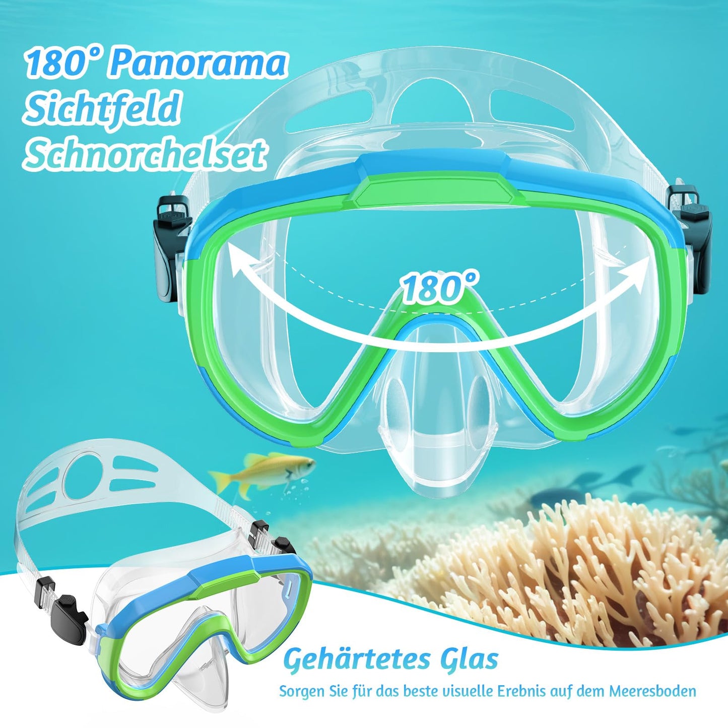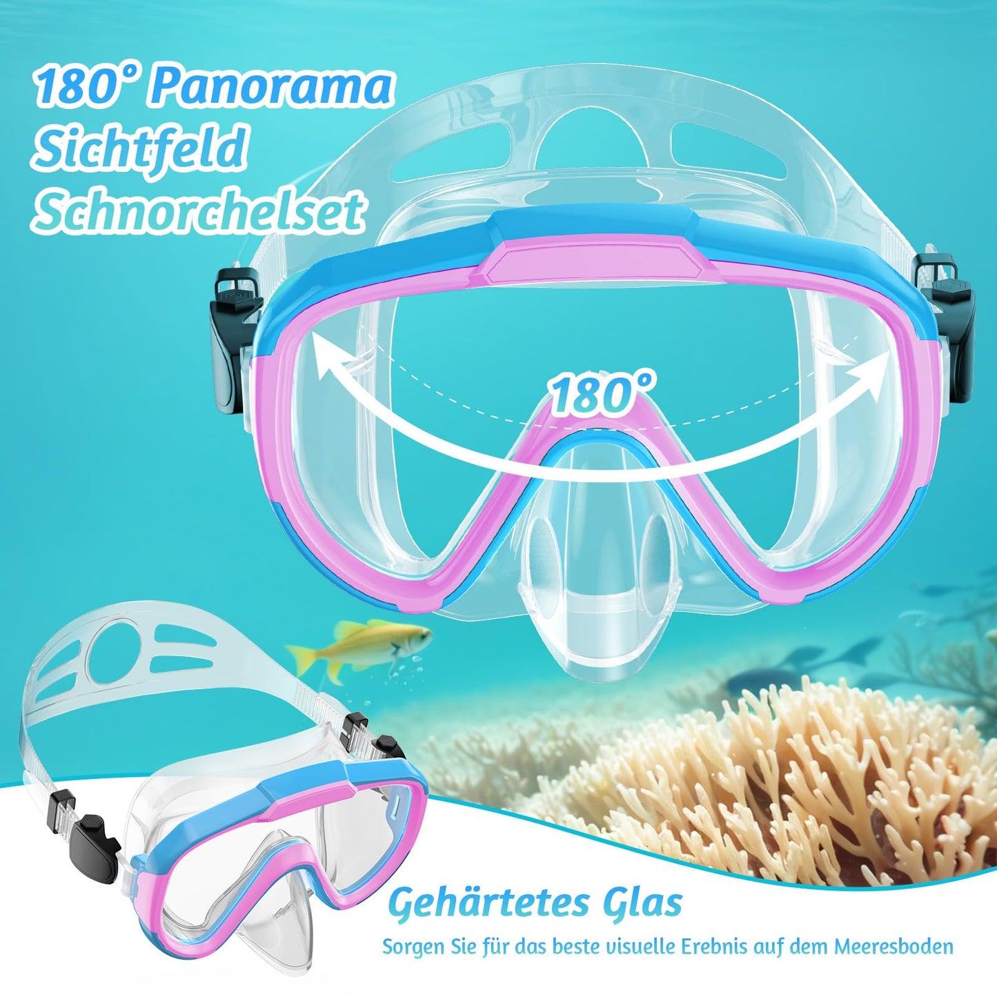 Lealinga Children's Snorkel Set with 180° Anti-Fog Panoramic Wide View Diving Mask and Dry Snorkel Snorkelling Set, Anti-Leak Snorkel Mask with Nose Protection for Boys and Girls