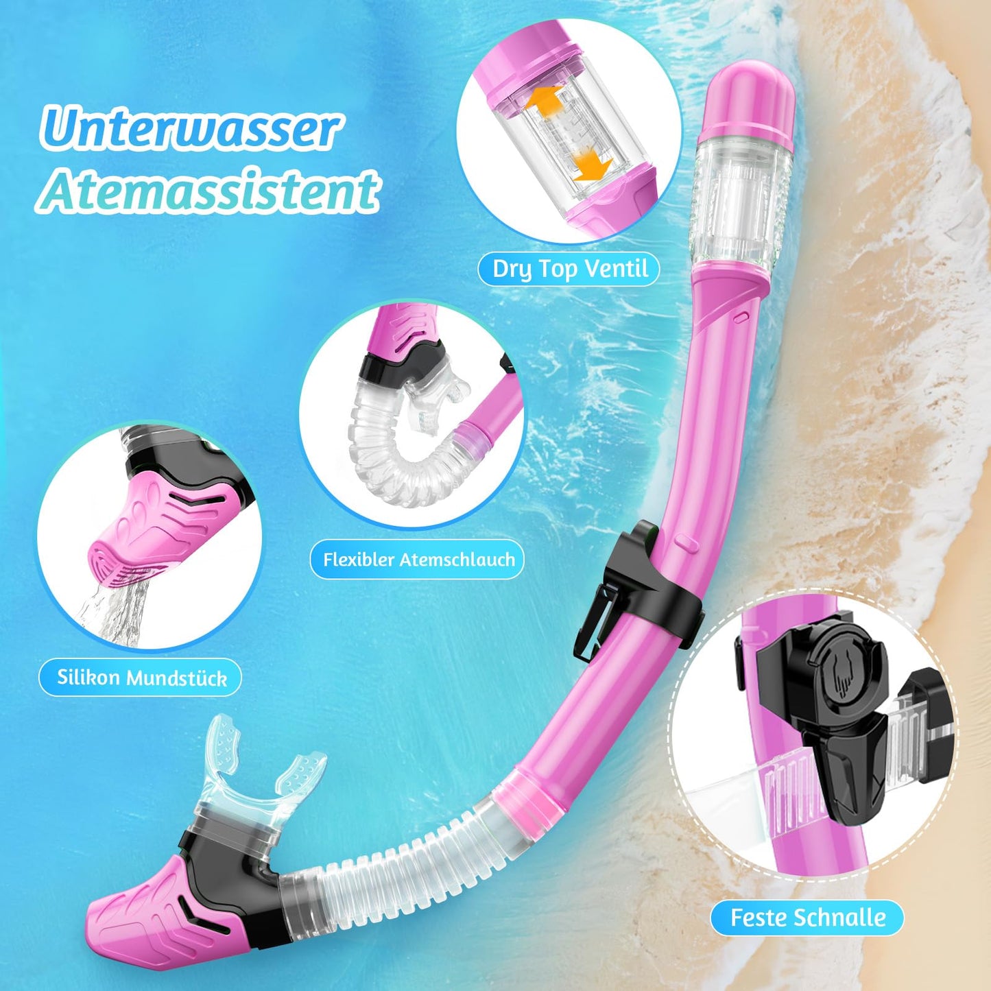 • Adjustable buckle design: the snorkel set has an adjustable strap. Simply press the two black buttons on the ribbon to adjust the length for different ages. The snorkel mask can be attached to the children's snorkel with a clip, so that your child has their hands free and can enjoy diving without any problems.