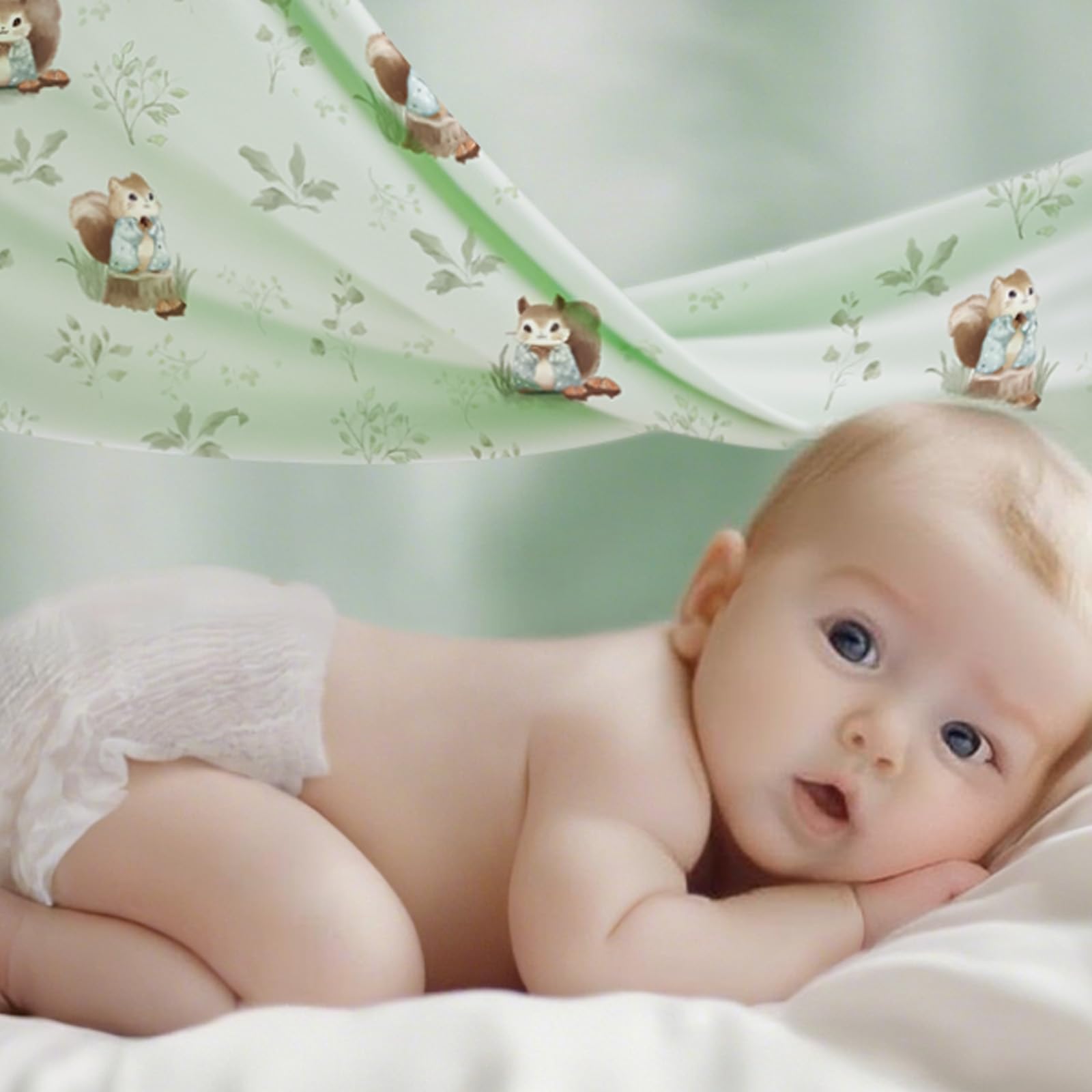 Säugling schläft auf weißer Bettwäsche mit sternförmigen Kissen in der Nähe. Der Text „Mosebears“ ist im Bild sichtbar