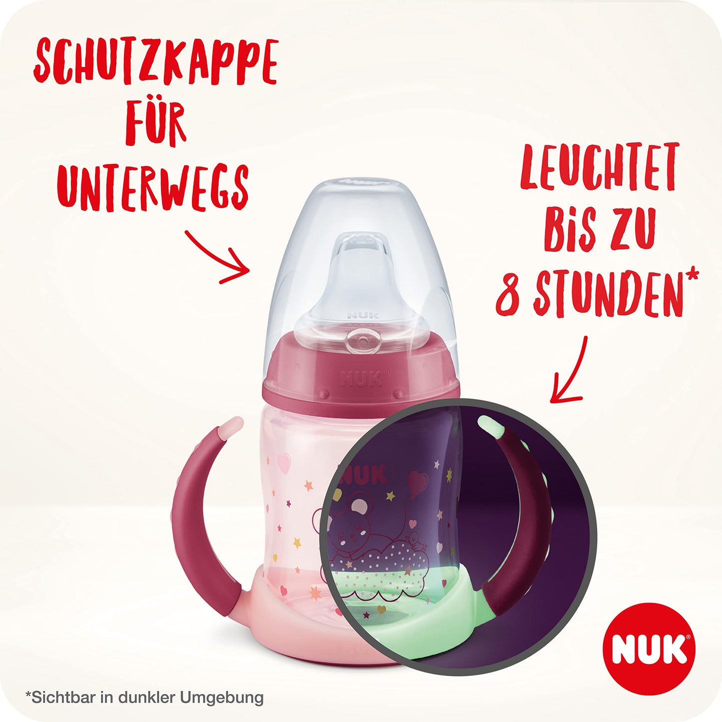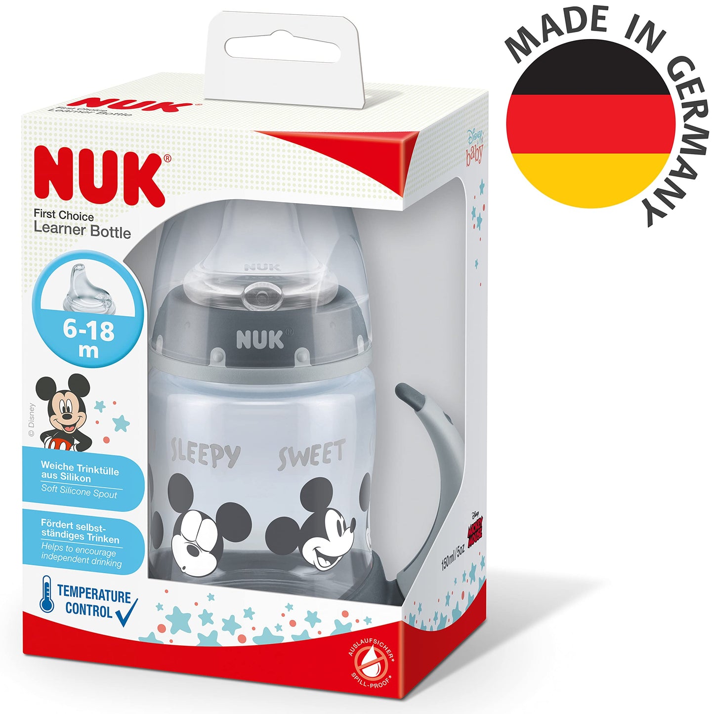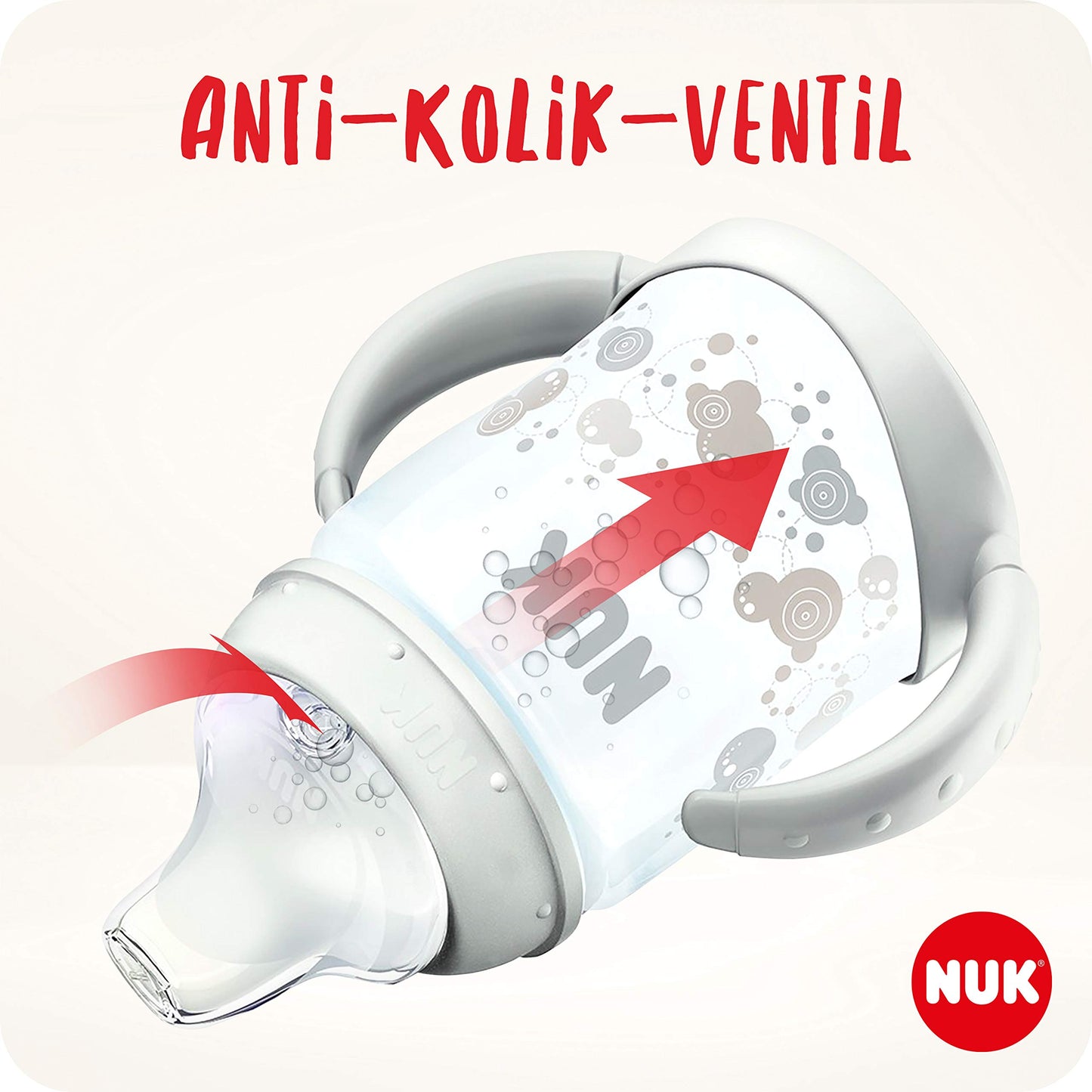 Die NUK First Choice+ Trinklernflasche erleichtert den Übergang zum selbstständigen Trinken. Mit einer extra breiten Lippenauflage, einem innovativen Anti-Colic-Ventil und weichen, ergonomischen Griffen wird das selbstständige Trinken mit der First Choice+ Trinklernflasche zum Kinderspiel. Die integrierte Temperature Control Anzeige ändert die Farbe von blau zu weiß, wenn der Flascheninhalt zu heiß ist. So können Sie sicherstellen, dass die Flüssigkeit Ihres Babys immer die perfekte Trinktemperatur hat. Die auslaufsichere Trinkschnabel ist genau das Richtige für unterwegs und verhindert Kleckern, wenn das Baby selbst trinkt.