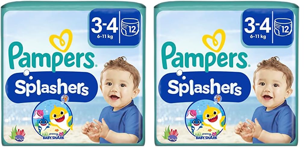 With the Pampers Splashers Swim Nappies, your baby can splash in the water without any worries. Pampers Splashers do not soak up like ordinary nappies and are therefore comfortable to wear both wet and dry. Double leg cuffs fit comfortably around your baby's legs for secure protection against leaks. Therefore, they are ideal for the pool, the beach and much more. The Pampers Splashers are equipped with a unique nappy waistband that stretches all around, so the swim nappies adapt like a swim trunks and are easy to put on and take off - even when wet. In addition, the Pampers Splashers can be quickly removed and changed due to the tearable sides. With the water-inspired motifs, they look like real swimwear. With Pampers Splashers, a day at the pool is even more fun.