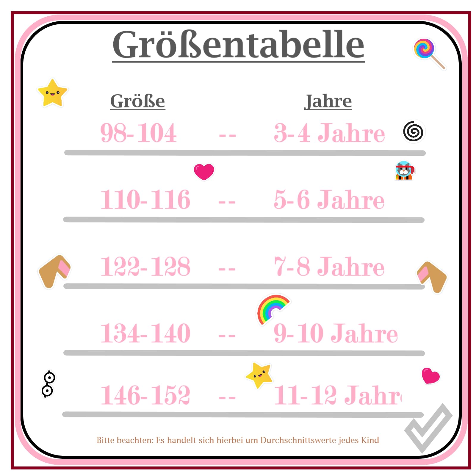 • Mädchen Grössen: 3-4 Jahre (98-104), 5-6 Jahre (110-116), 7-8 Jahre (122-128), 9-10 Jahre (134-140), 11-12 Jahre (146-152), 13-14 Jahre (158-164)