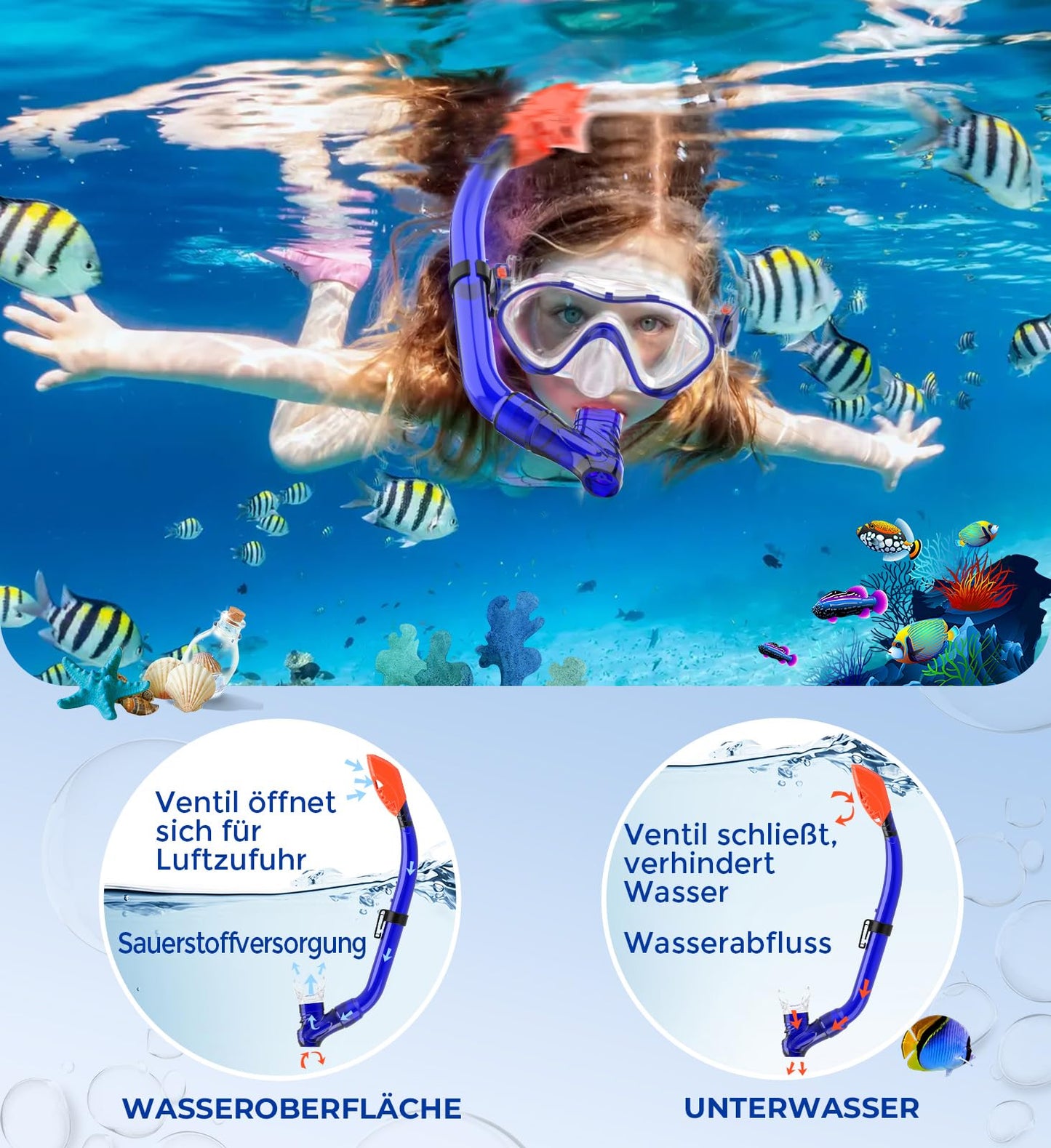• Sporzin The comprehensive and practical snorkel set children are subjected to rigorous tests to ensure quality and friendly service. If you want your child to have fun snorkelling or are looking for equipment for swimming lessons, this diving goggles anti-fog children's snorkel set 8 years for children is just the thing for you! Immerse yourself in the extraordinary seabed and discover the beauty under the waves like never before.