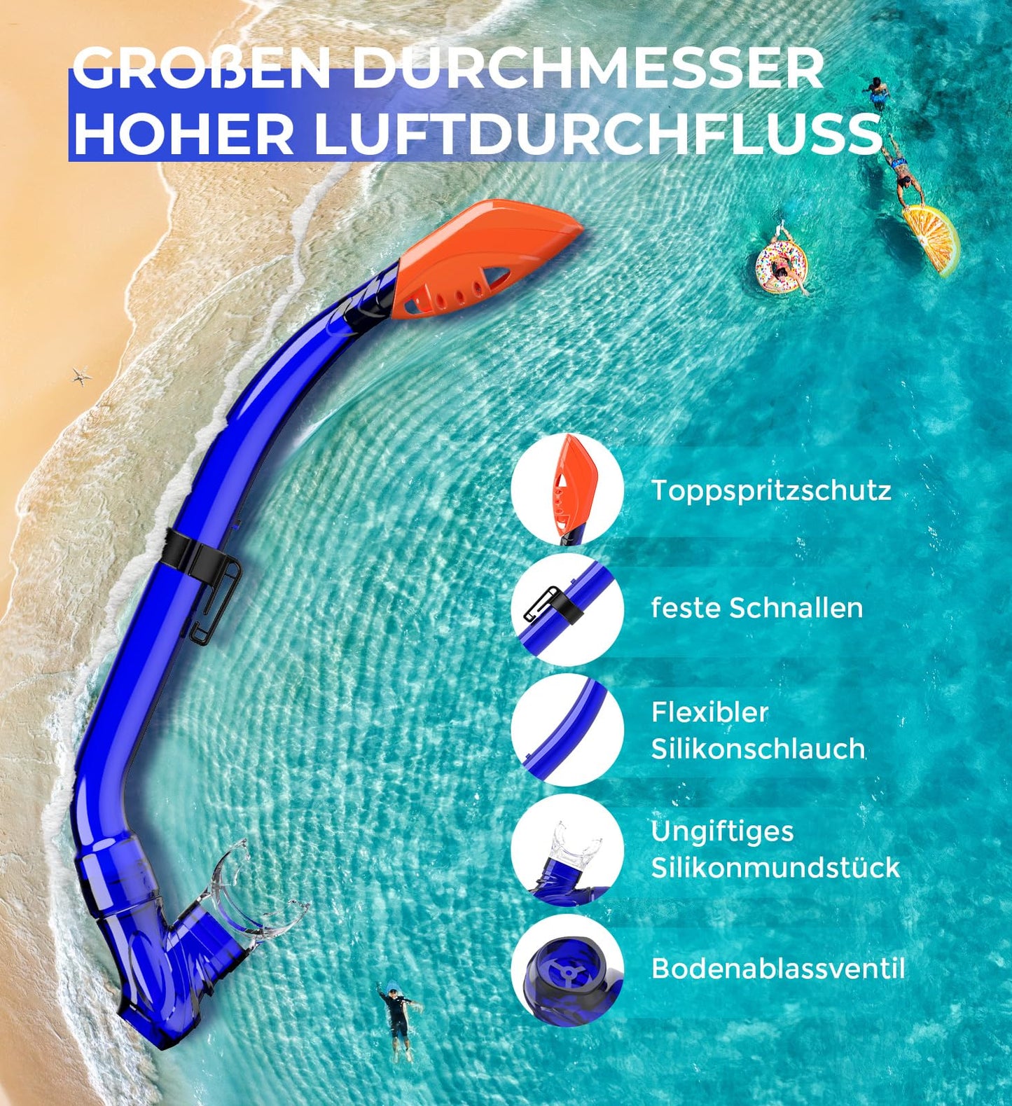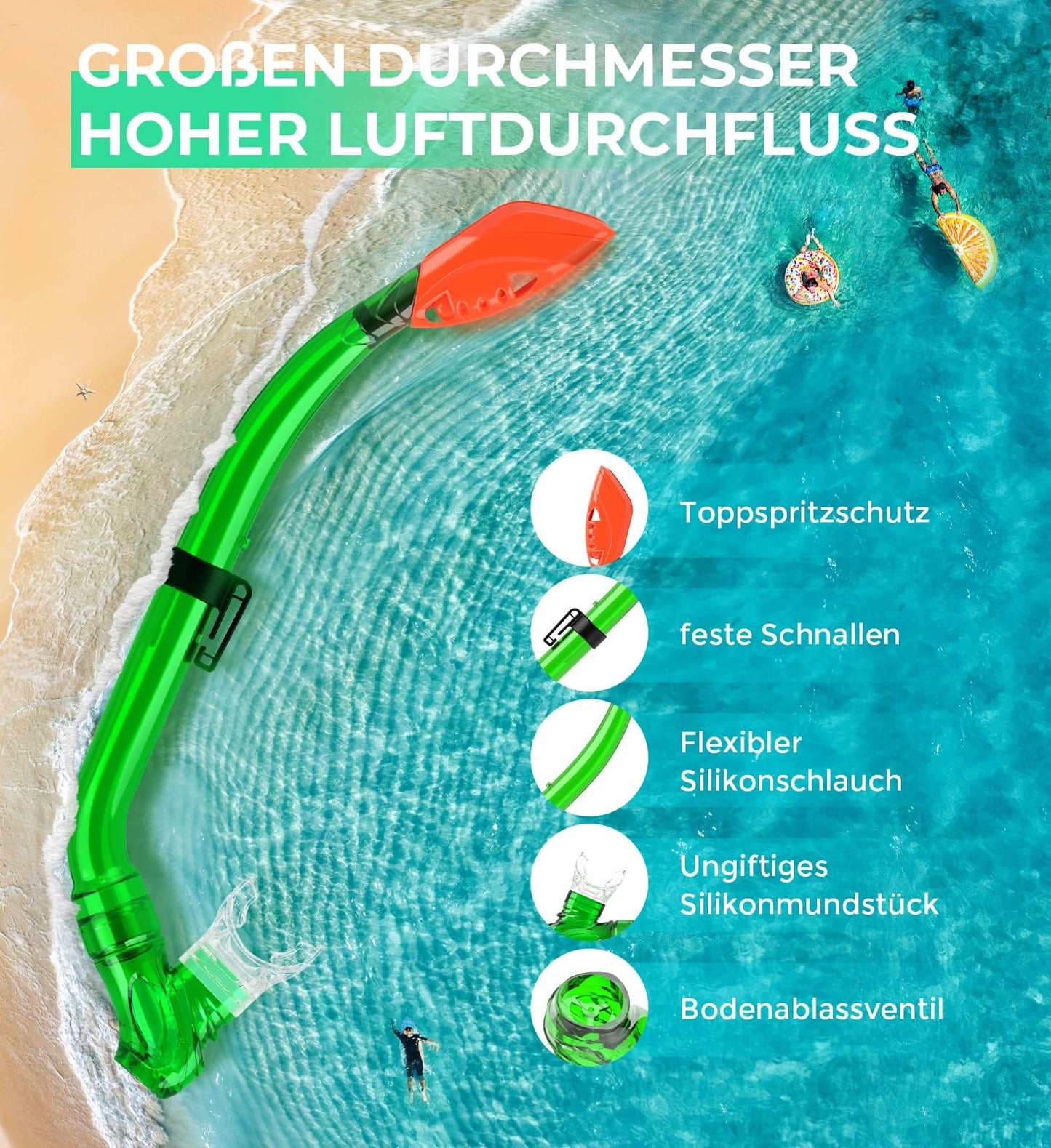 • Children's diving goggles with snorkel with excellent air flow - With its large diameter, the Sporzin snorkel ensures optimal air flow. The children's snorkel has an upper splash guard and a lower drain valve. Beginners can enjoy clear, unhindered breathing even in restless water or turbulent conditions. Provides maximum comfort and freedom when exploring.